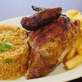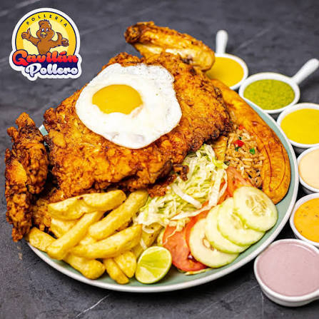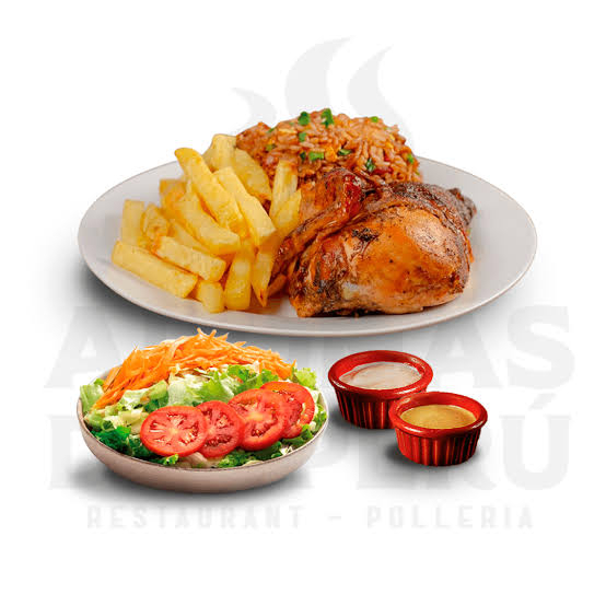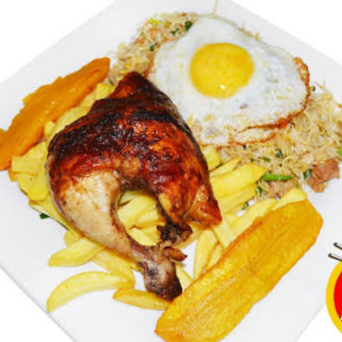 1/4 pollo + papas + chaufa + huevo+ plátano + ensalada + cremas