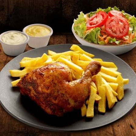 1/4 pollo + papas + ensalada+ salchicha + cremas