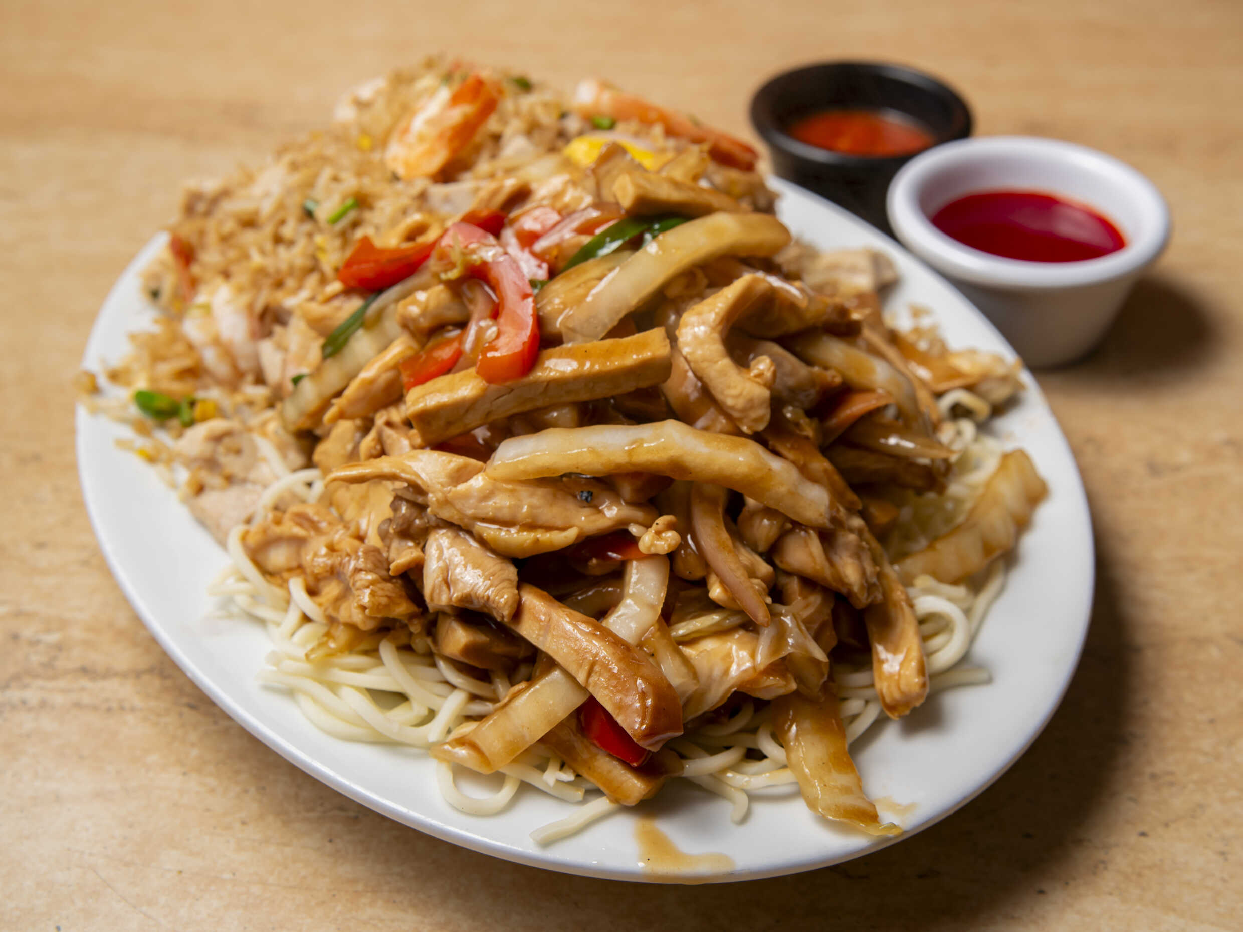 Pollo, chancho, langostinos, tallarín chino y arroz chaufa.