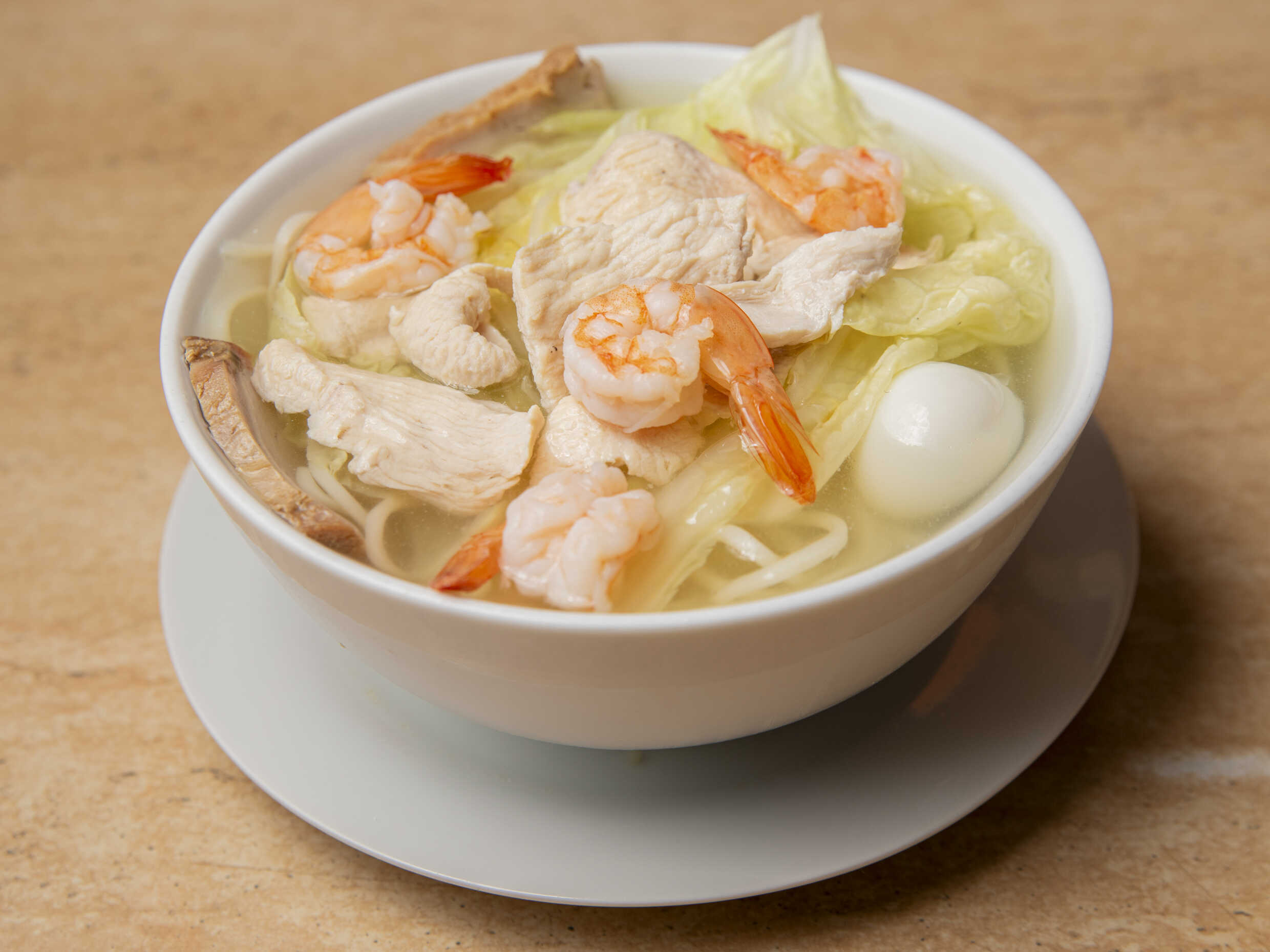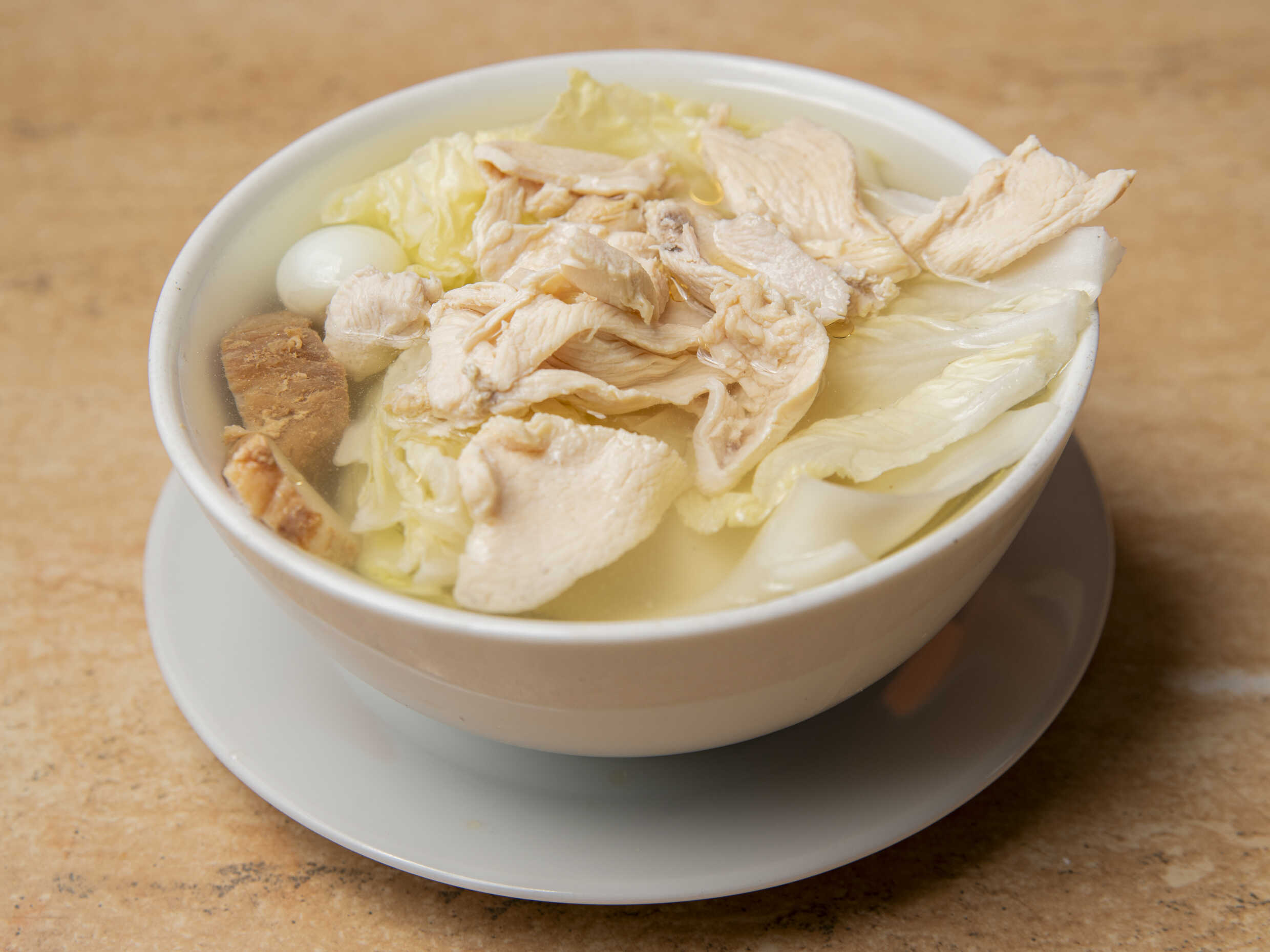 Sopa wantan, pollo, chancho, kion, col y huevo de codorniz.