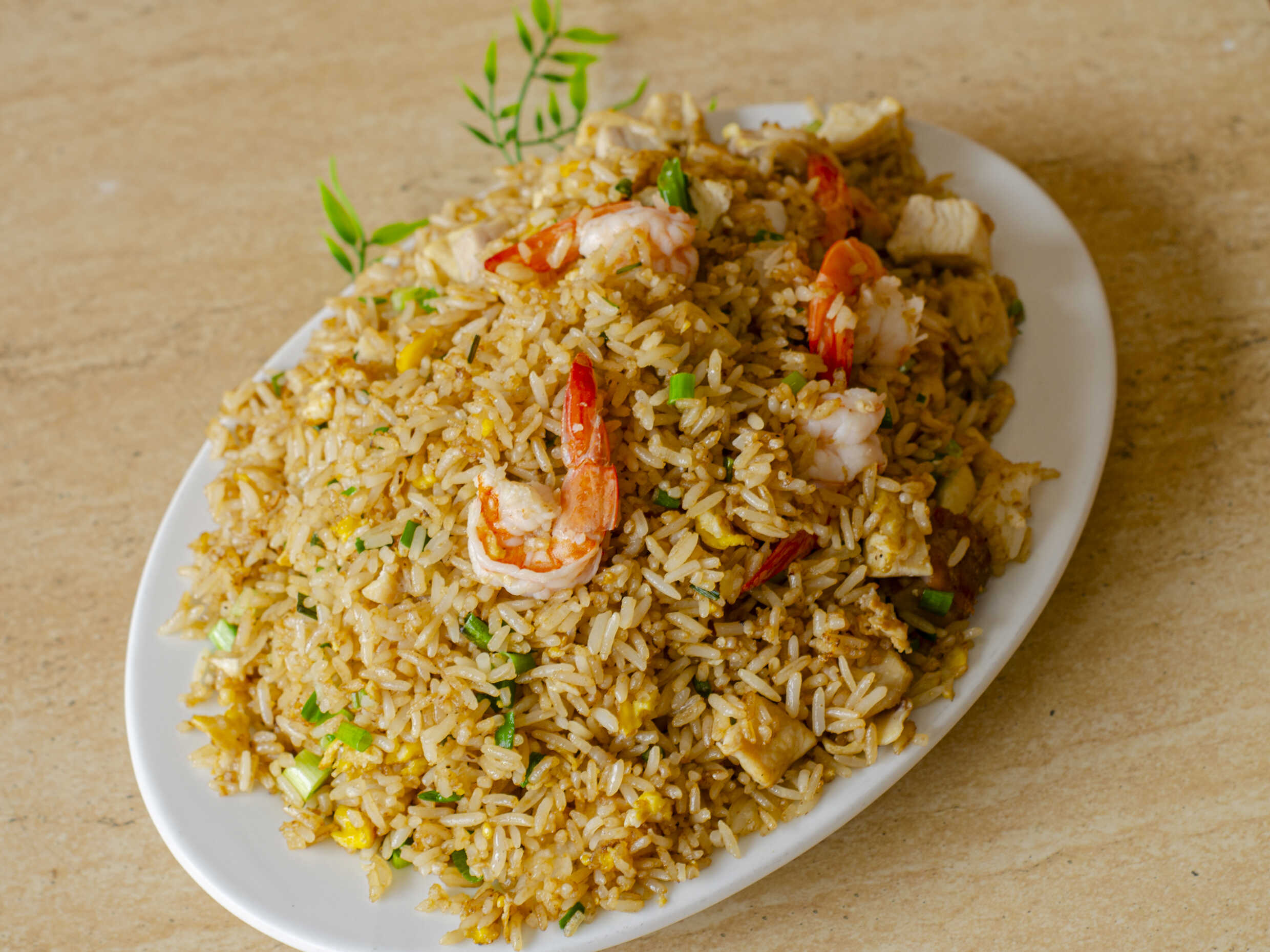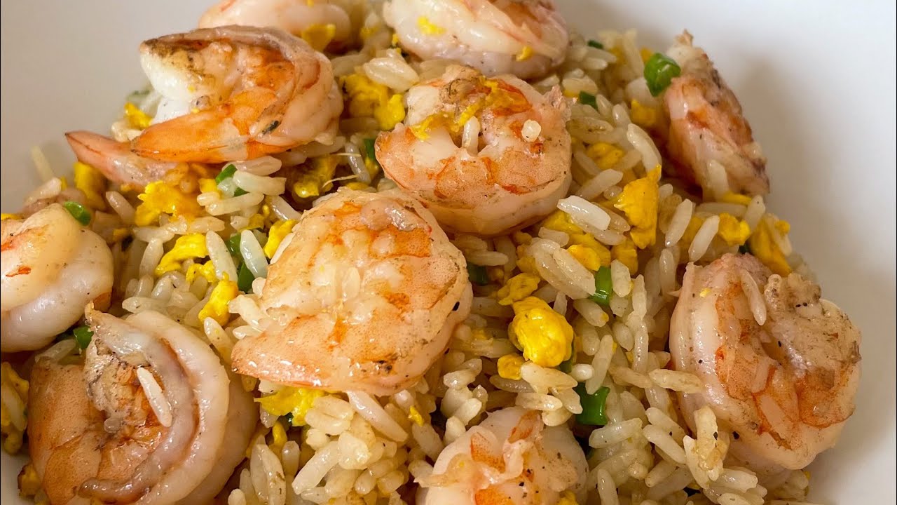 Arroz chaufa , langostinos, cebolla china y especias