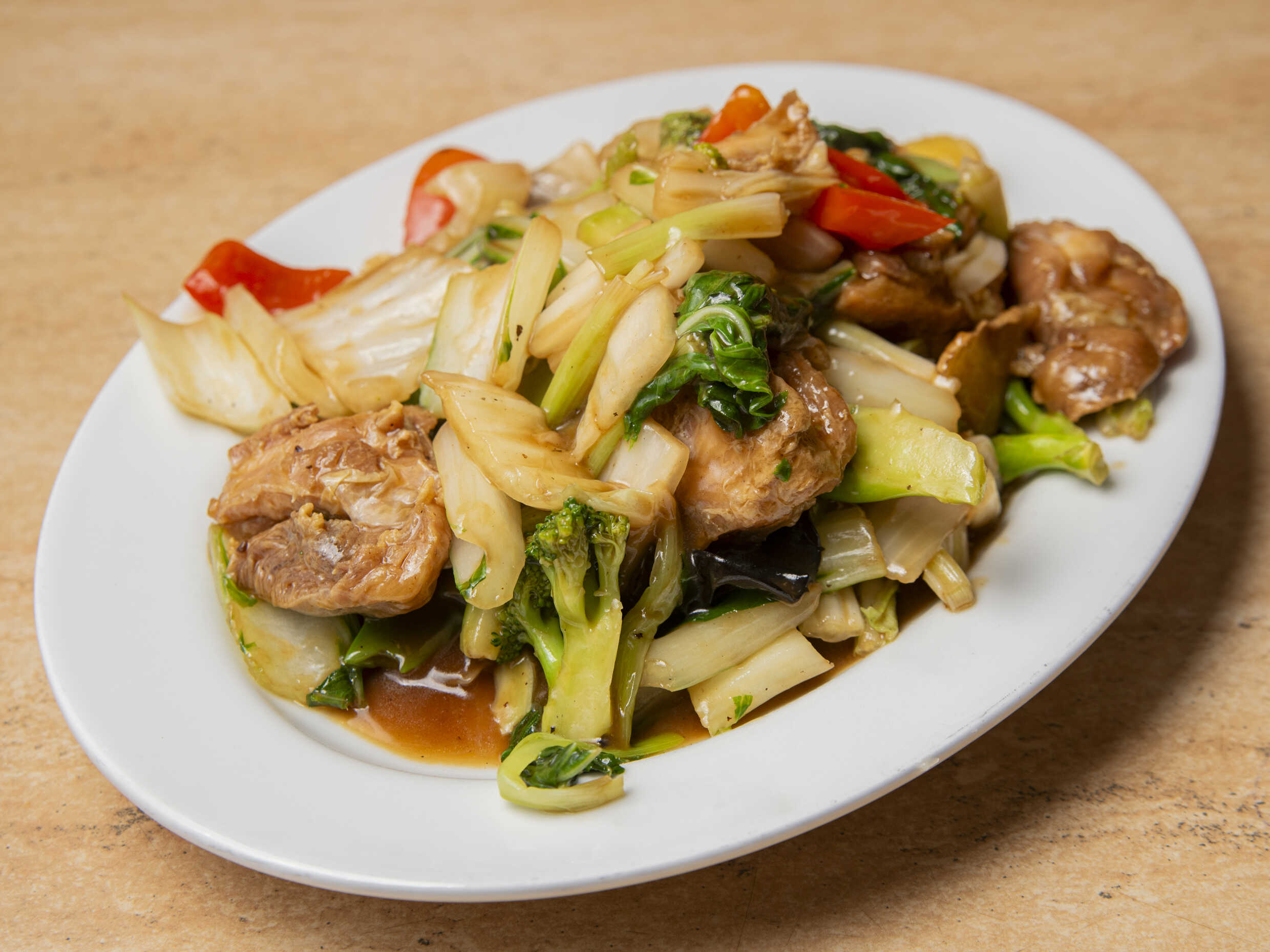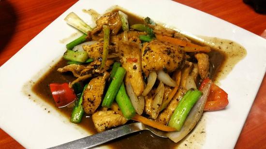 Pollo, espárragos, salsa de ostión y especias orientales.