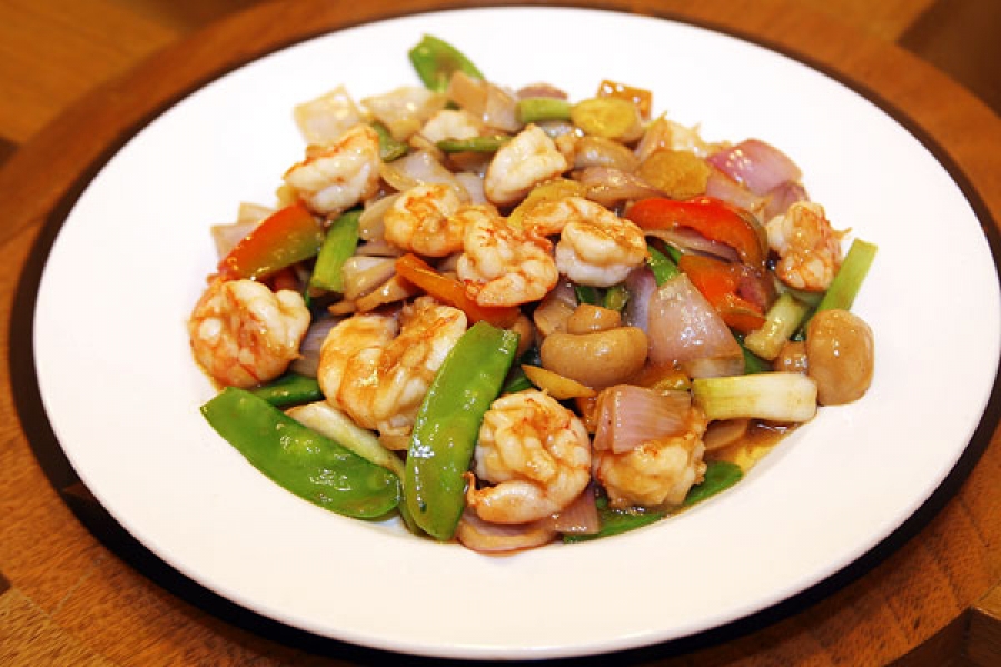 Langostinos, verduras salteadas y especias orientales.