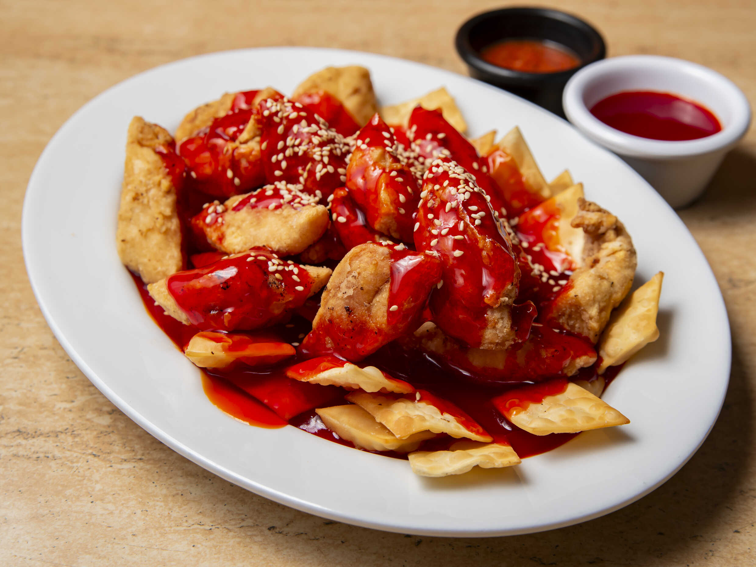 Wantan frito relleno de chancho, con tamarindo