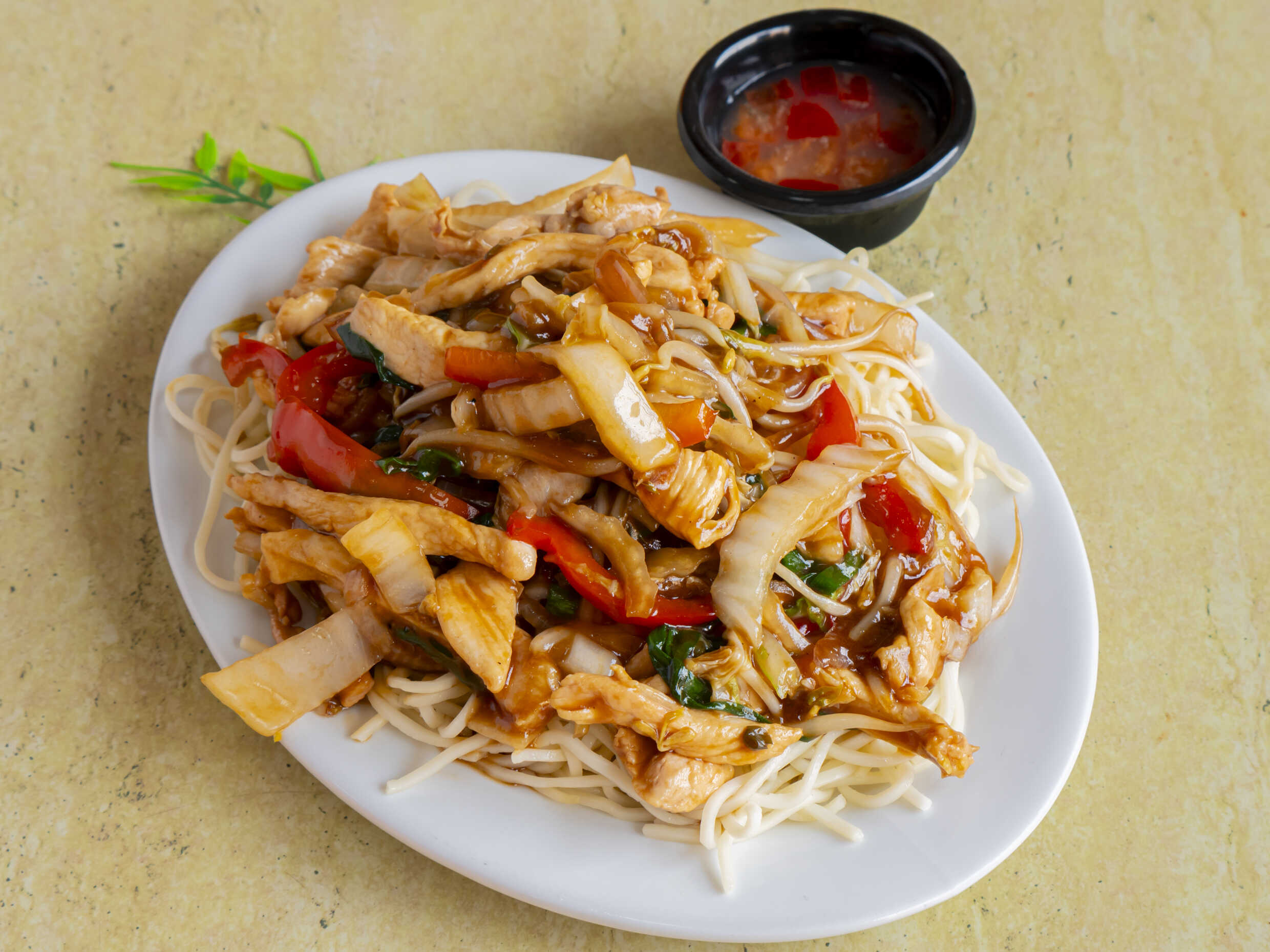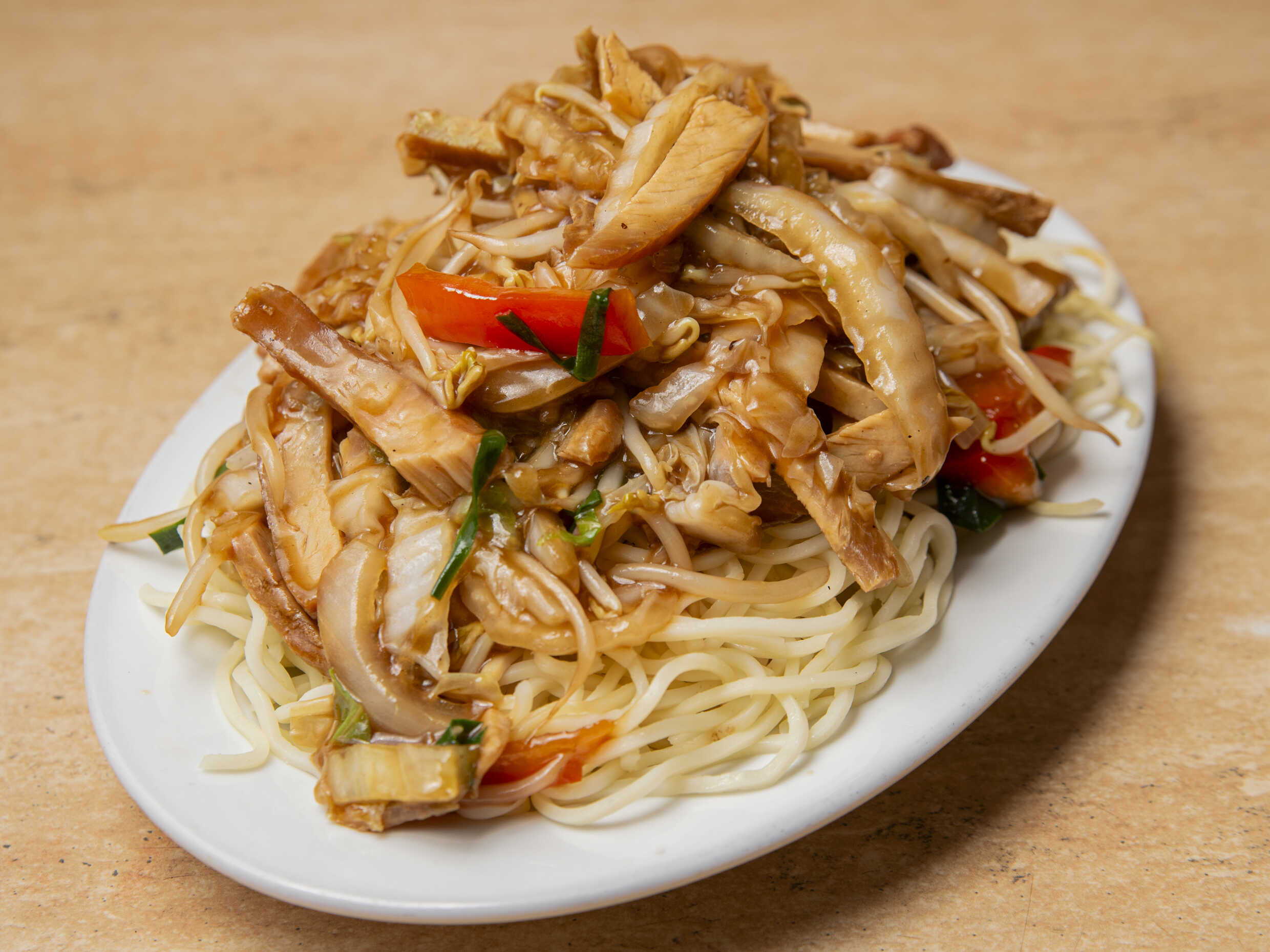 Tallarín saltado chino, pollo en trozos y verduras.