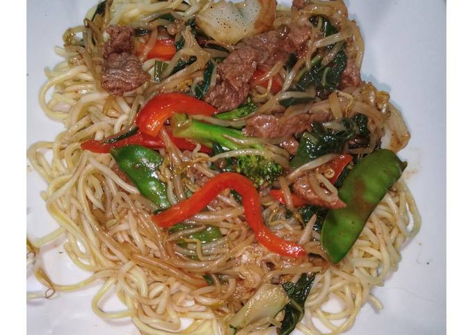 Tallarín saltado chino, carne trozada y verduras.
