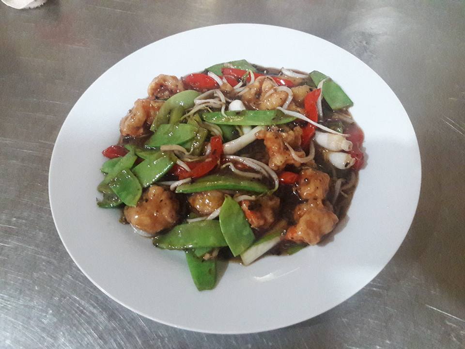 Langostinos, verduras y salsa tausi