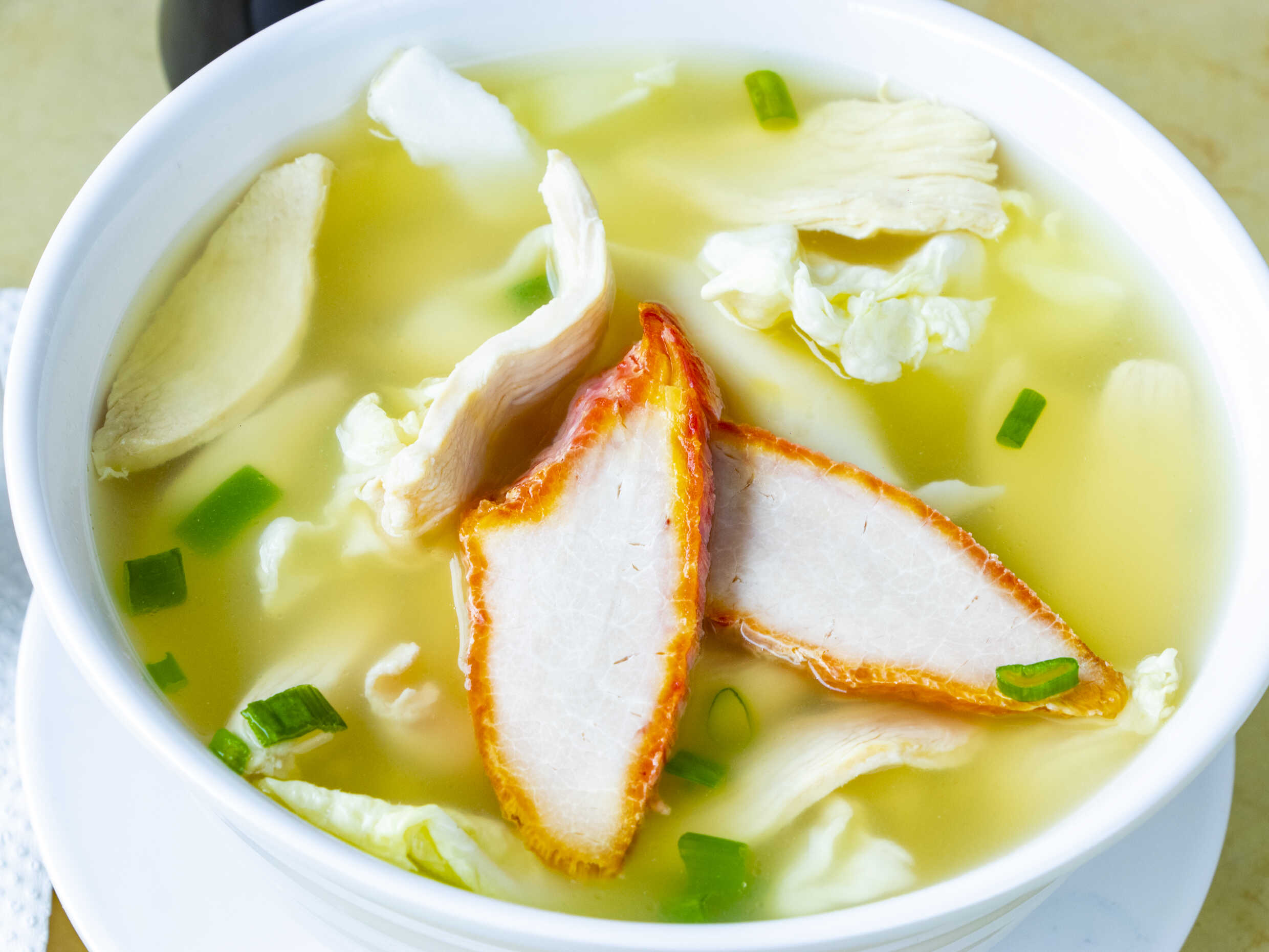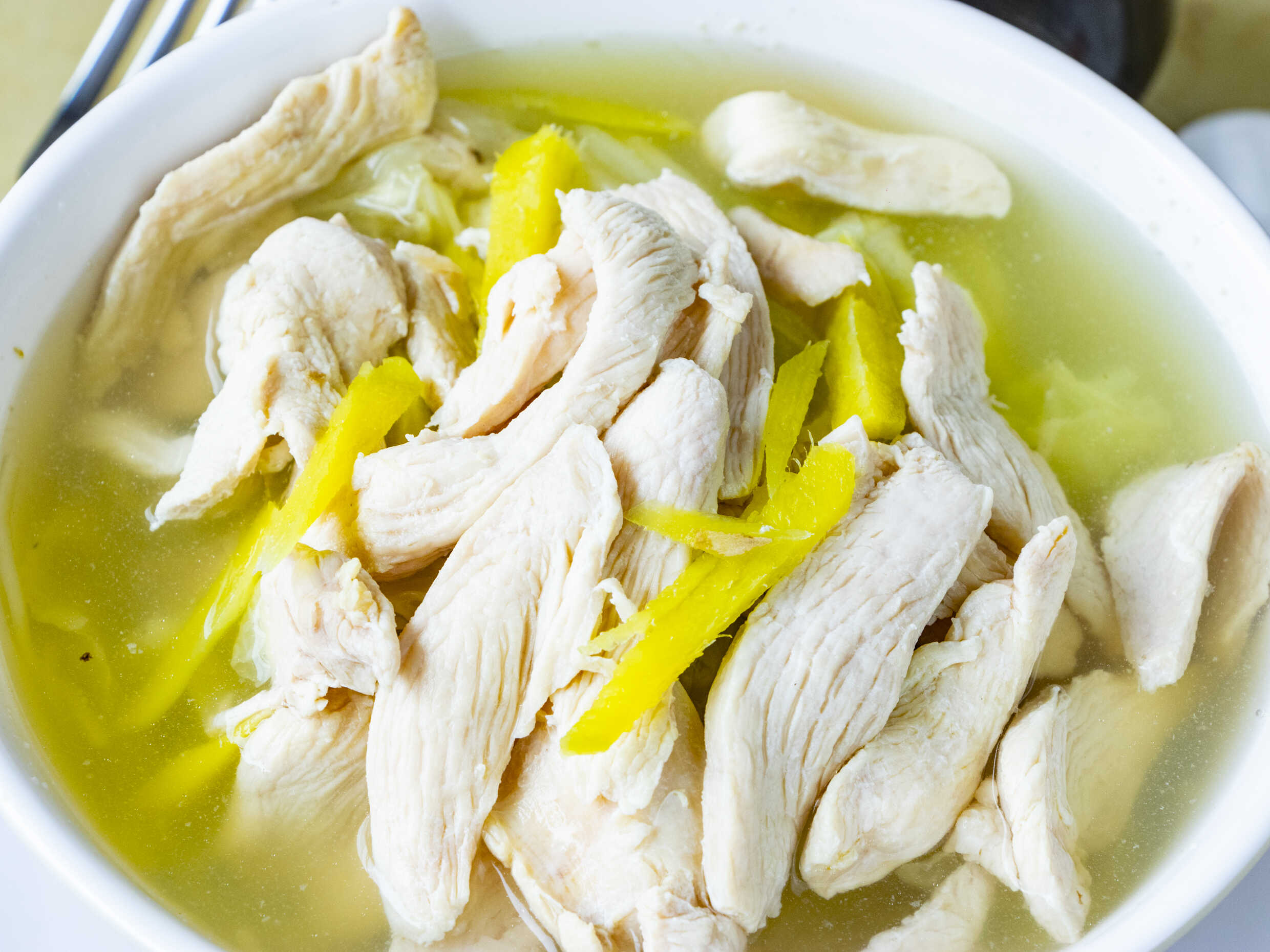 Caldo con pechuga de pollo, fideo chino de arroz.