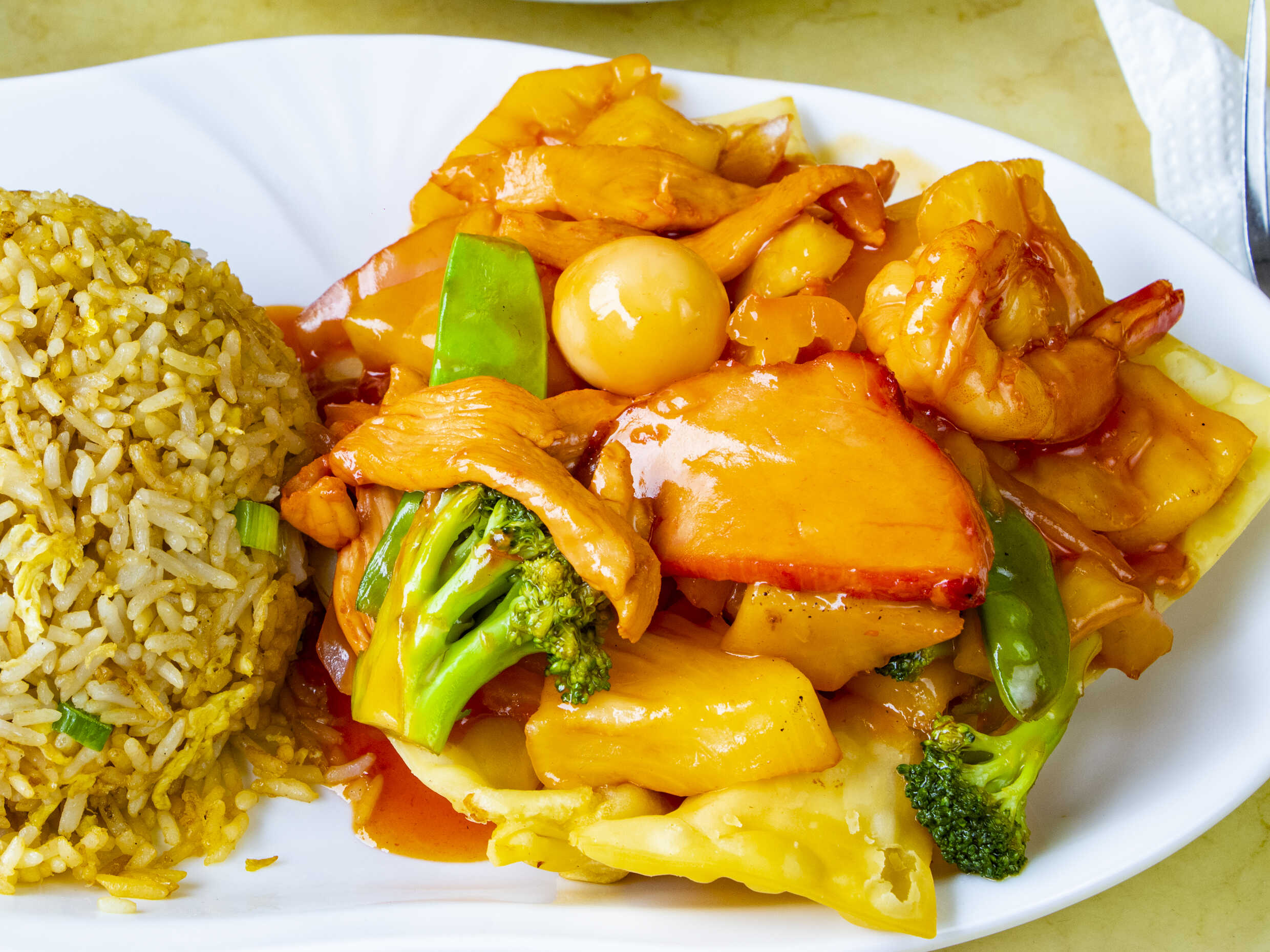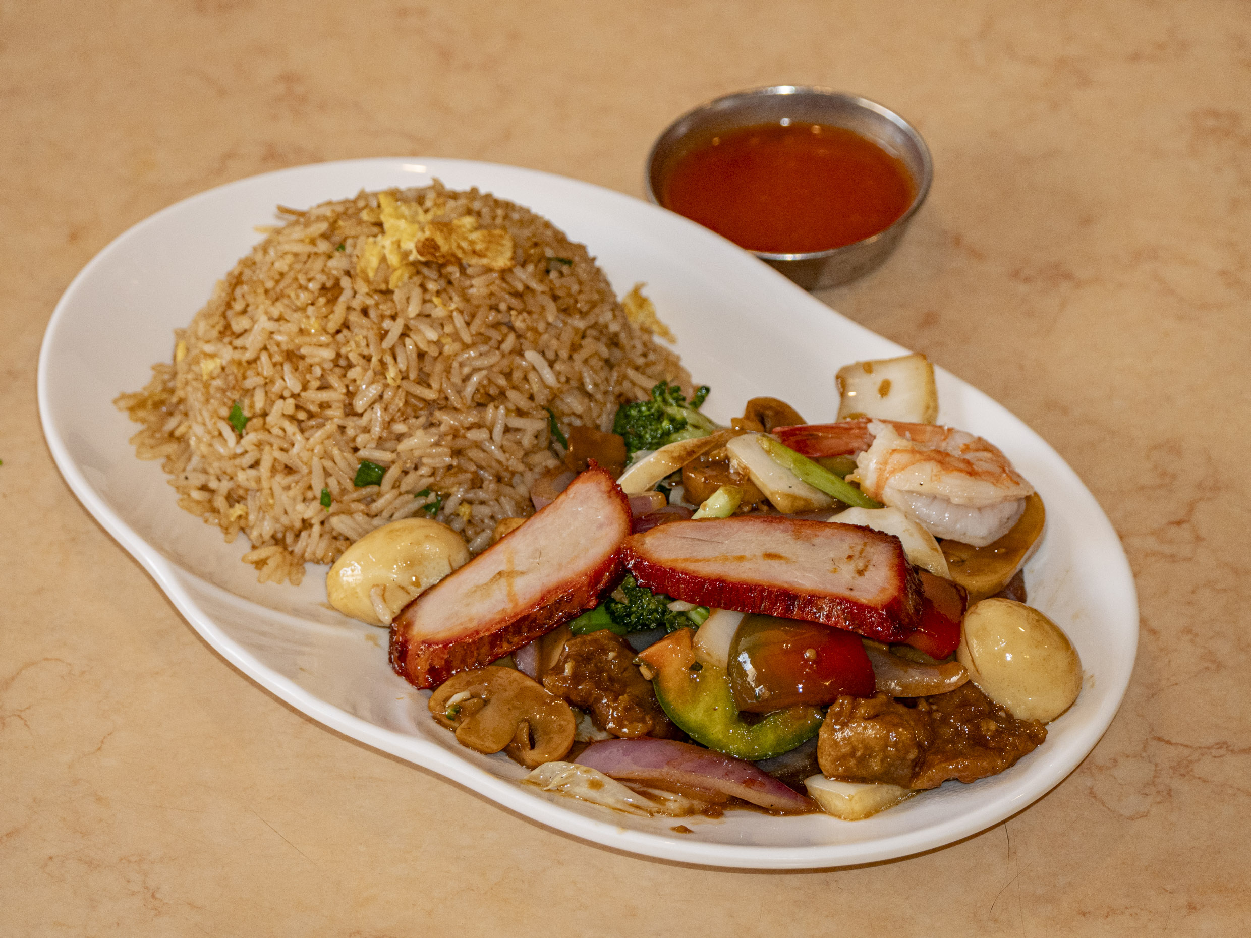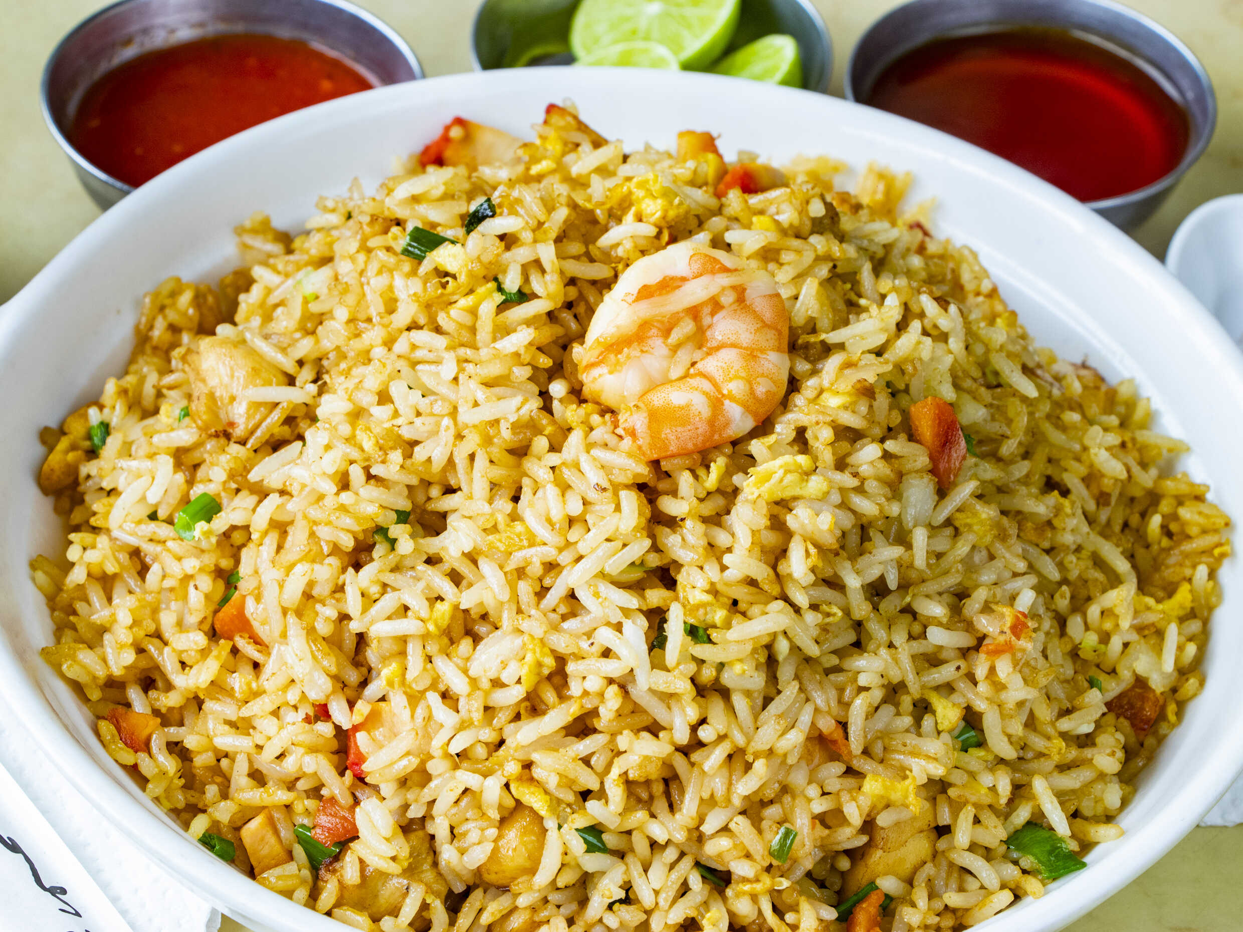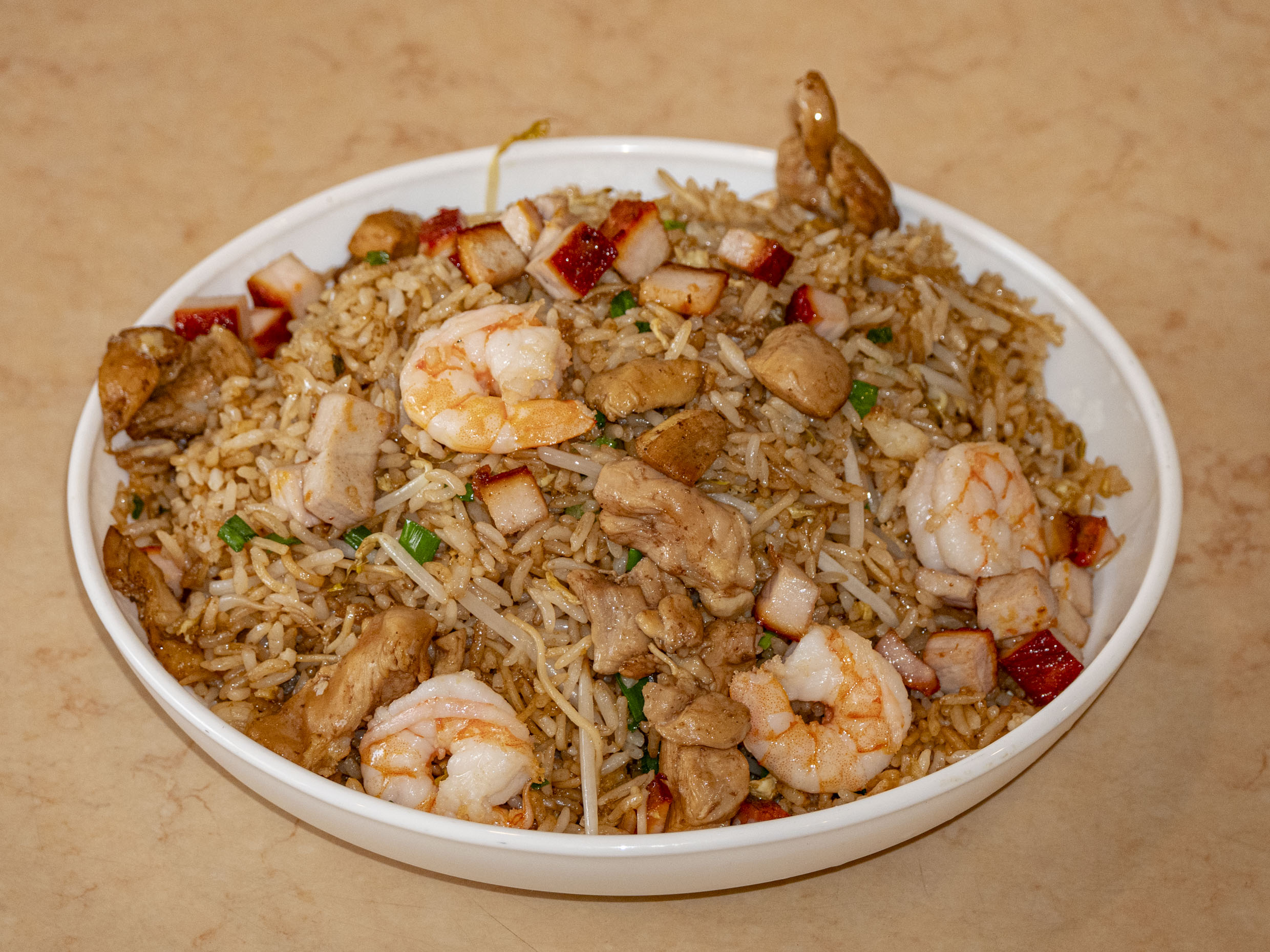 Chaufa de pollo, chancho asado y langostino.