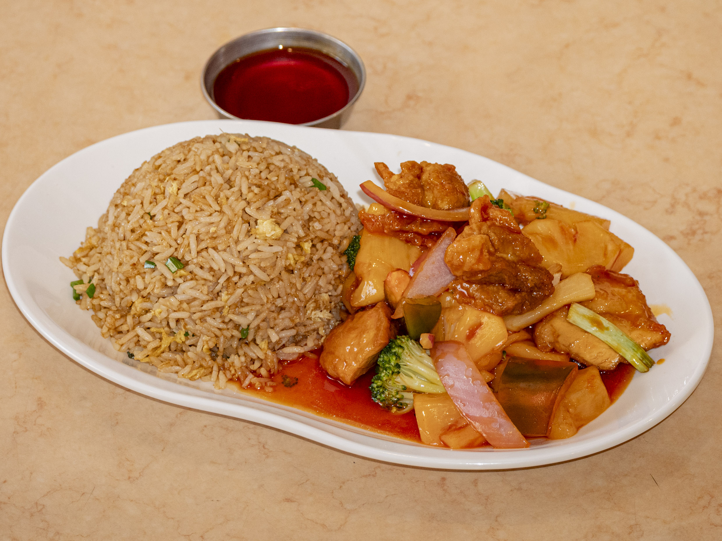 Pollo en trozo con piña y salsa tamarindo acompañado con su arroz chaufa.