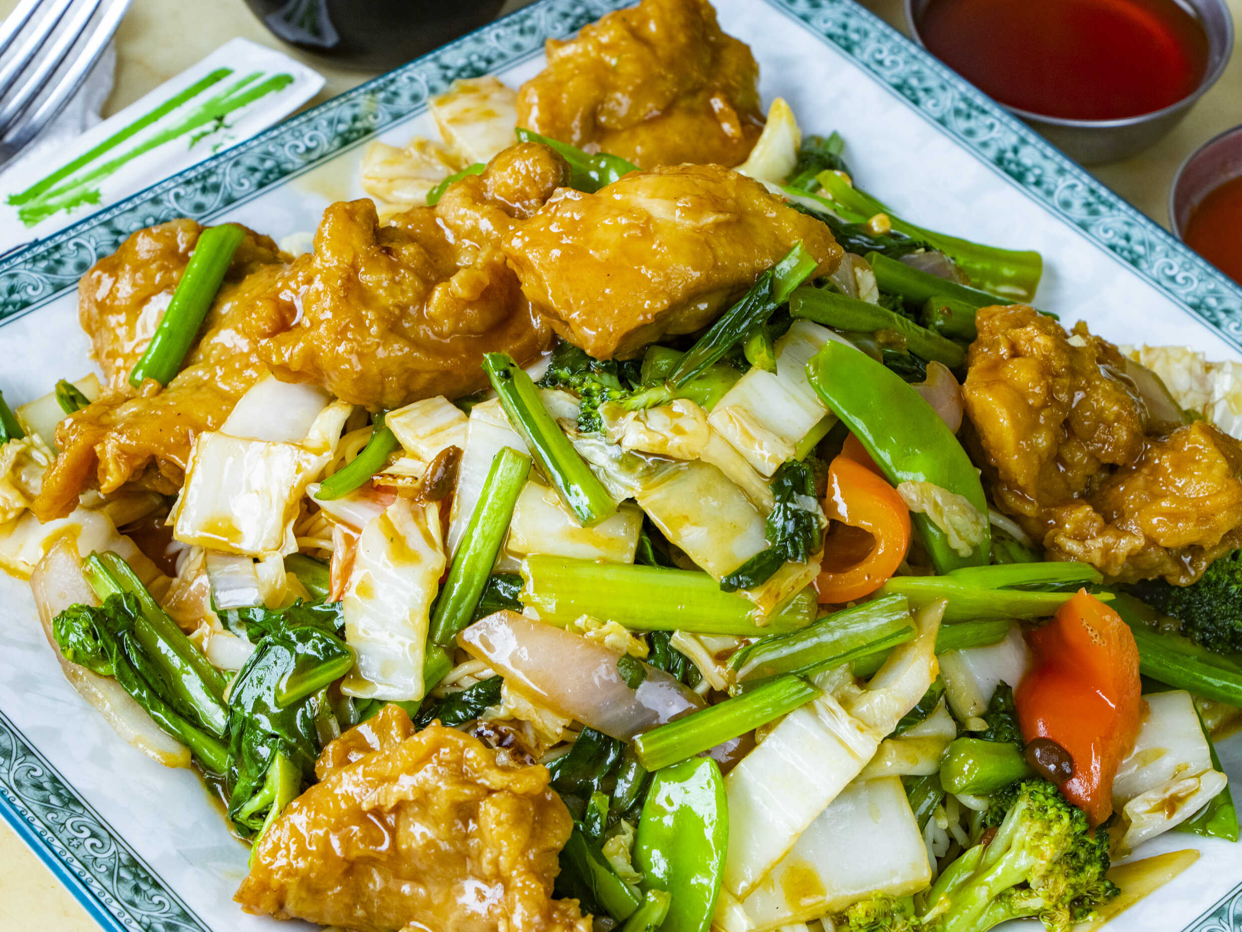 Pollo chijaukay empanizado frito con salsa ostión.