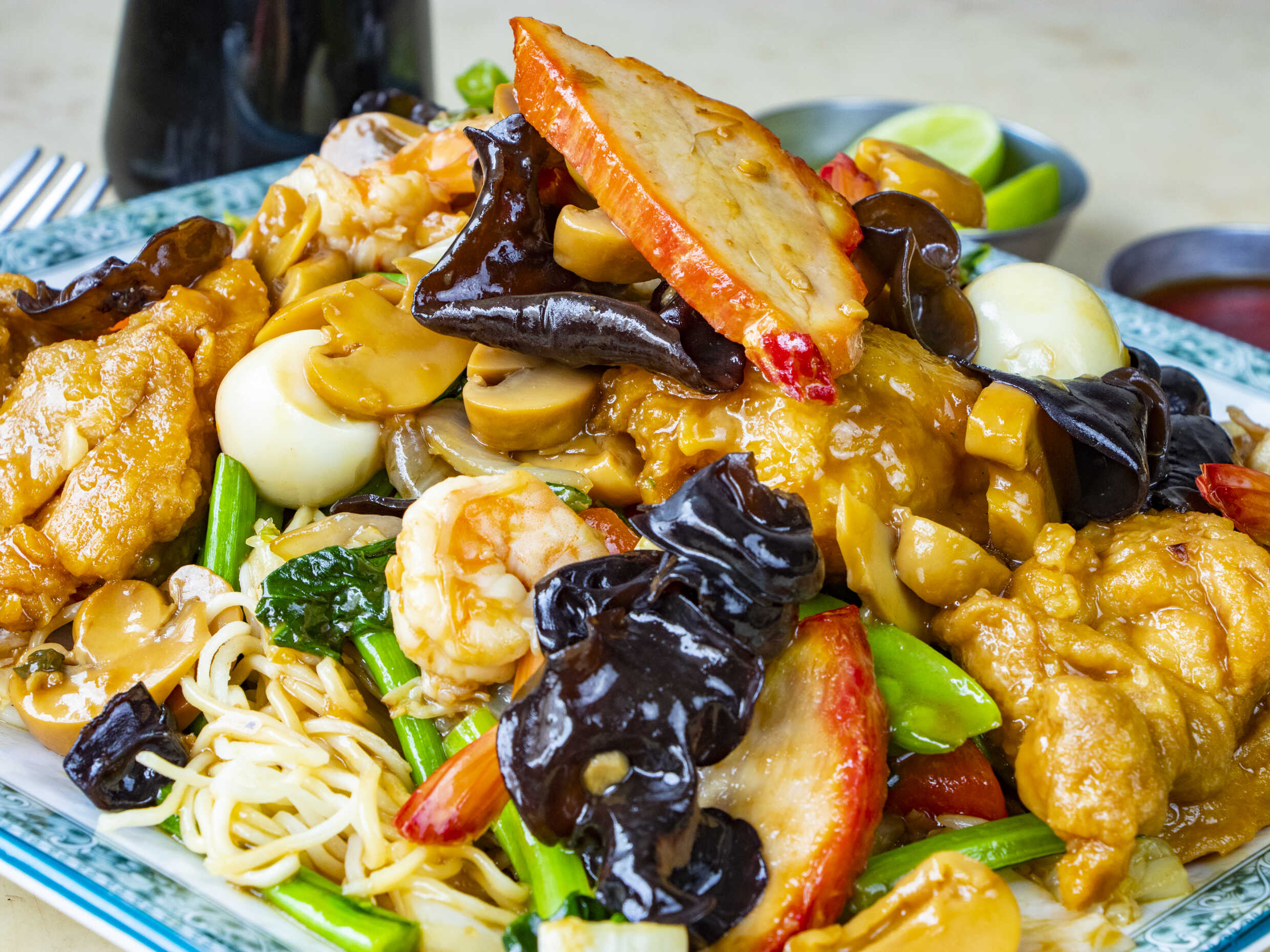 Tallarín taypá de pollo, chancho asado, res, langostino, huevos y champiñones.