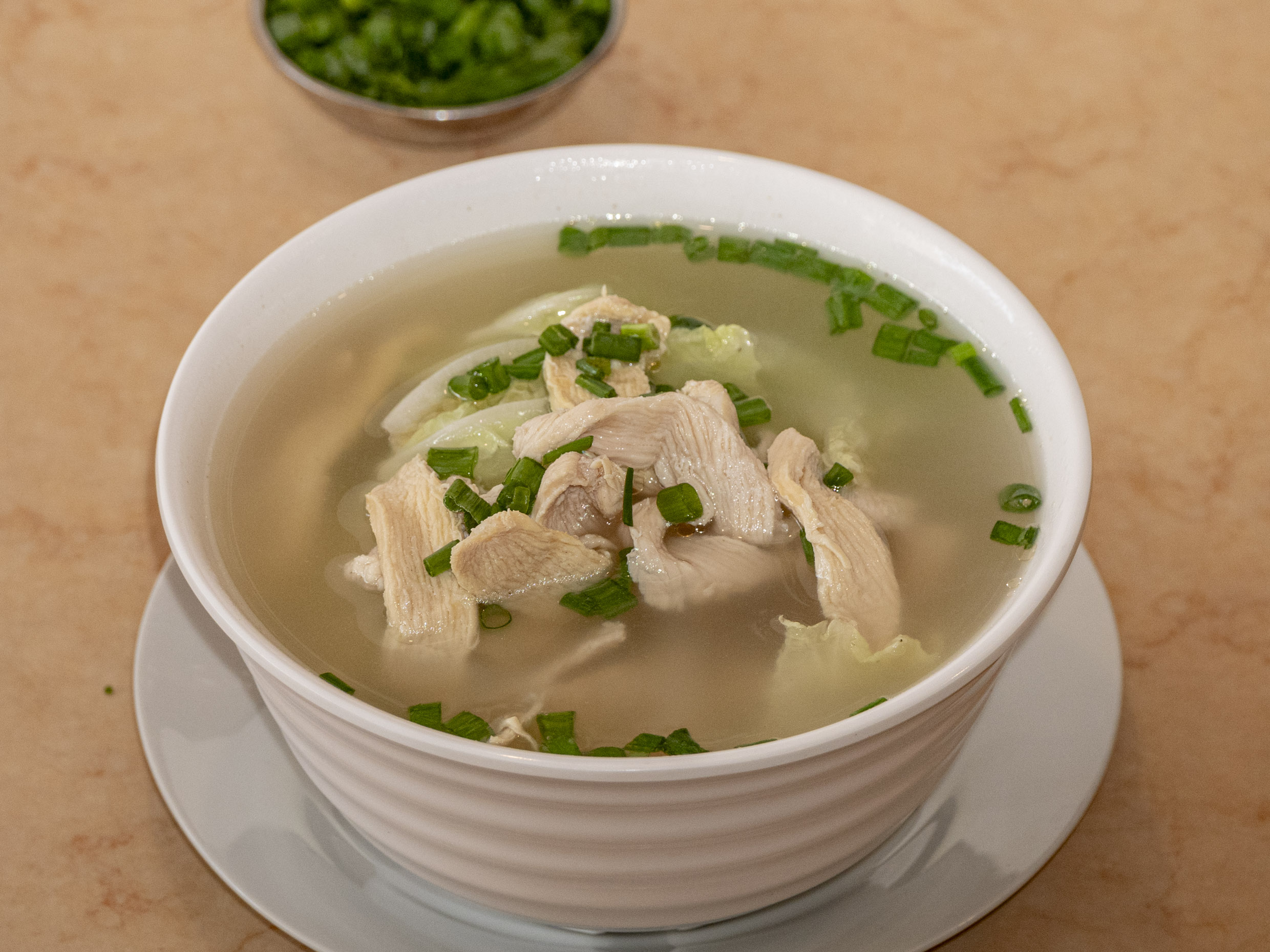 Caldo de Pollo con Kion y Tallarín