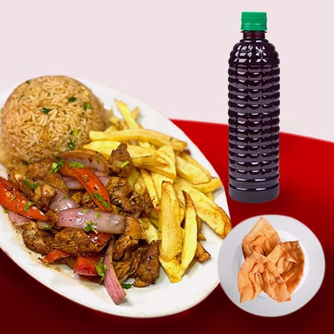 Pollo saltado con papas fritas + chaufa + 3 unidades de wantan + botella de chicha 330 ml.