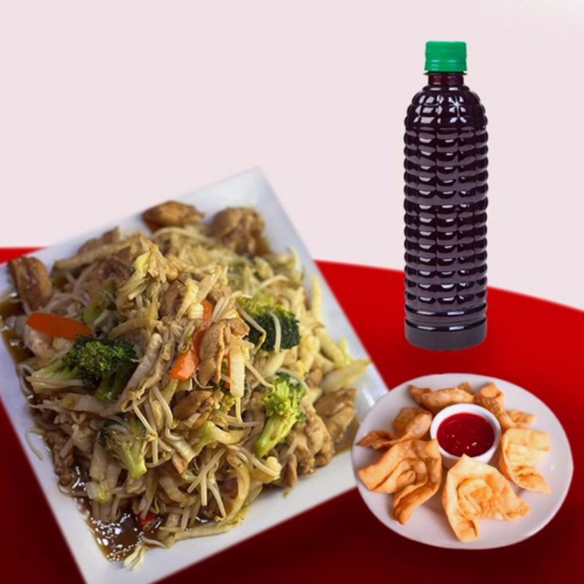 Tallarín de pollo tamaño carta + 6 unidades de wantan + botella de chicha 1 Lt.