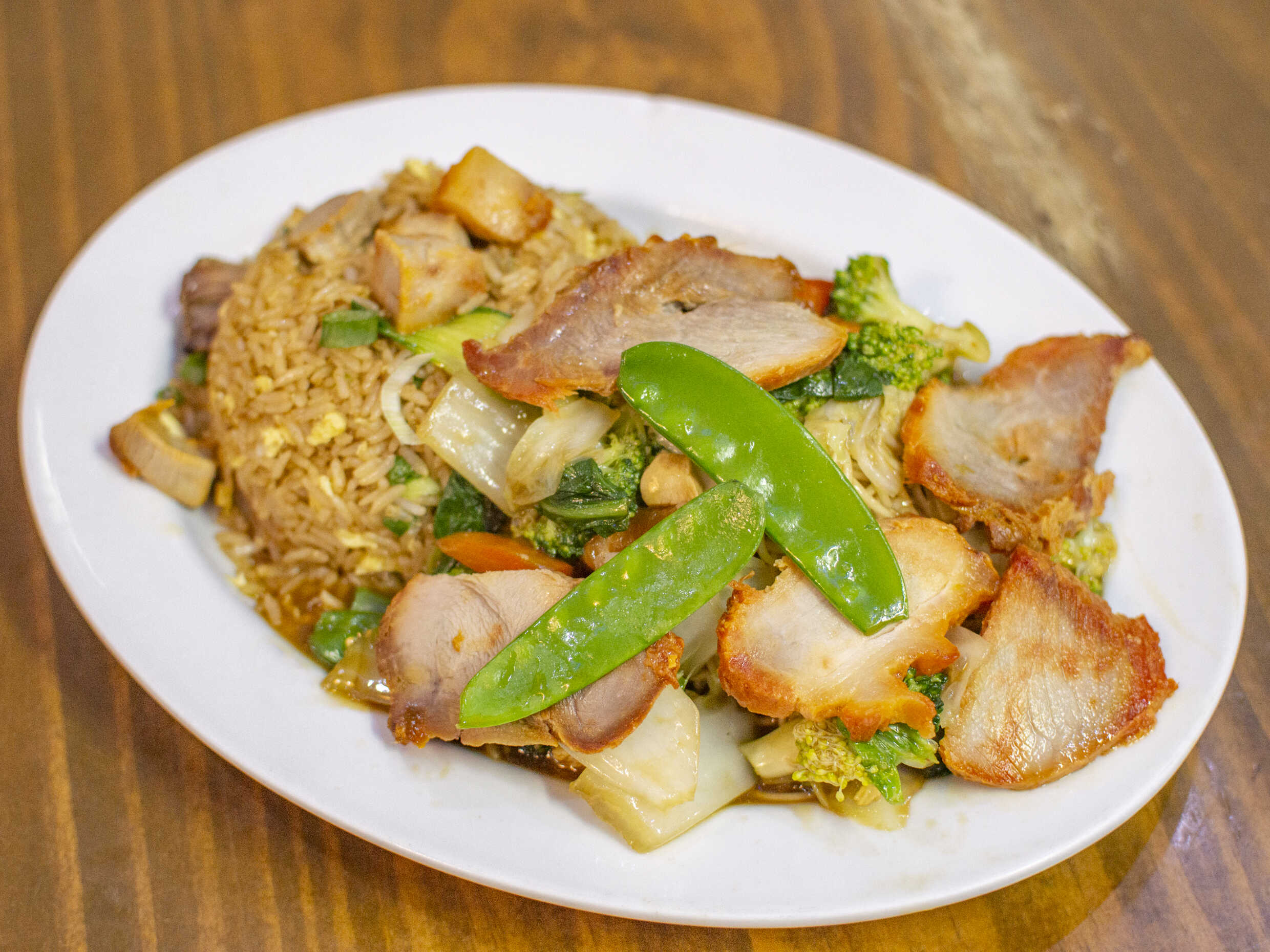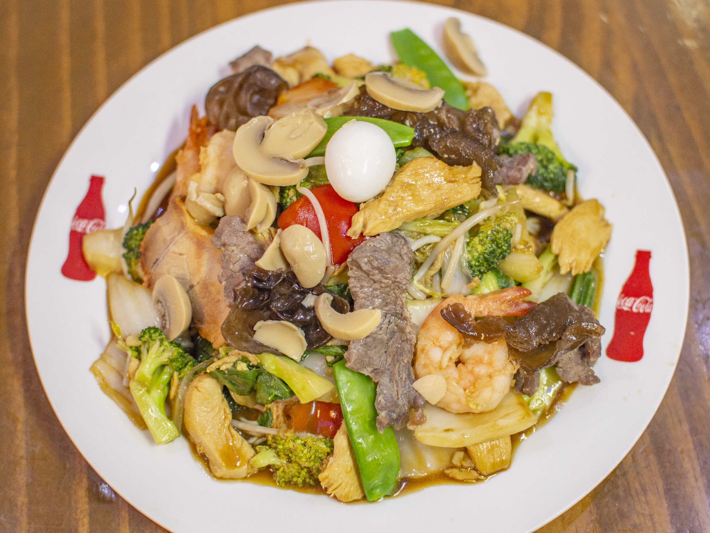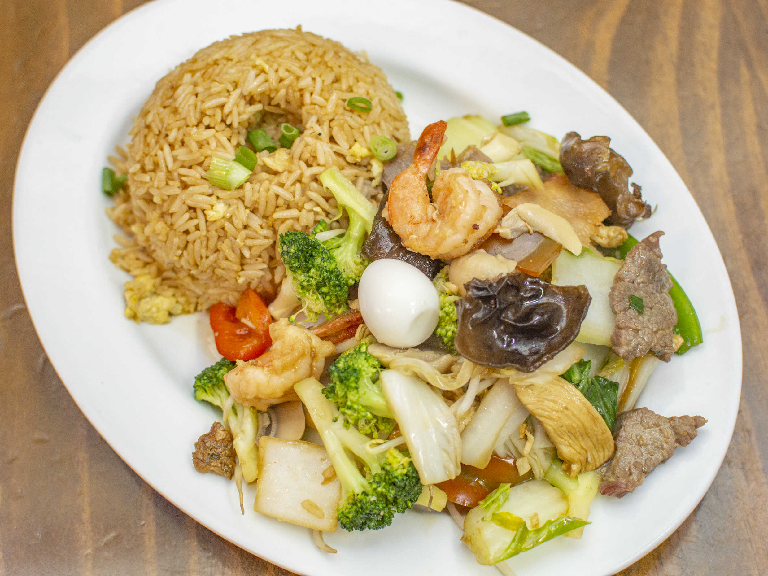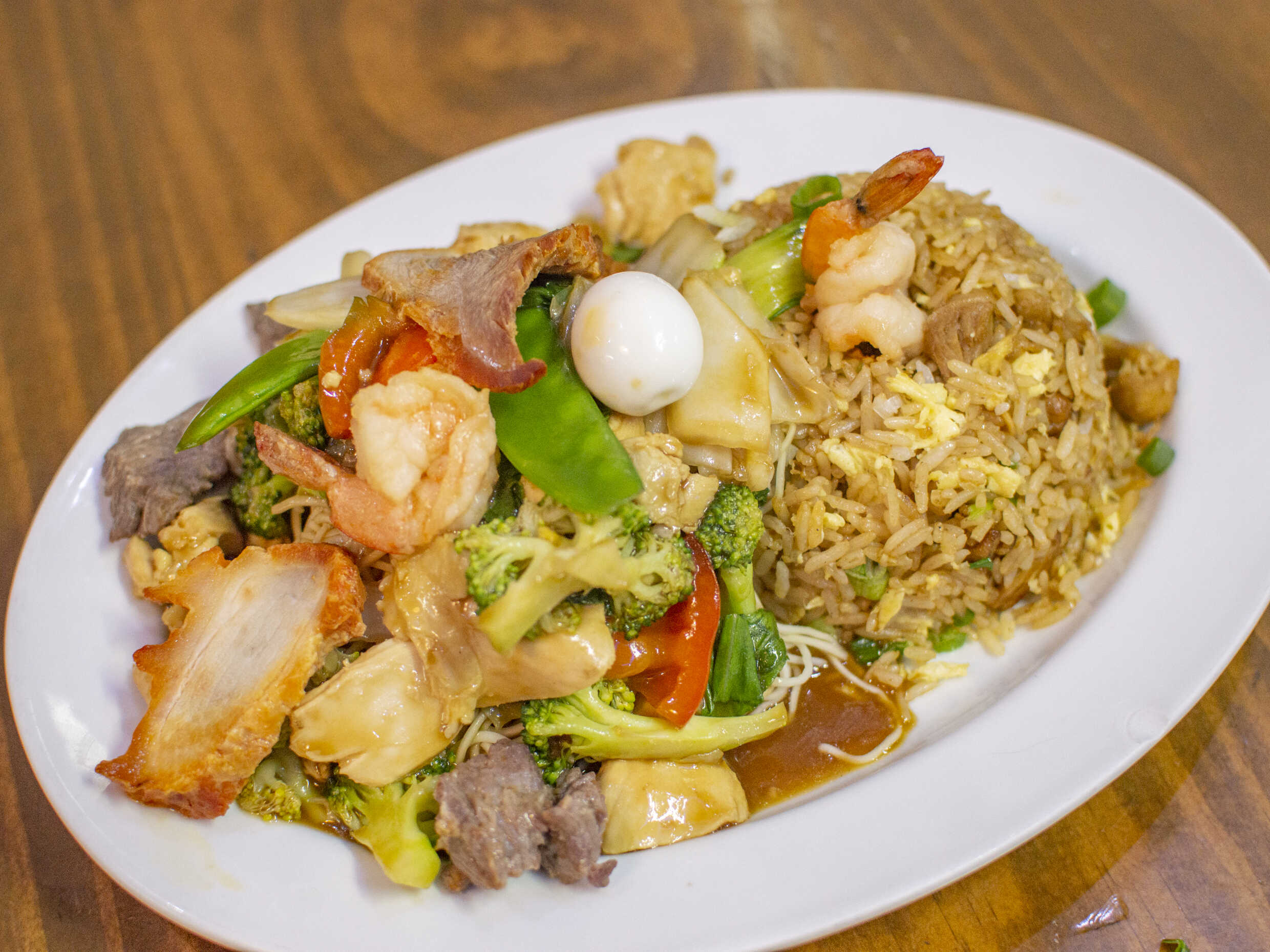 pollo, chancho, carne y langostinos salteados con todas las verduras con arroz chaufa