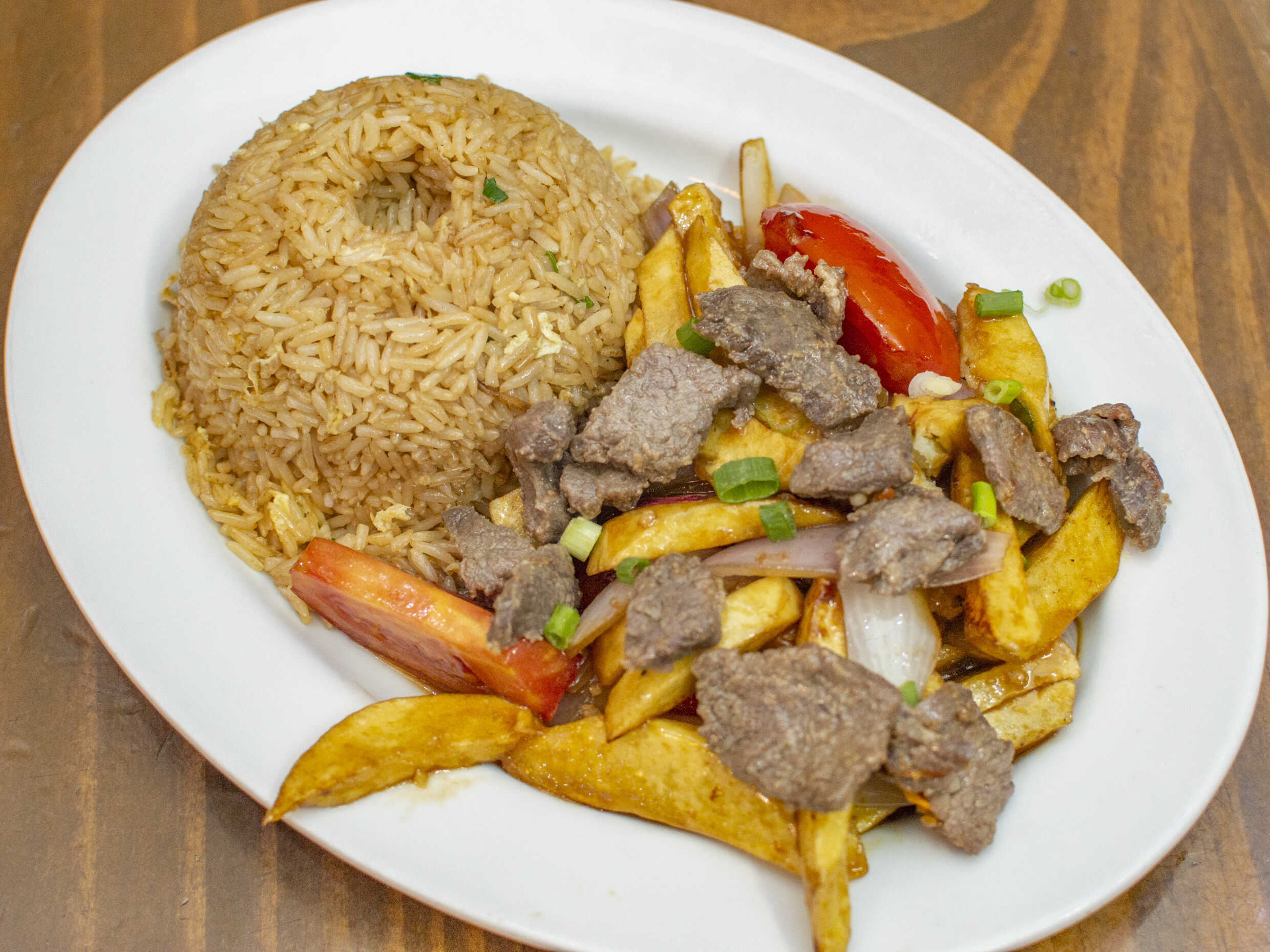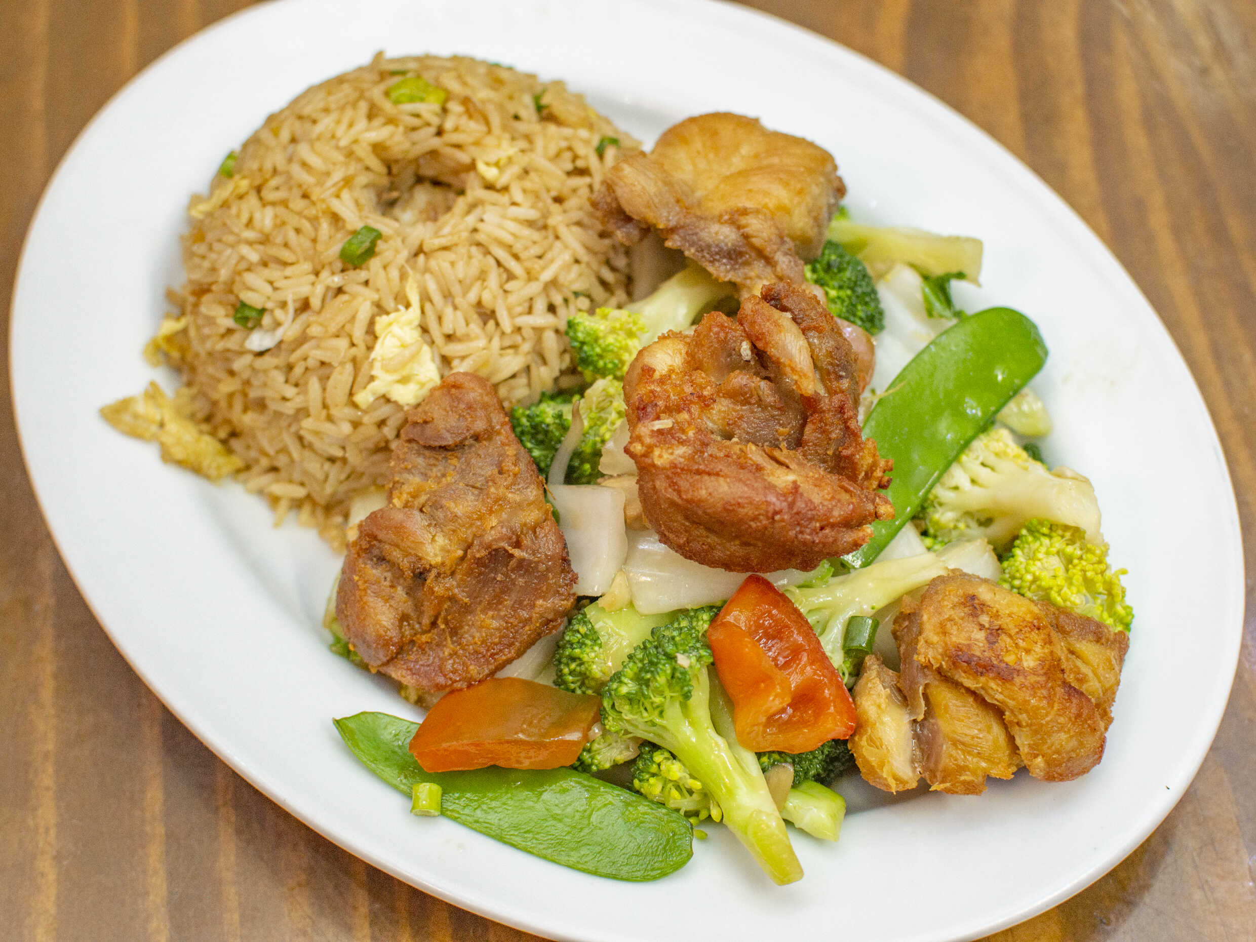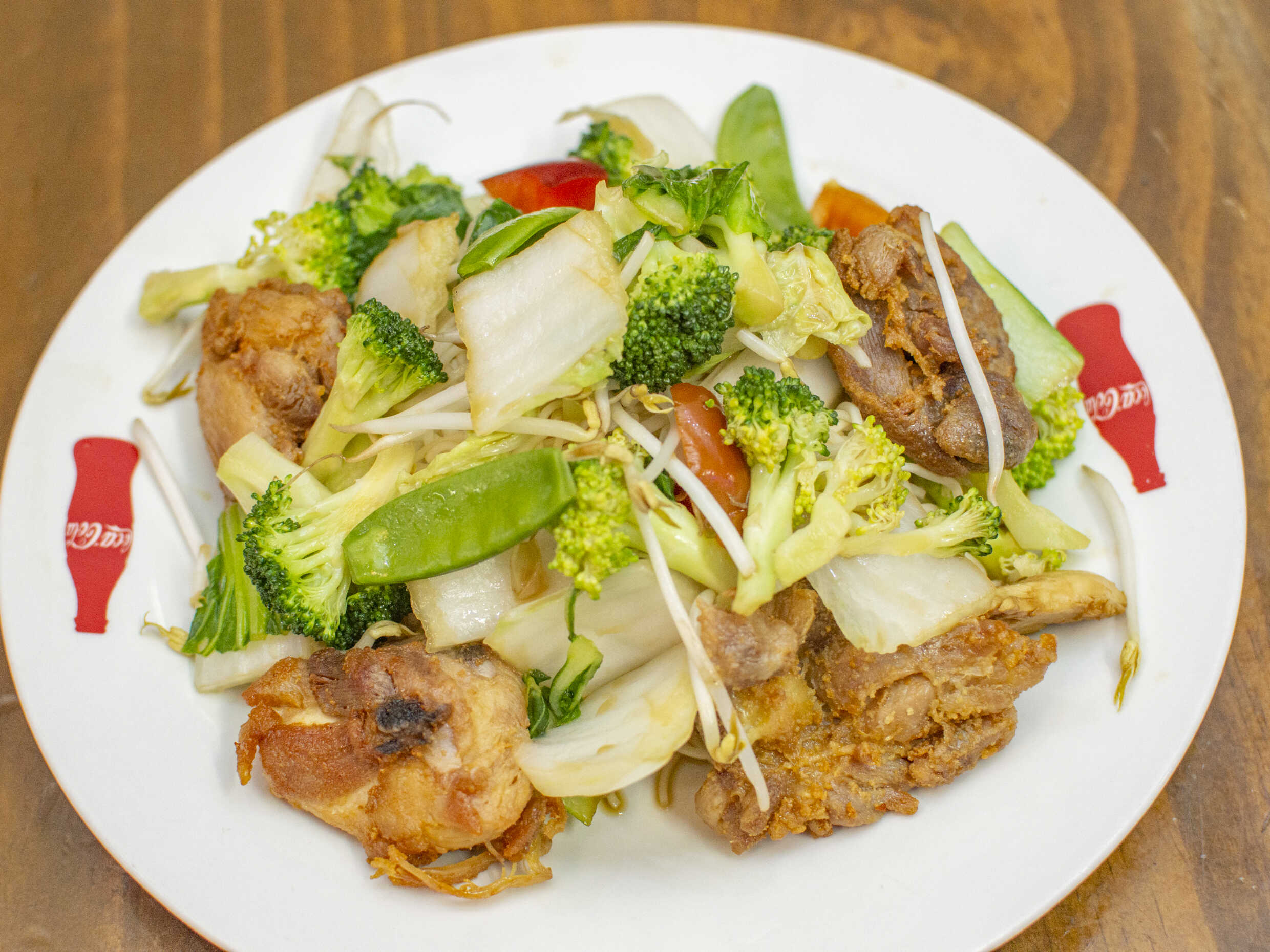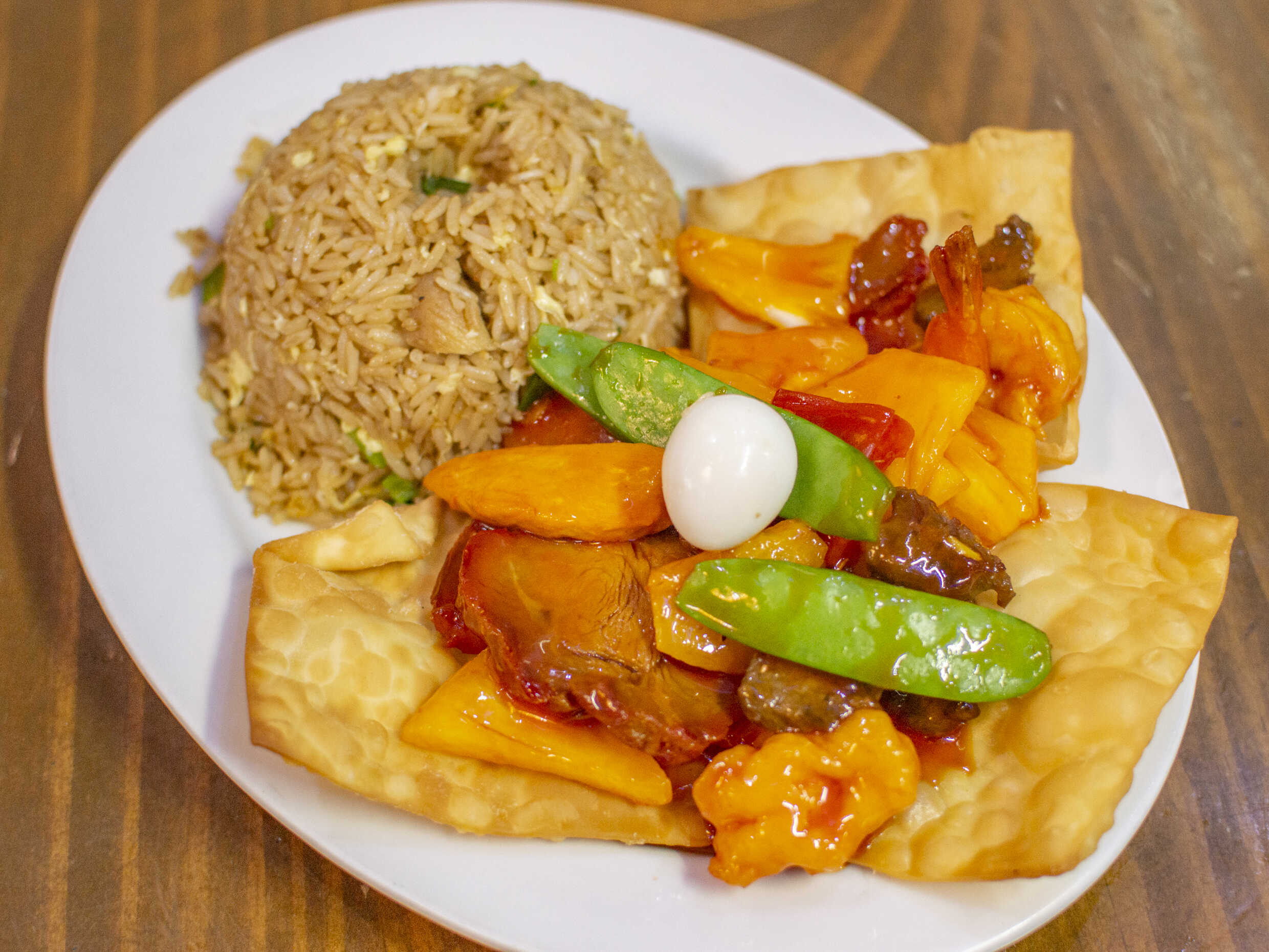 pollo, chancho, carne y langostinos salteados con todas las verduras con arroz chaufa