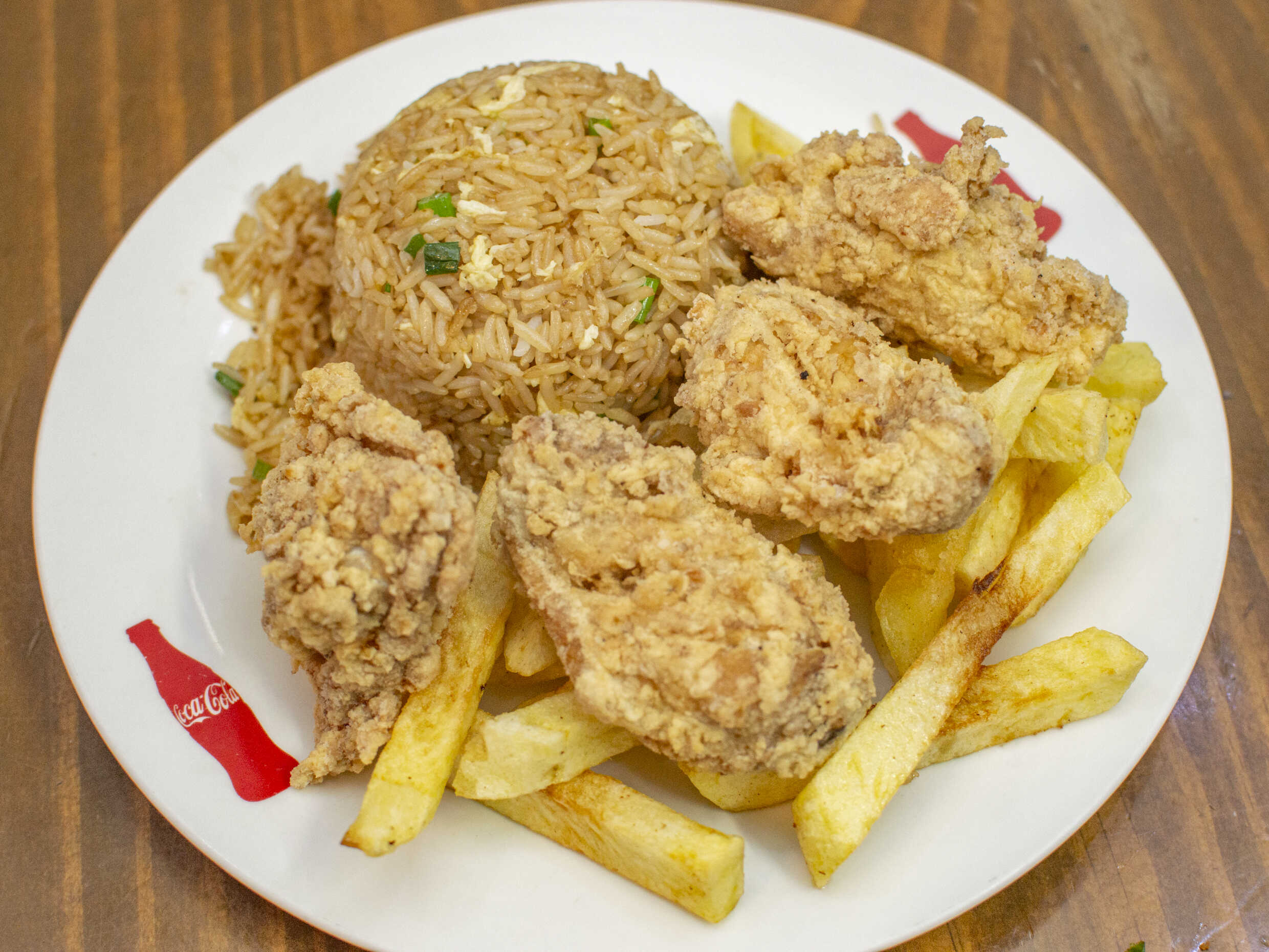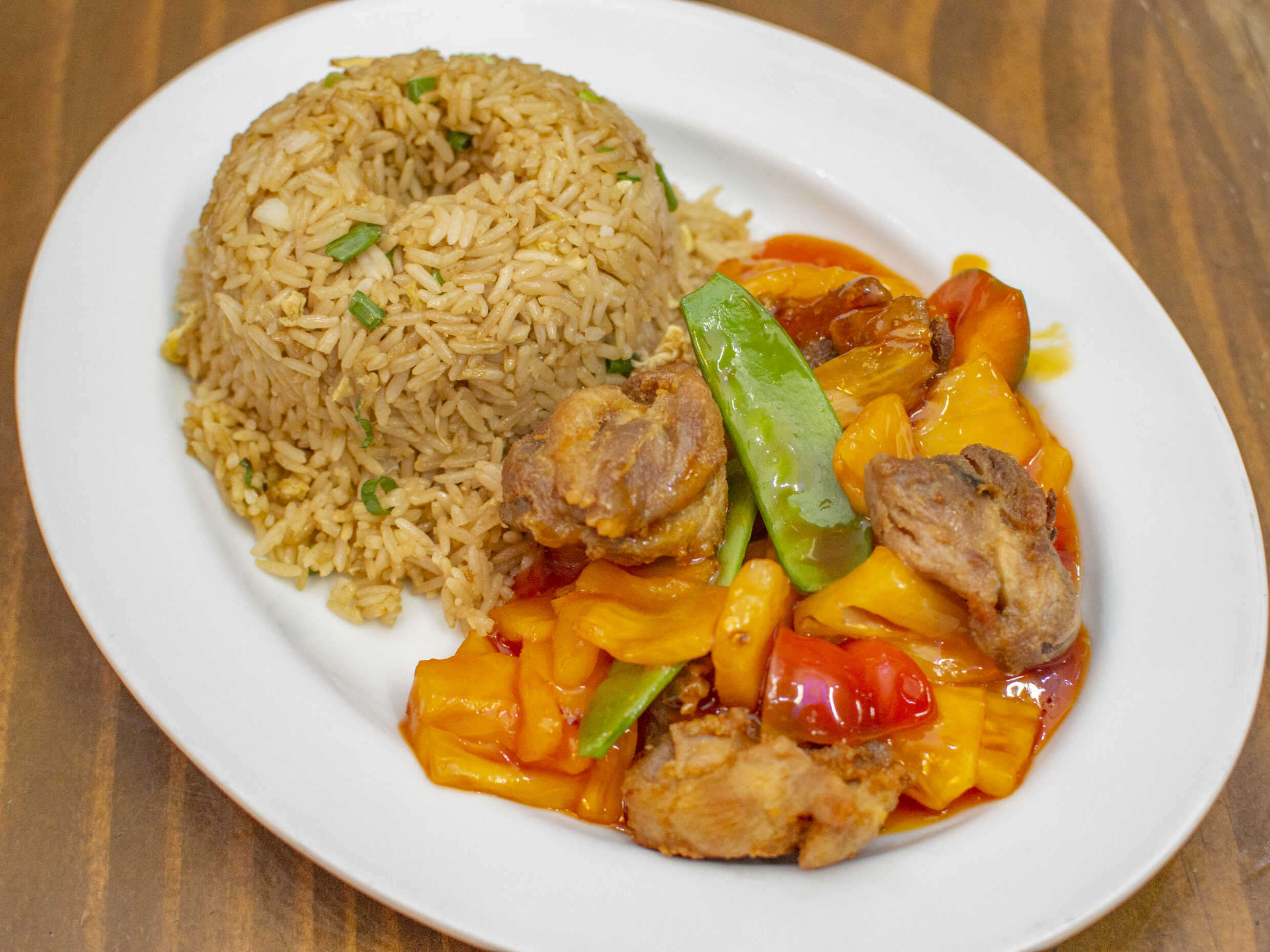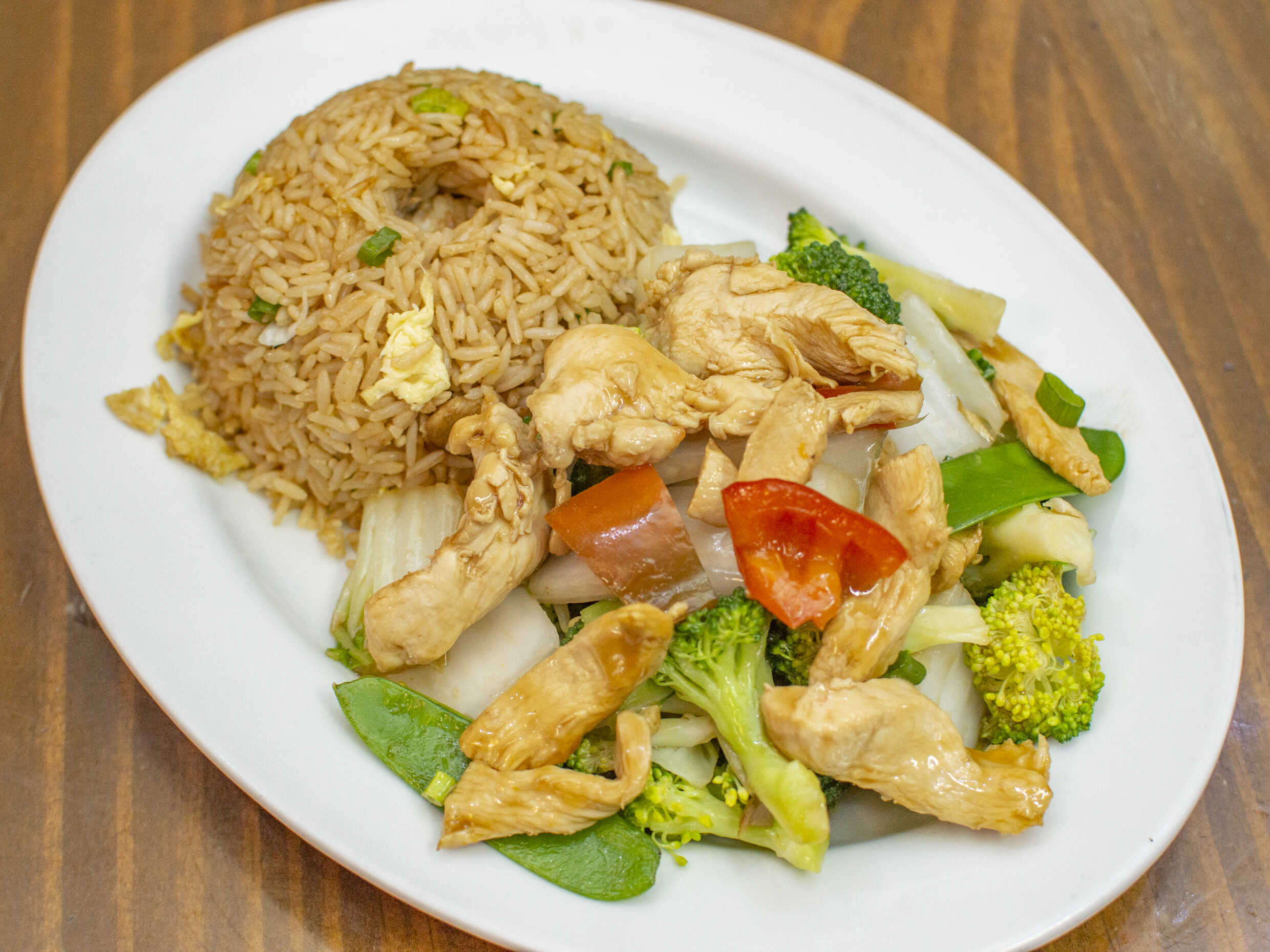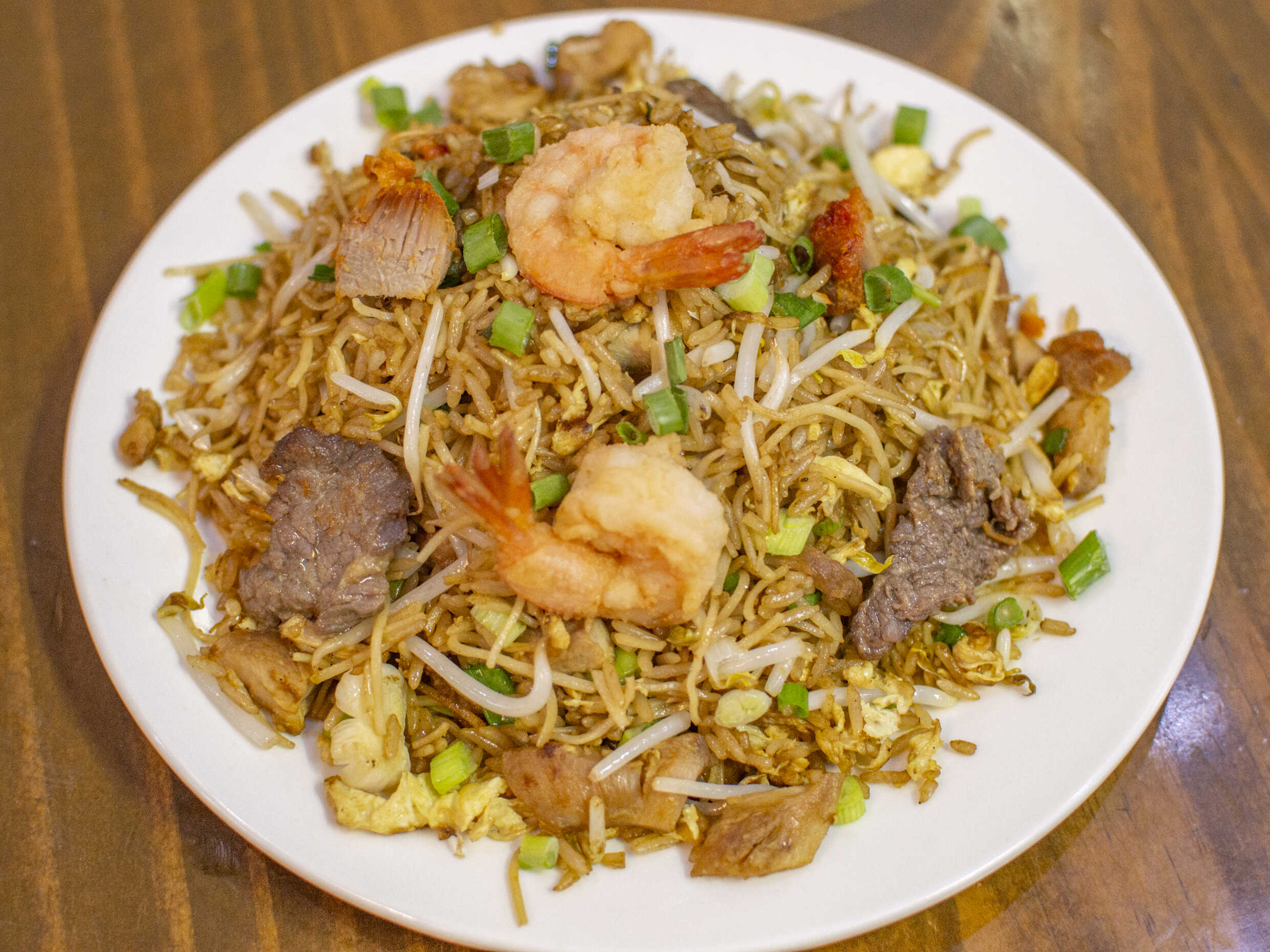 pollo, chancho, carne y langostinos salteados con todas las verduras con arroz chaufa