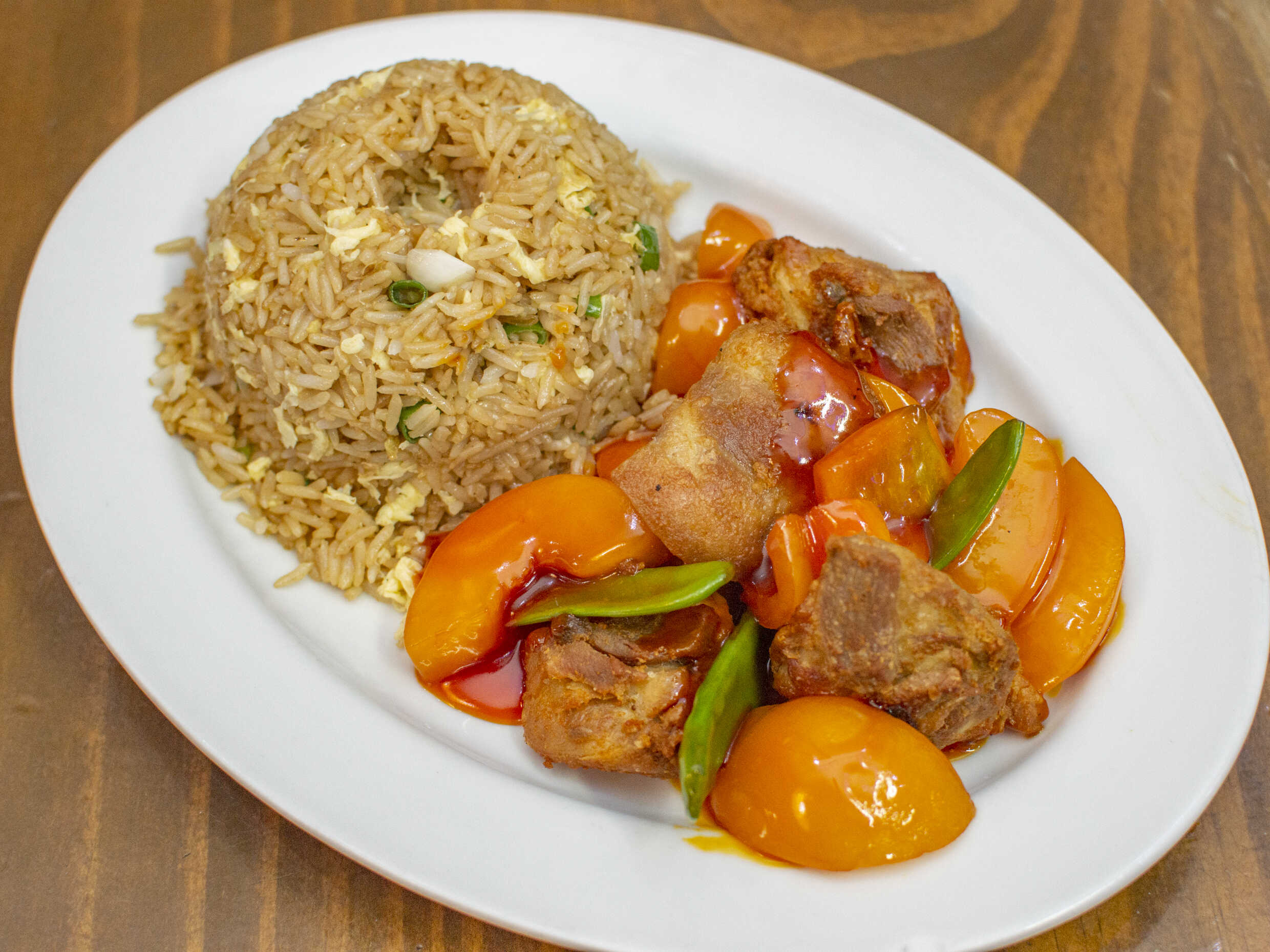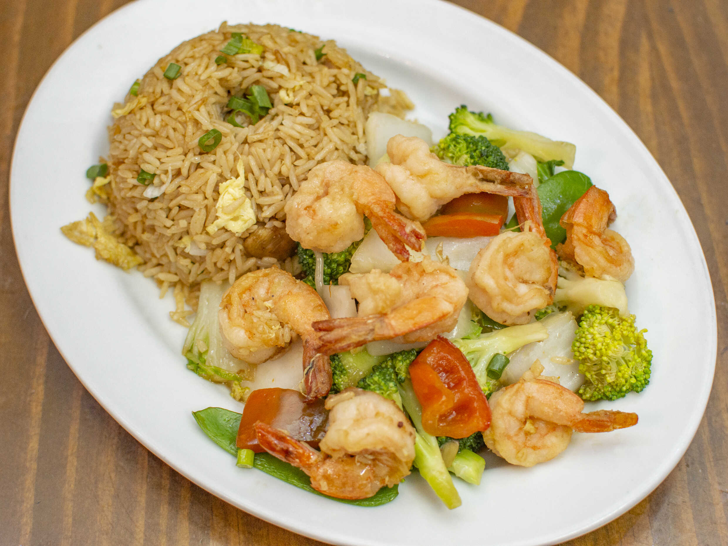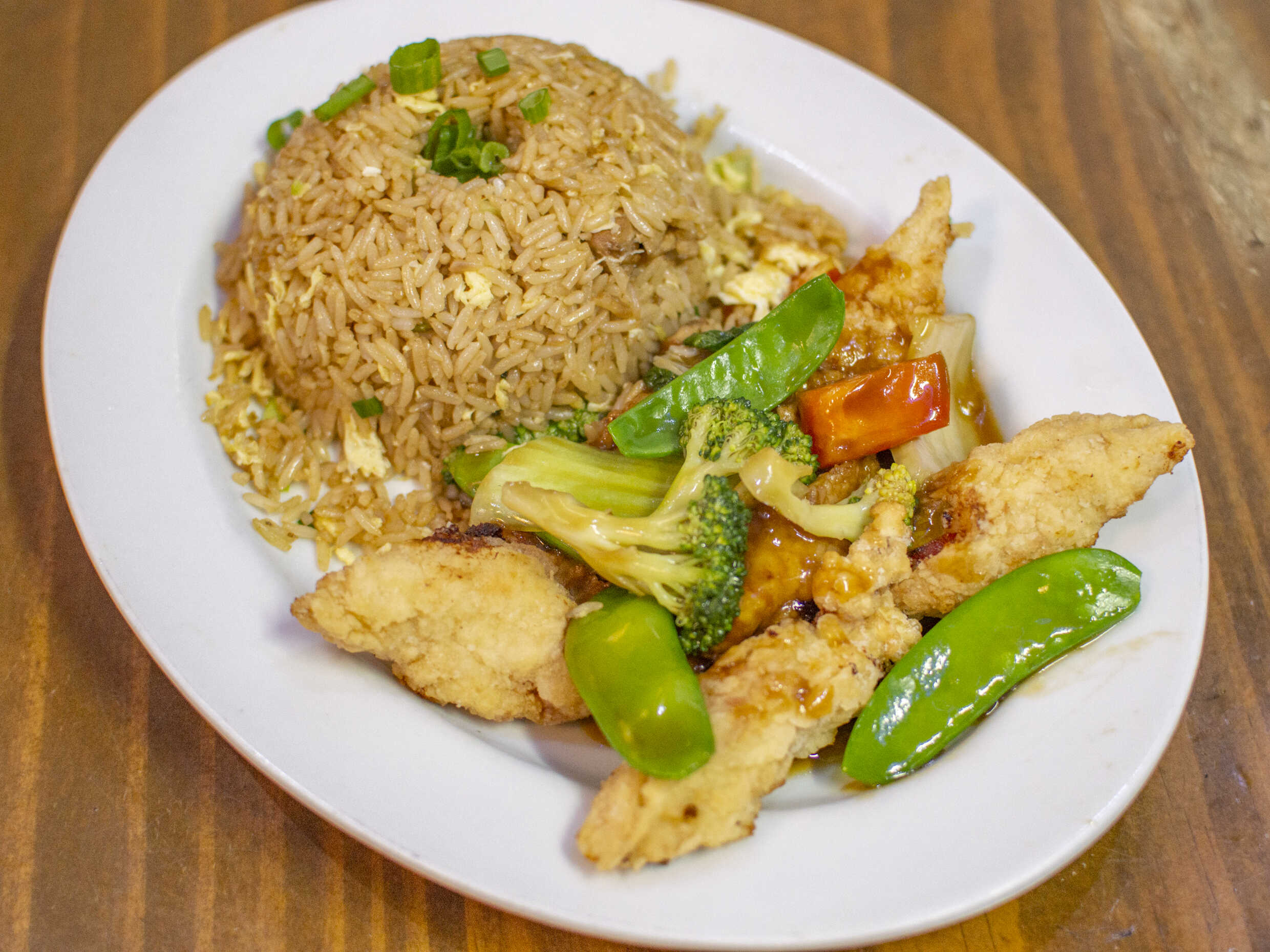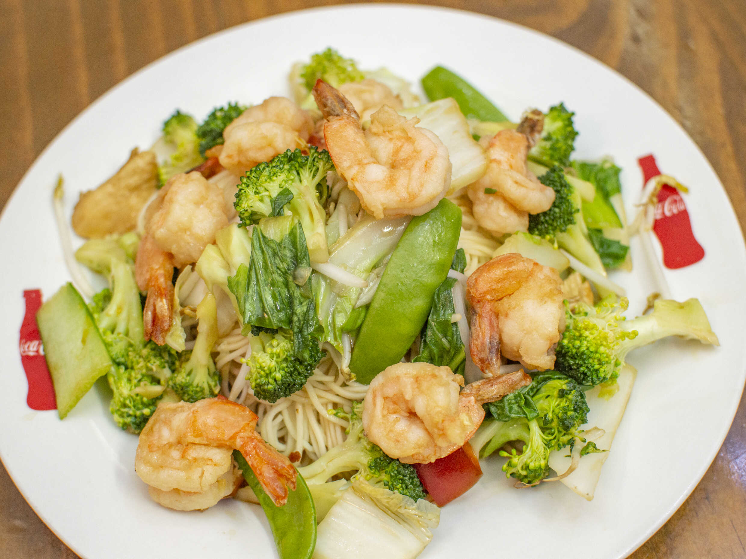pollo, chancho, carne y langostinos salteados con todas las verduras con arroz chaufa