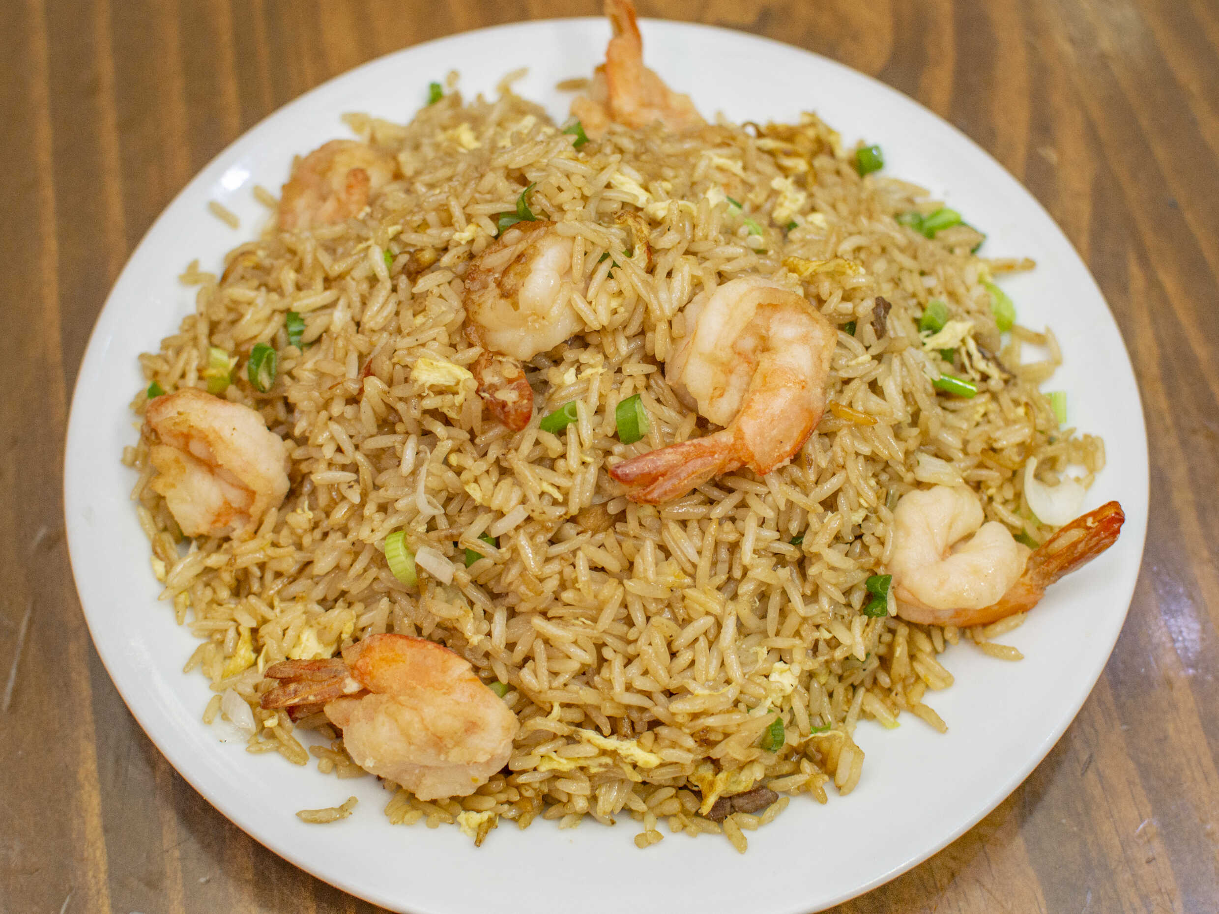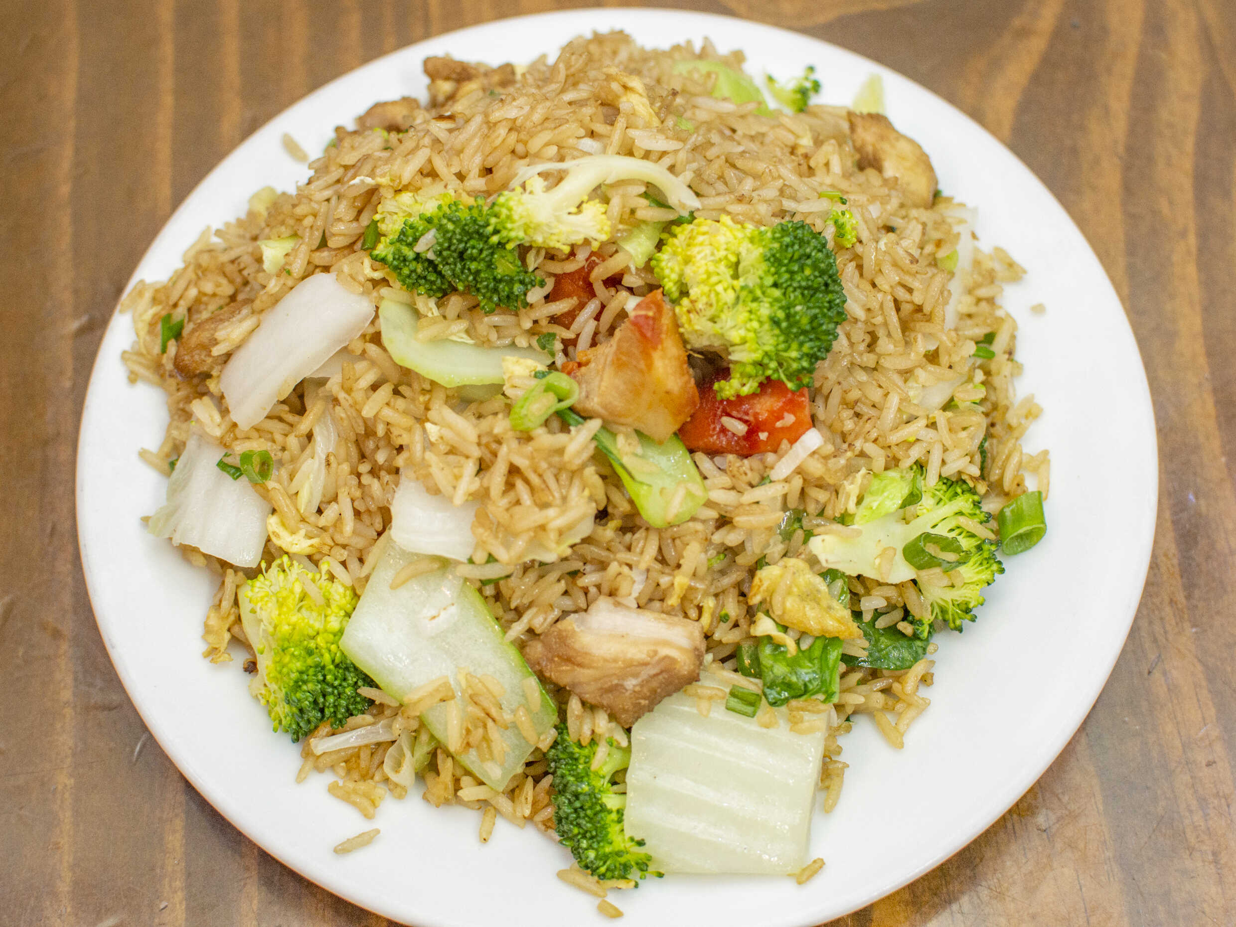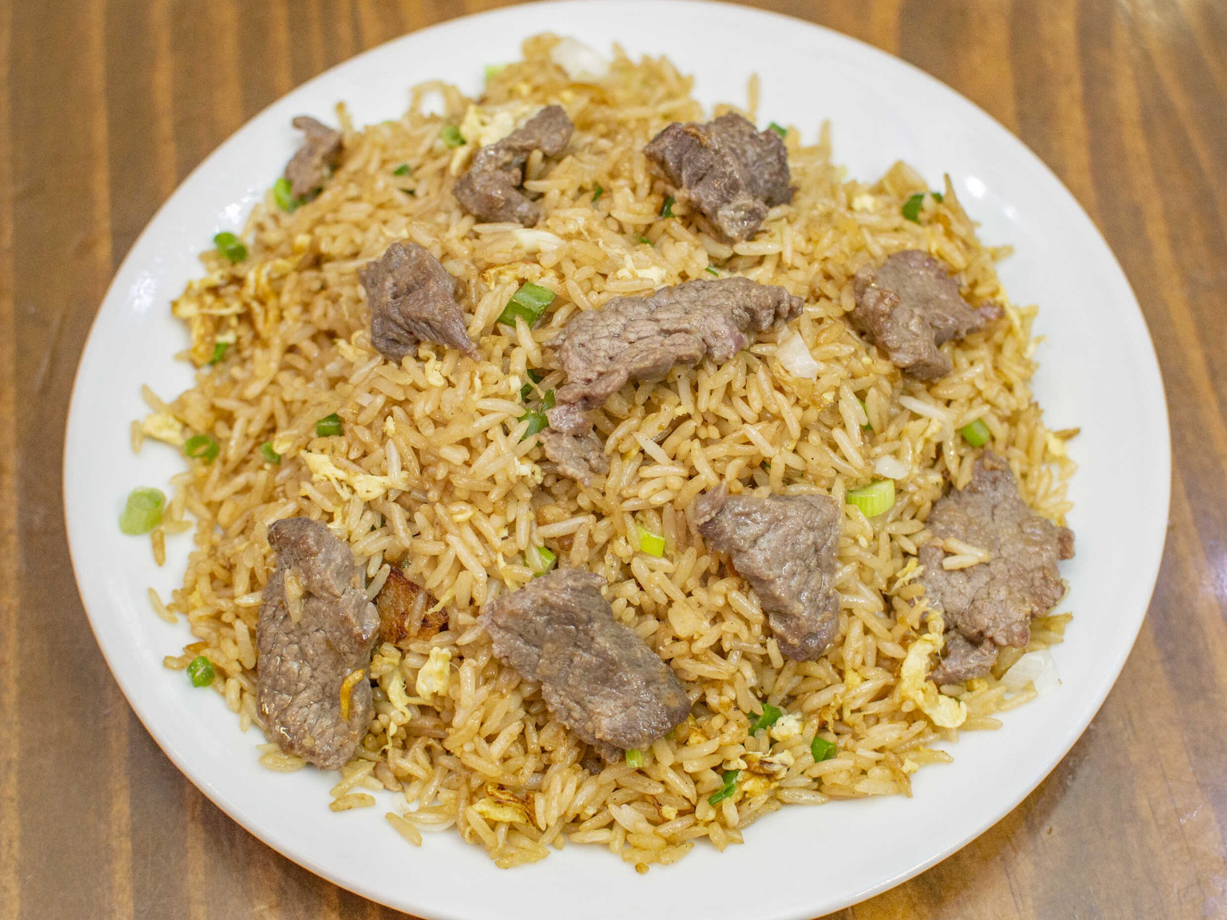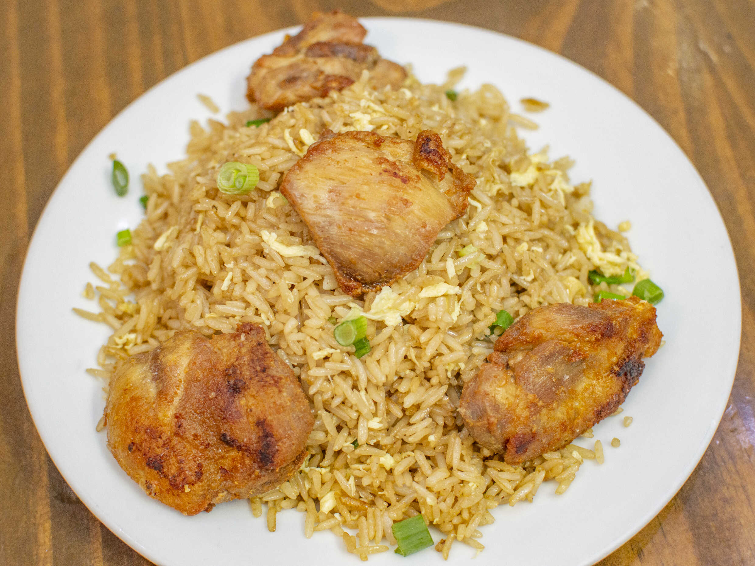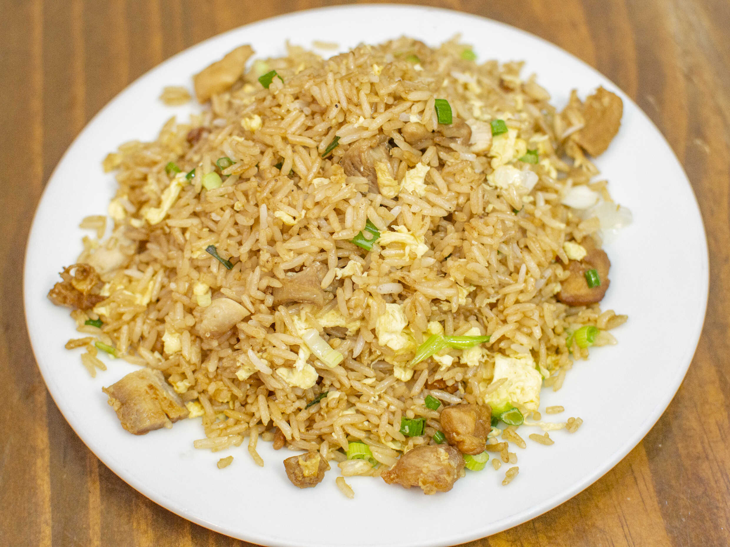 arroz salteado con pollo , chancho , huevo y cebolla china