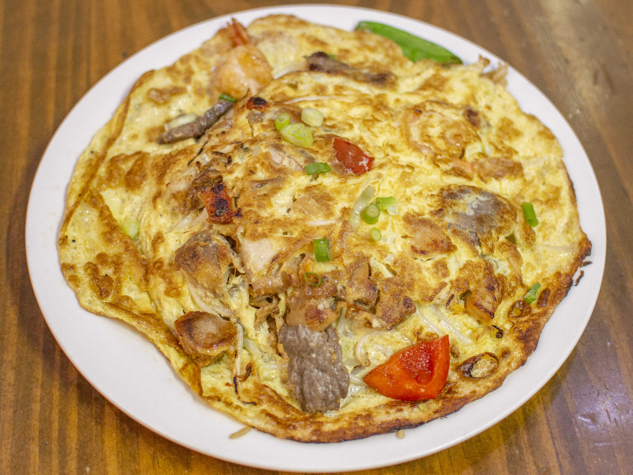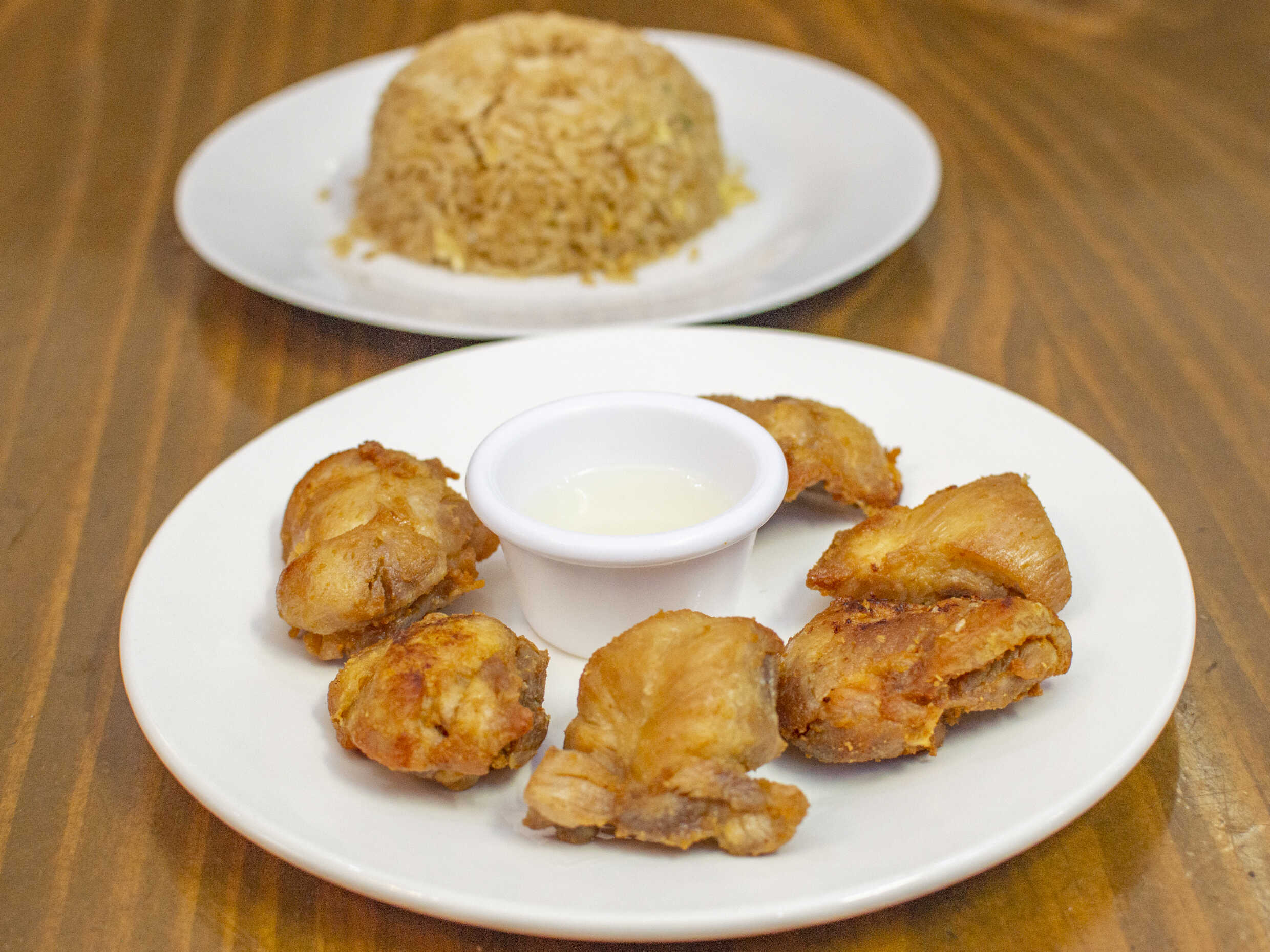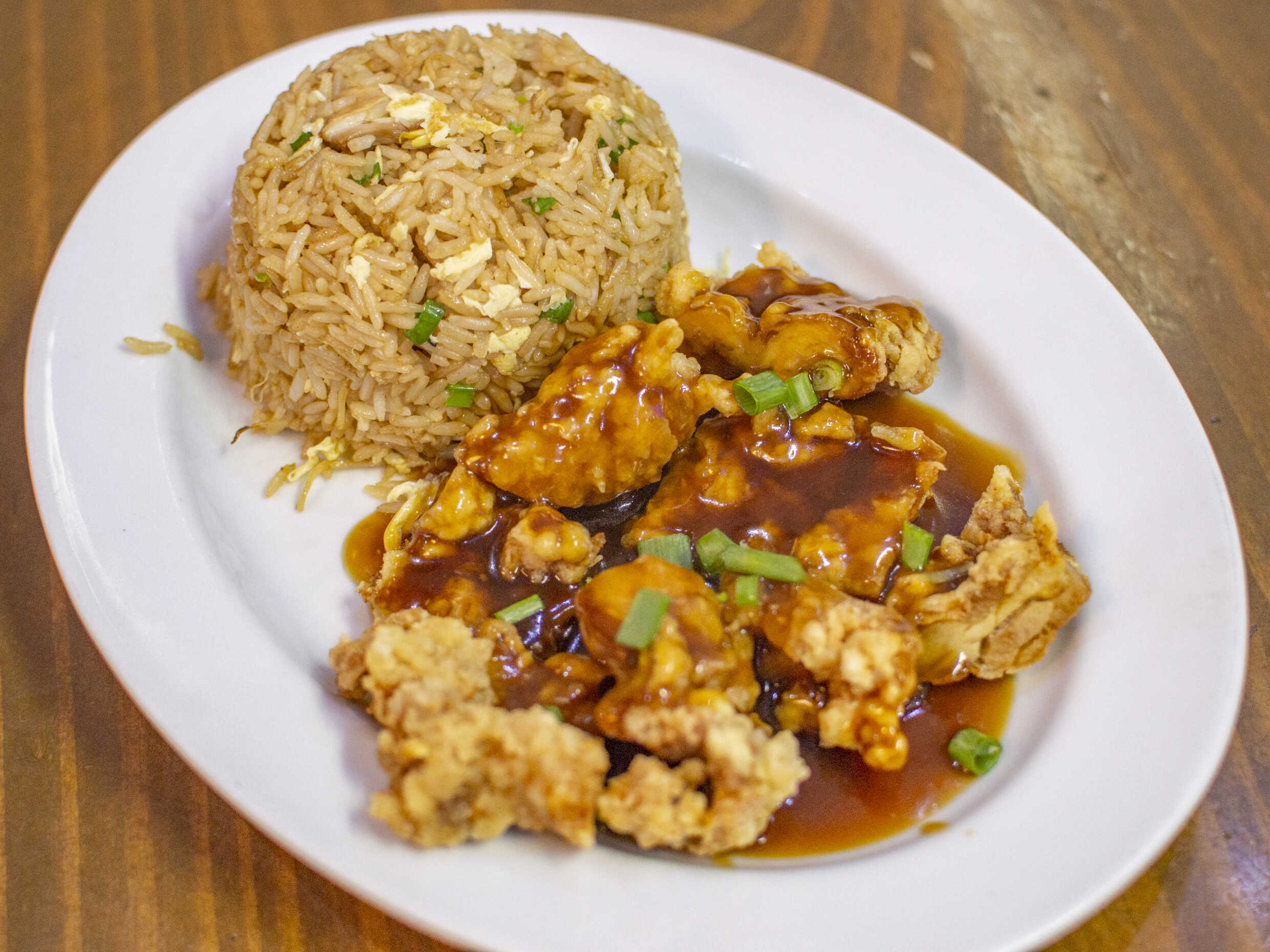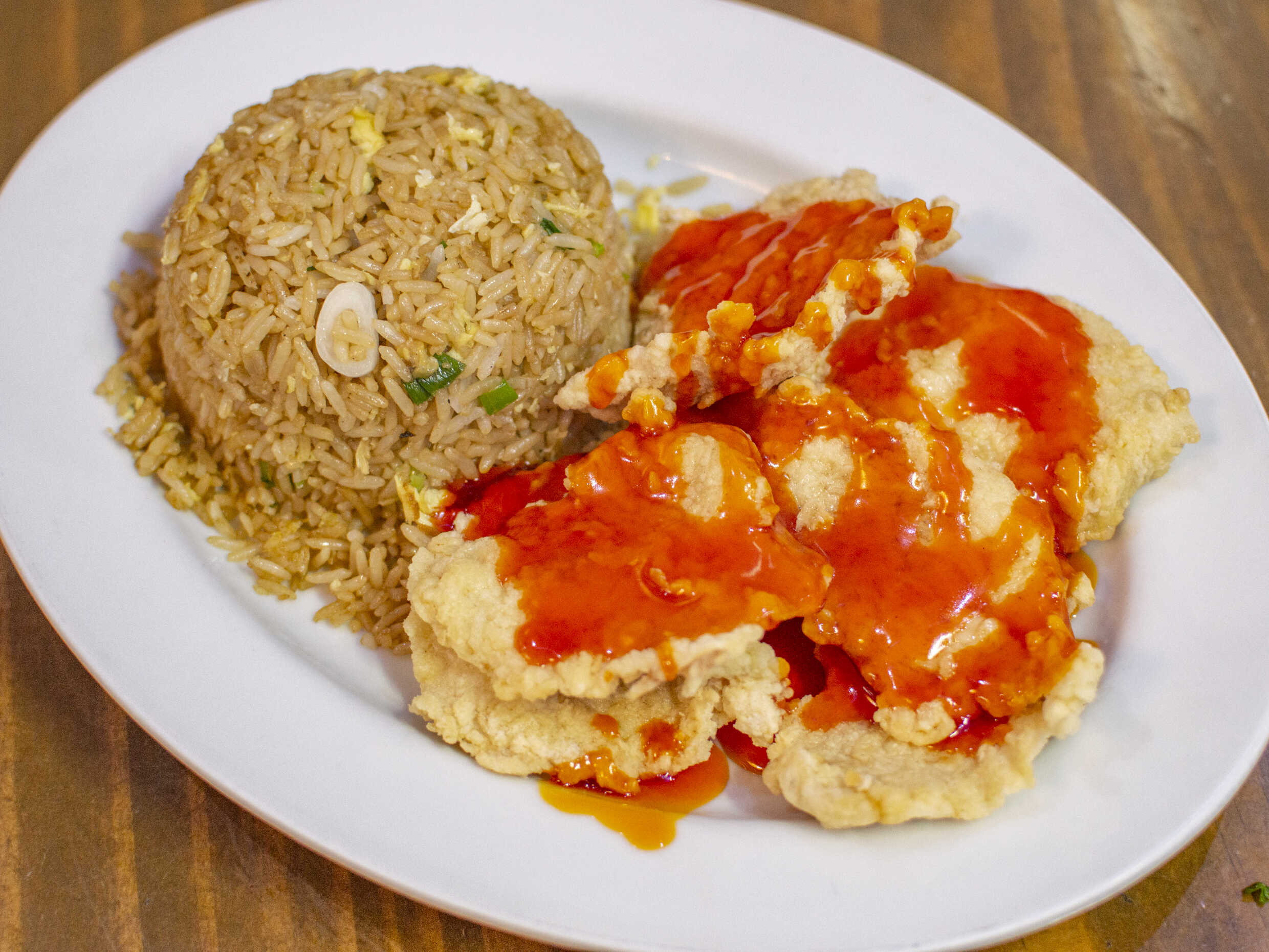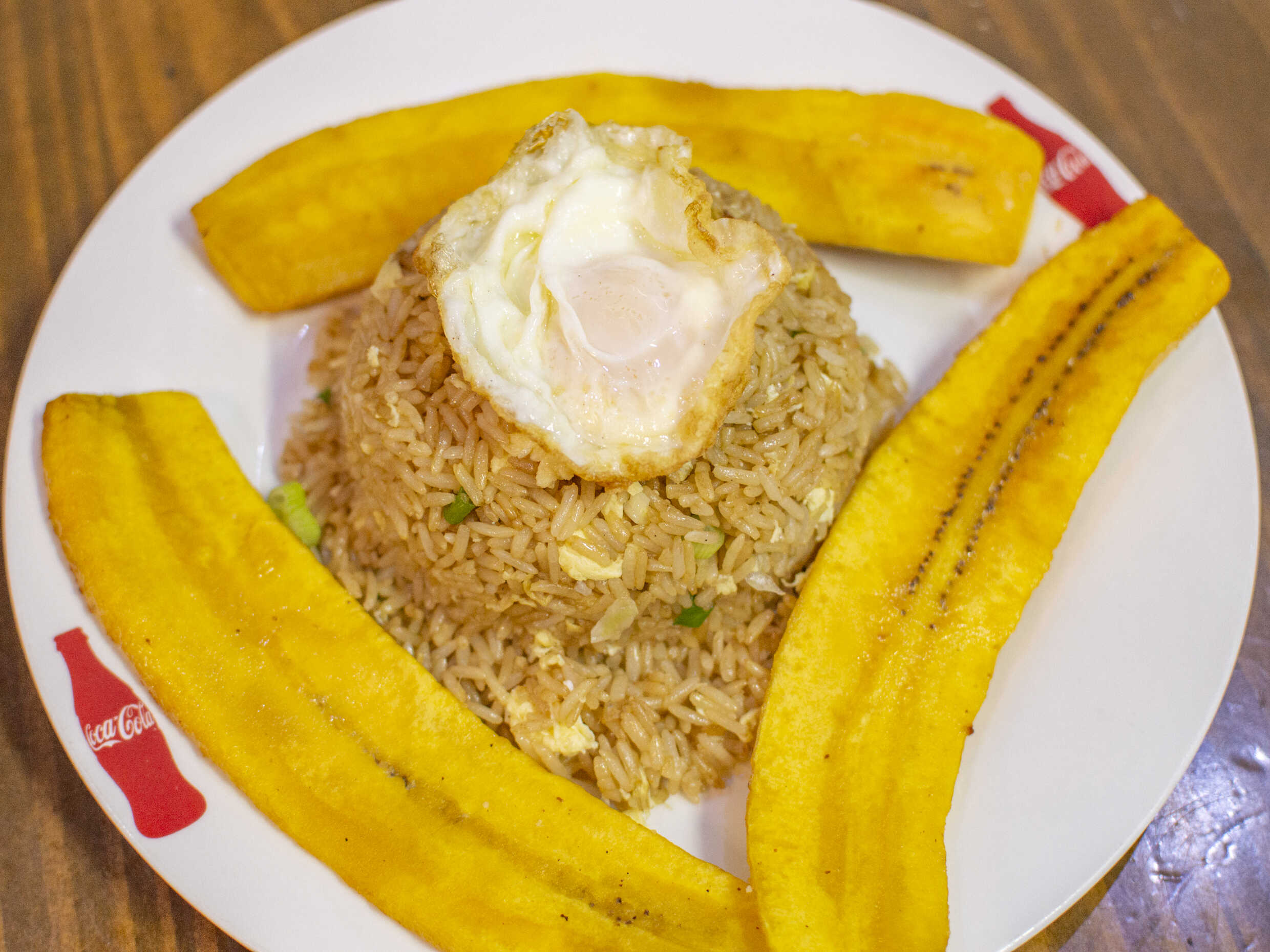 arroz salteado con pollo , chancho , huevo y cebolla china