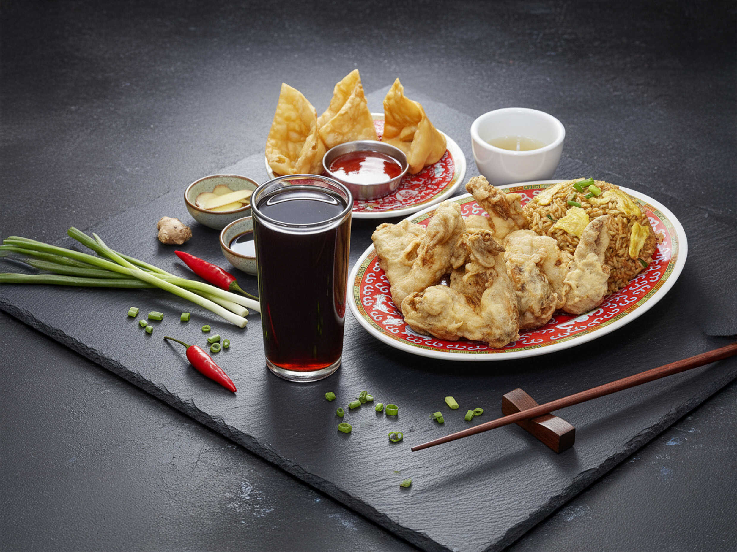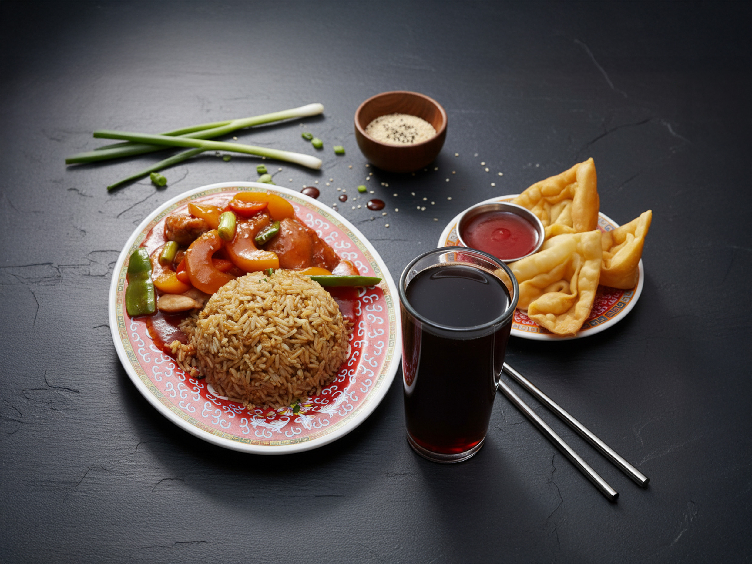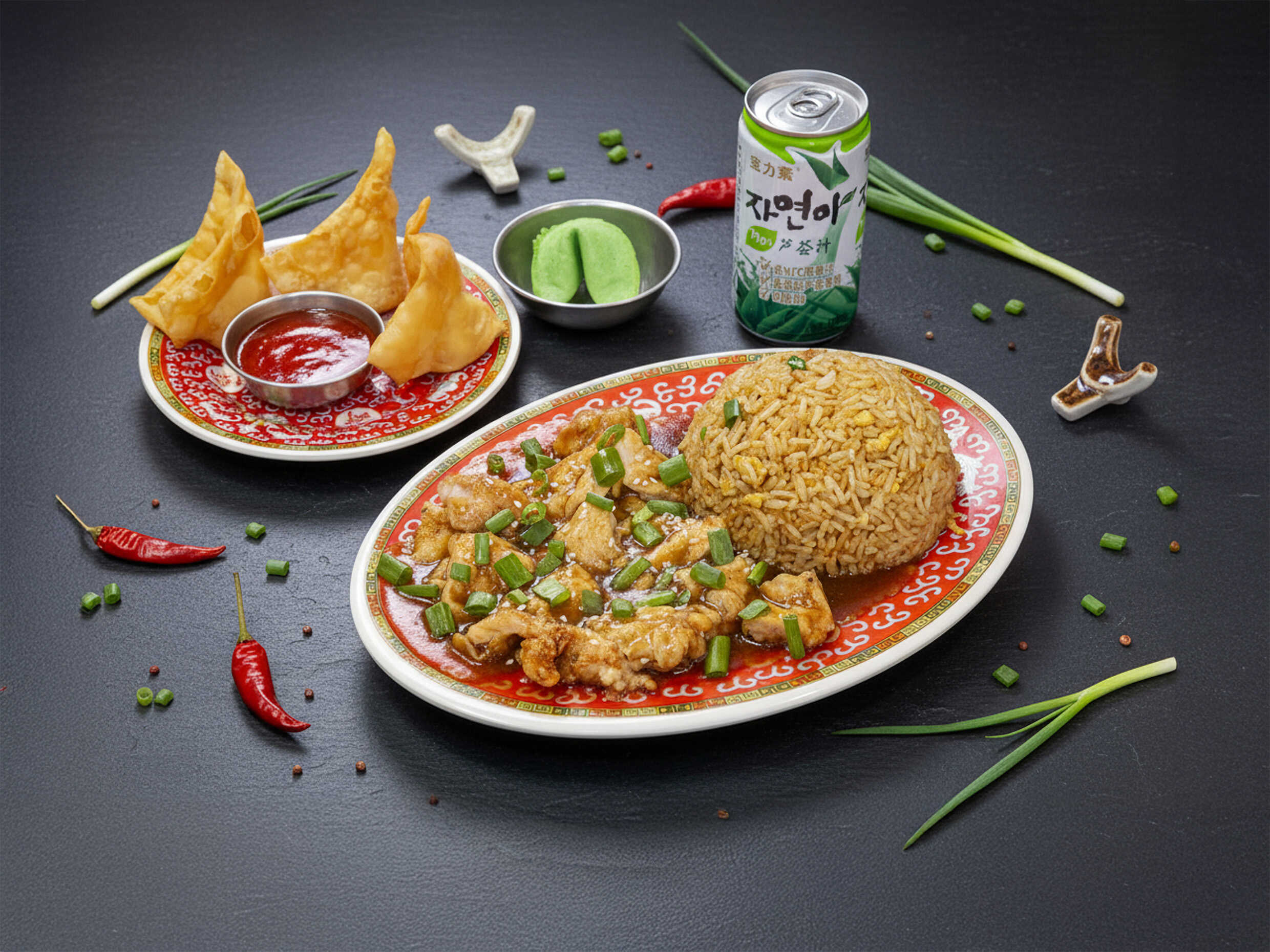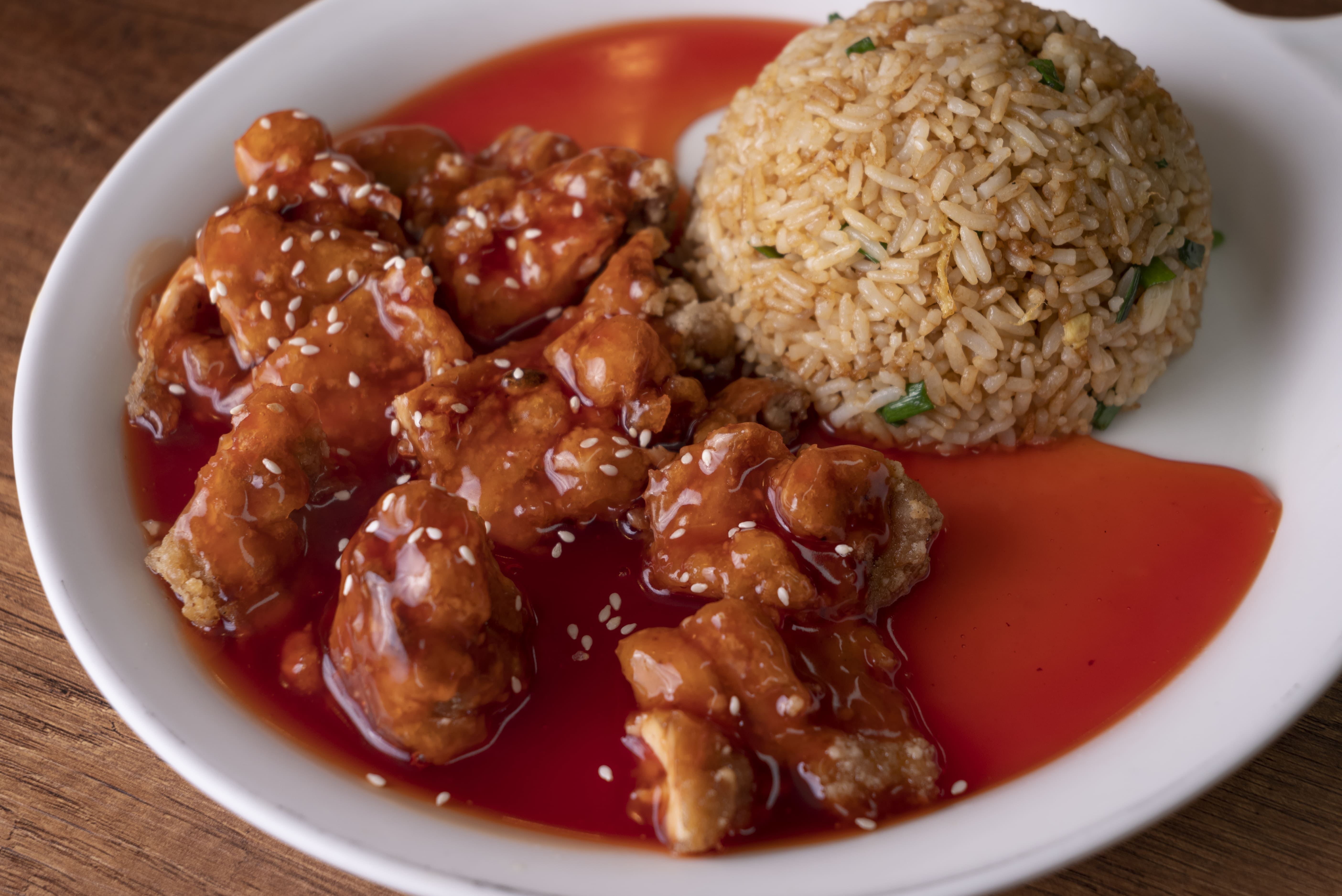 4 Wantanes crocantes rellenos + Chaufa de Pollo + Chijaukai con Chaufa (pollo marinado, empanizado y frito, bañado en salsa con semillas de ajonjolí).