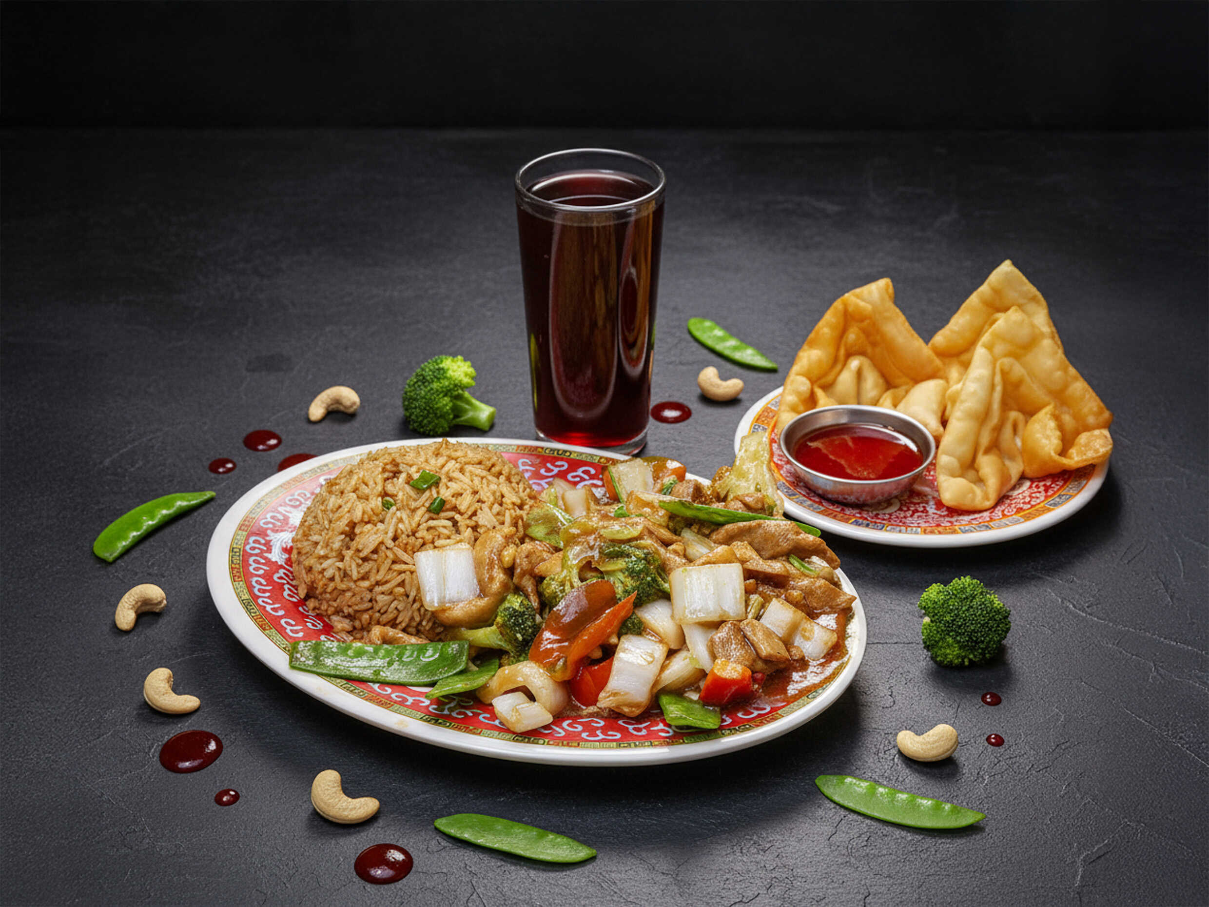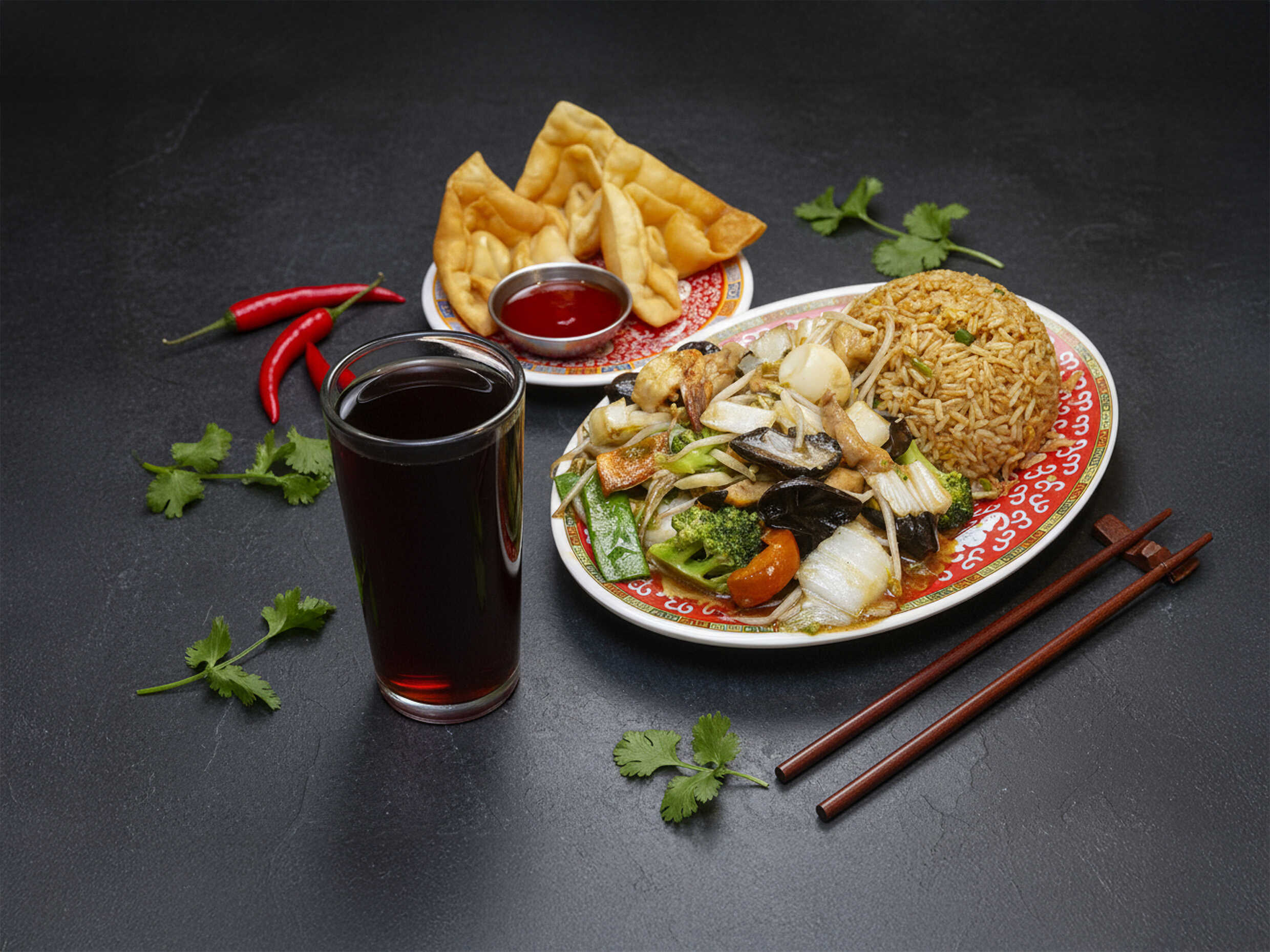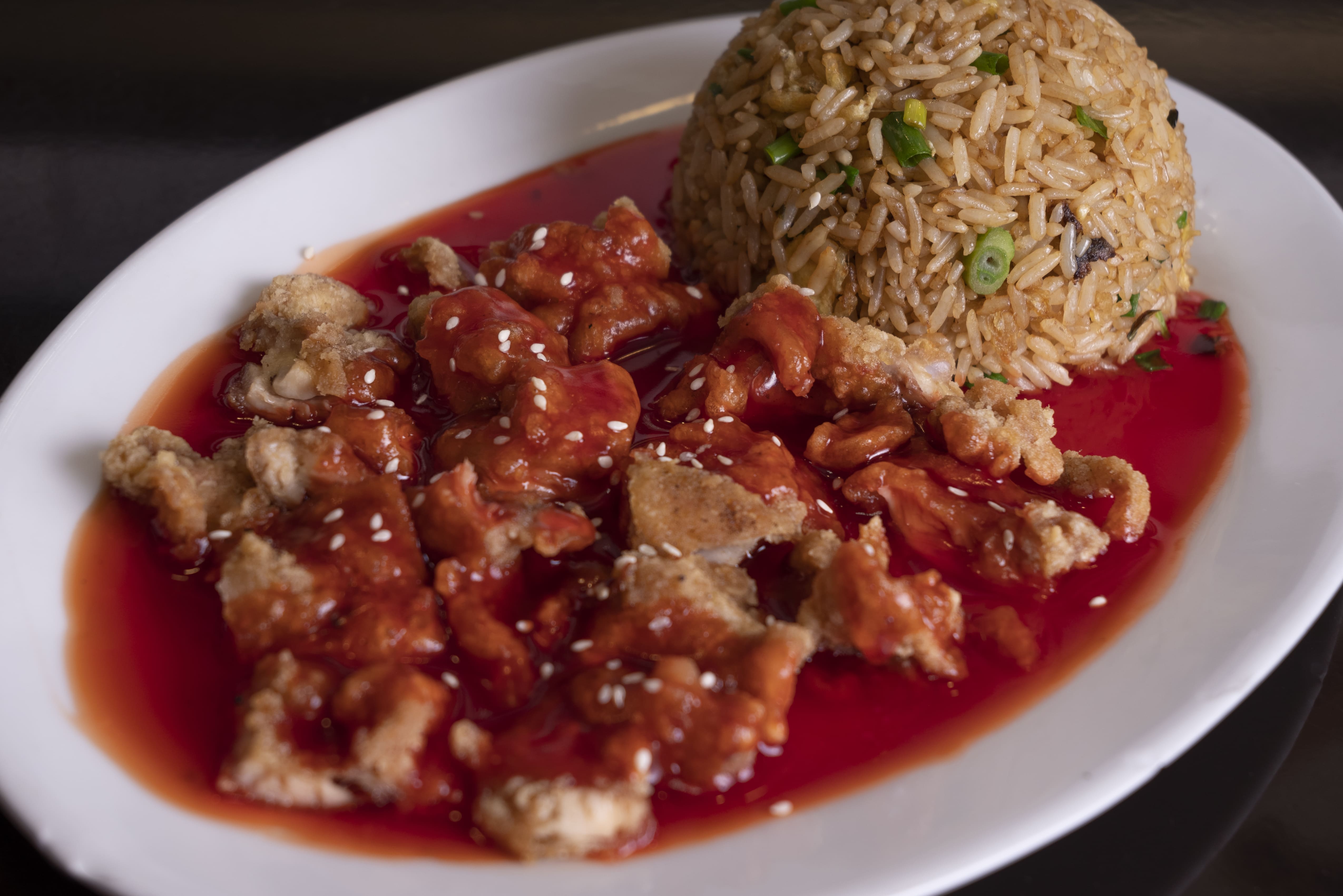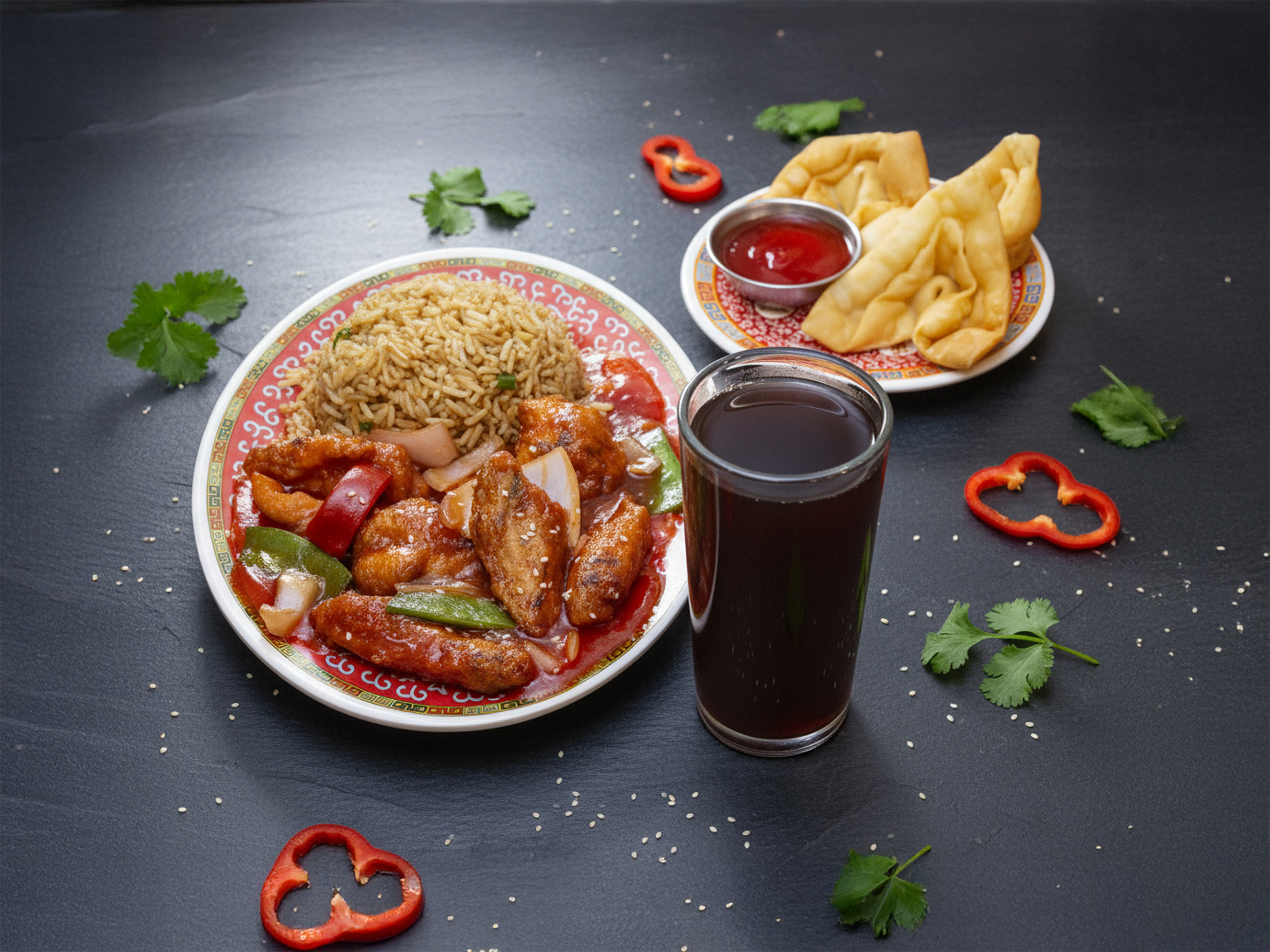 4 Wantanes crocantes rellenos + Chaufa de Pollo + Chijaukai con Chaufa (pollo marinado, empanizado y frito, bañado en salsa con semillas de ajonjolí).