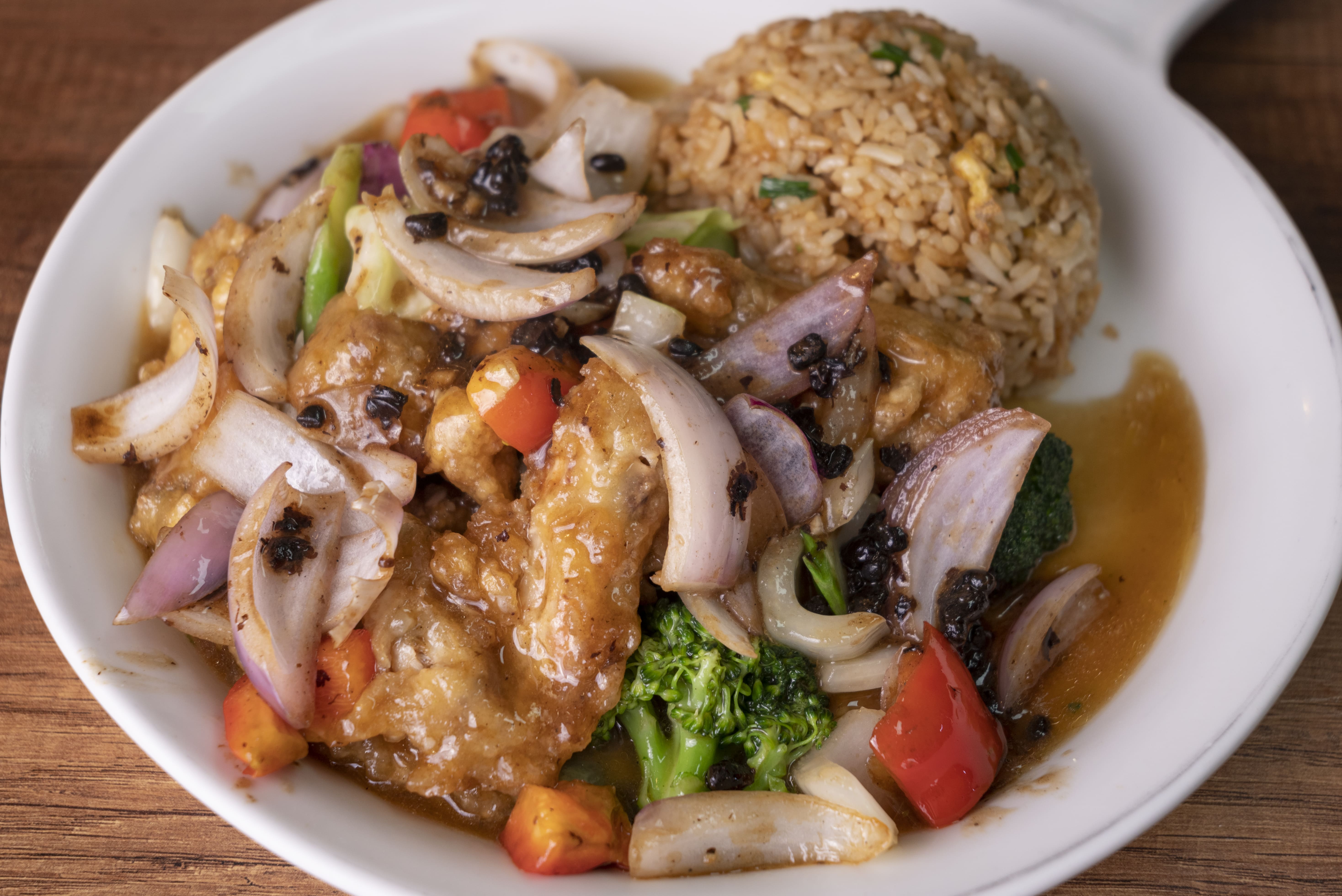 Pollo con salsa de frejol negro.