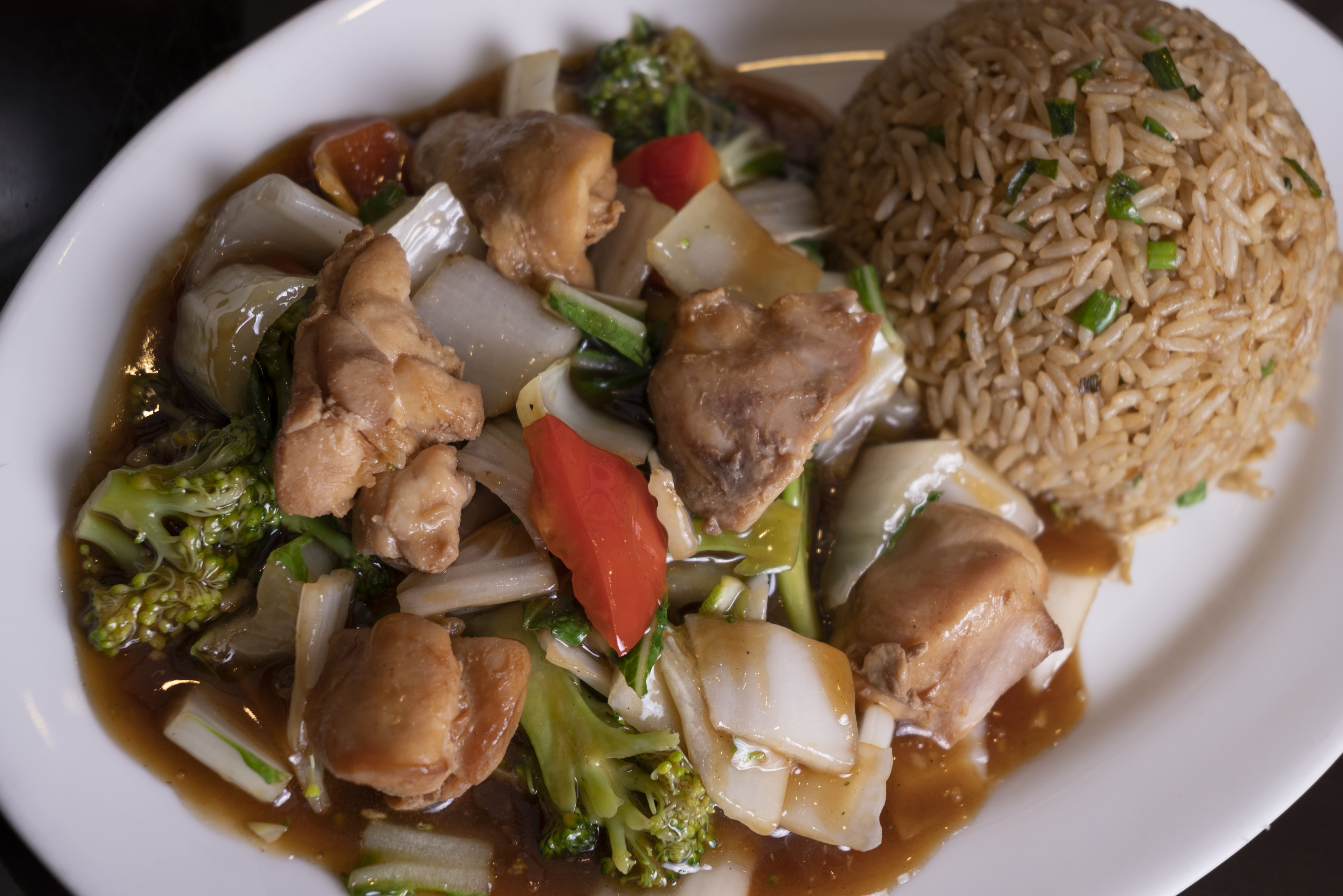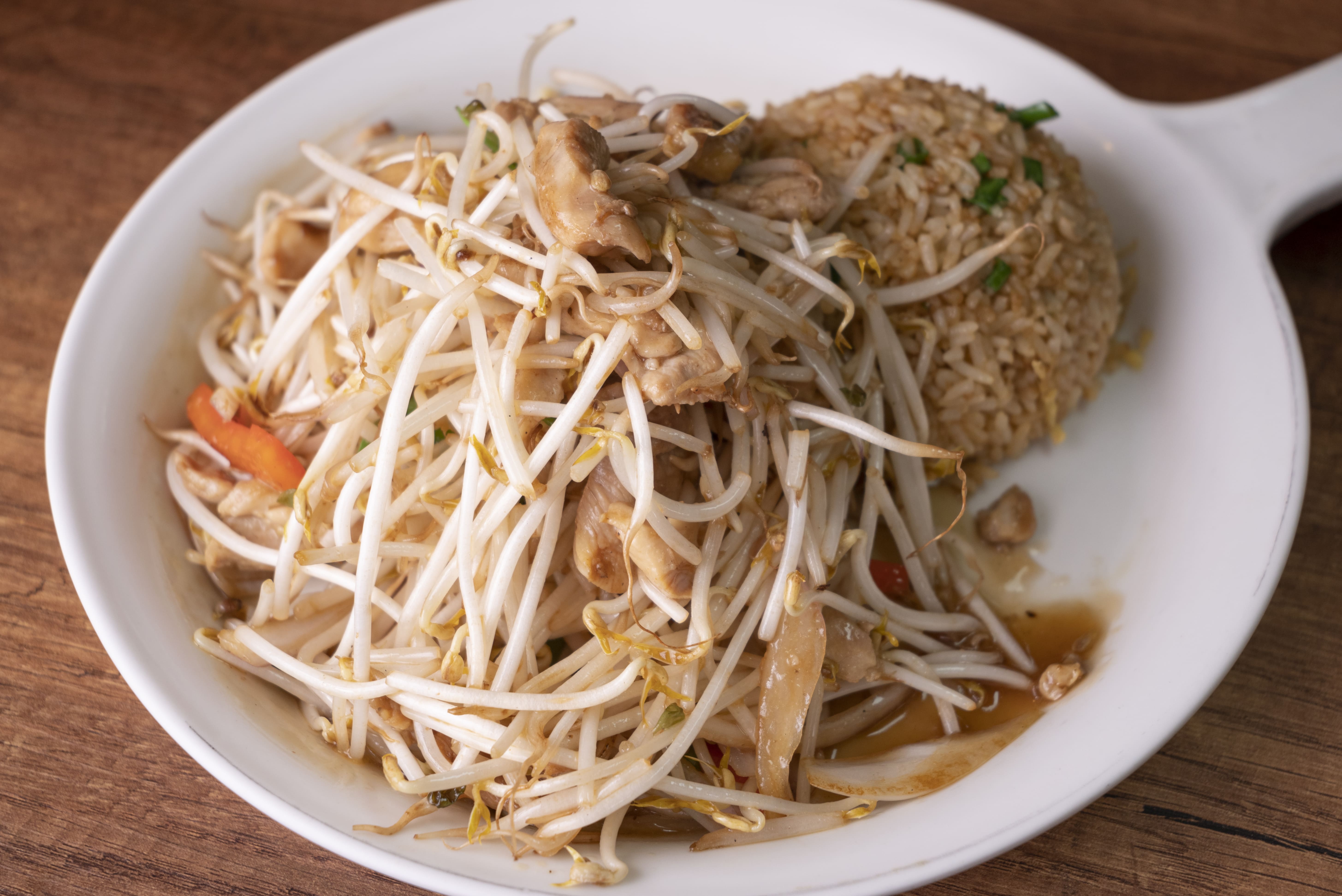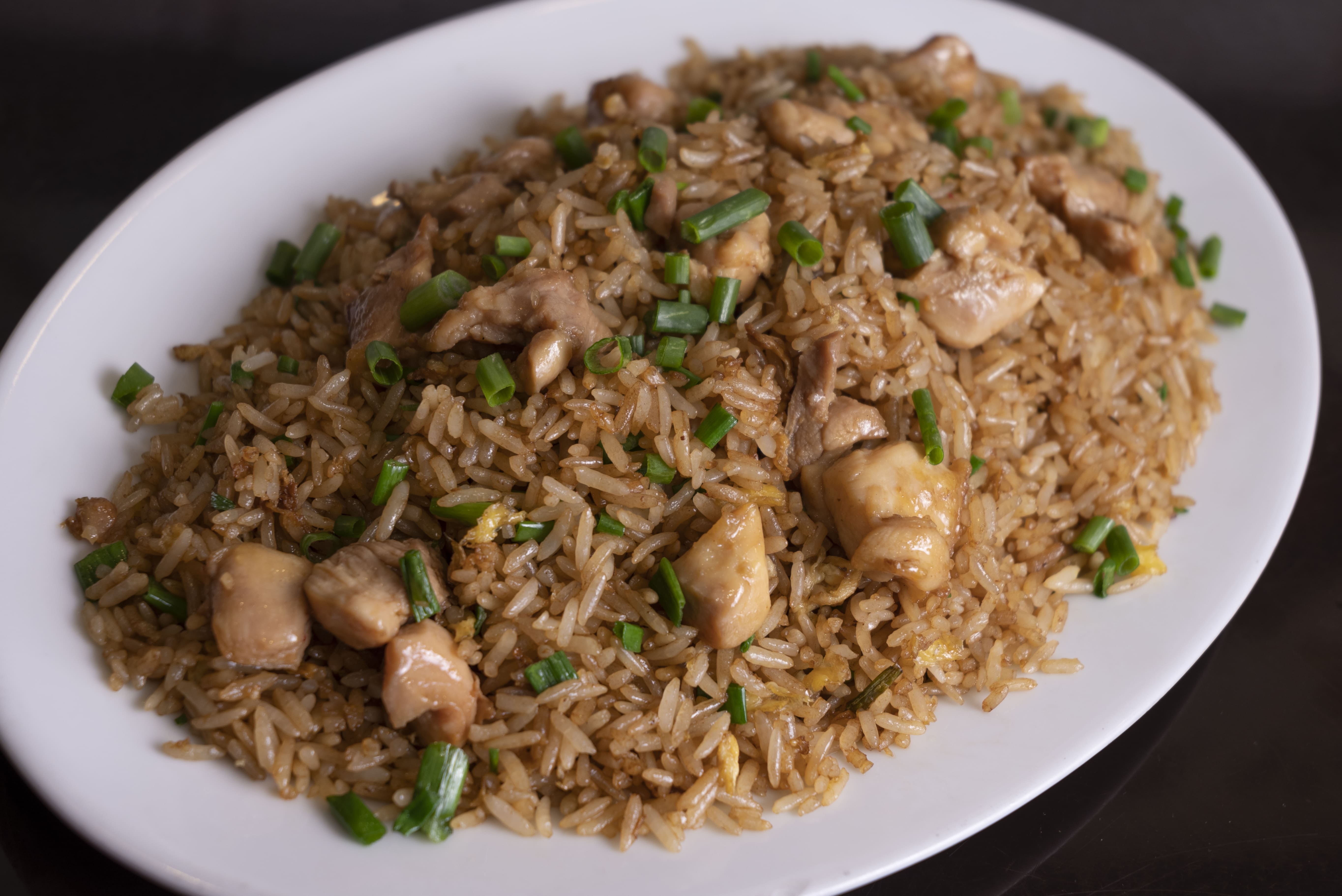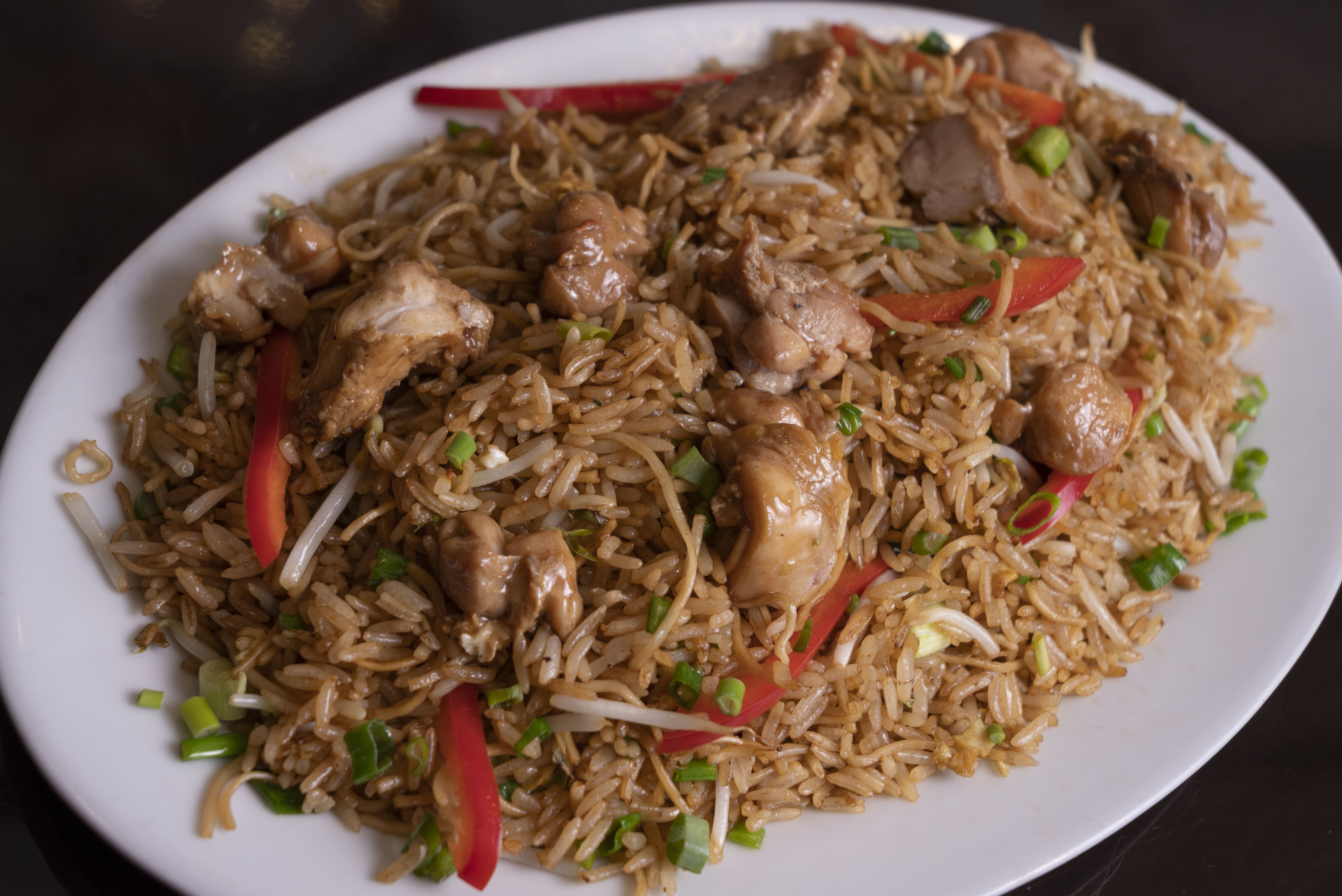 Arroz frito con trozos de pollo, estilo oriental.