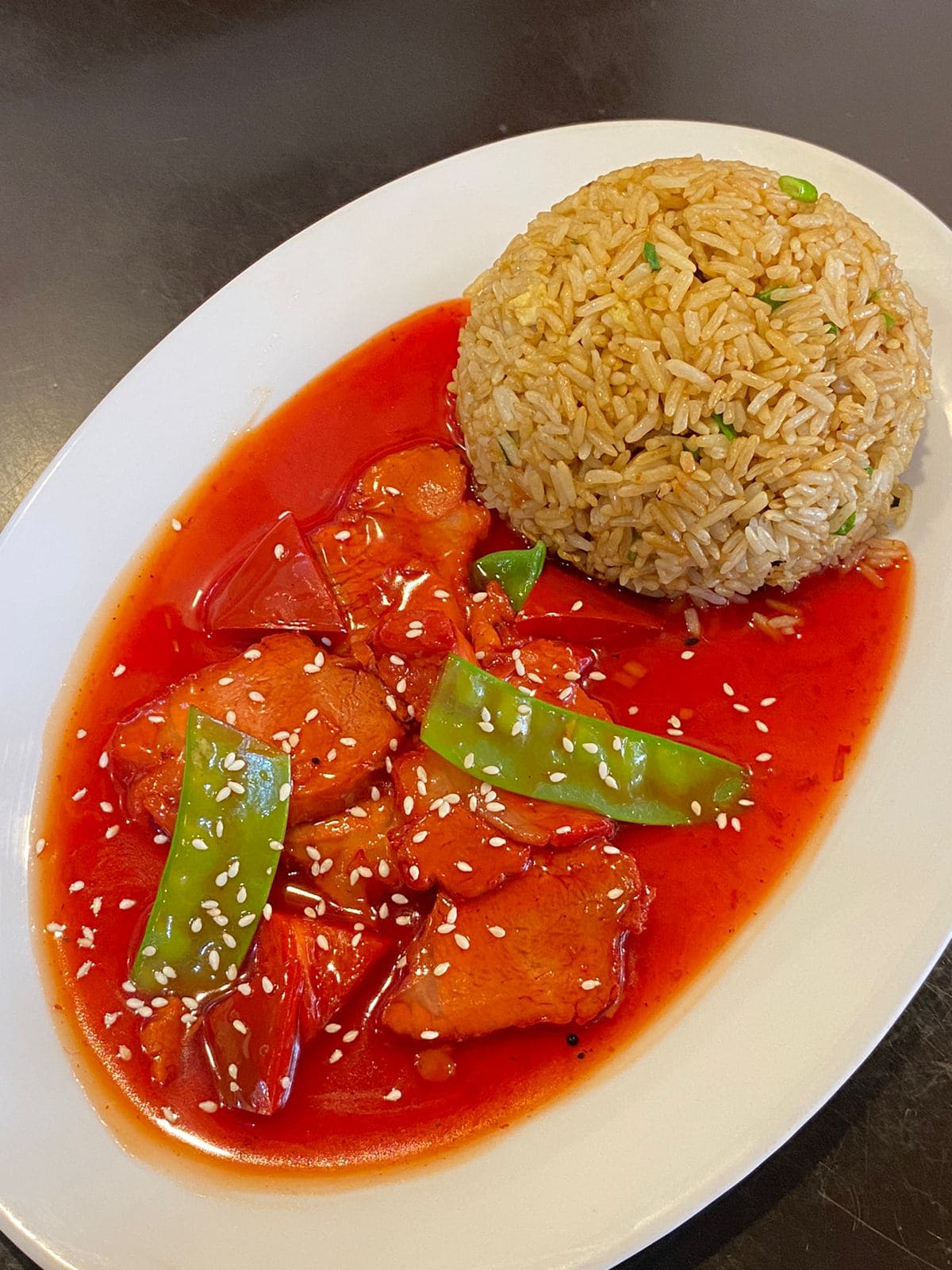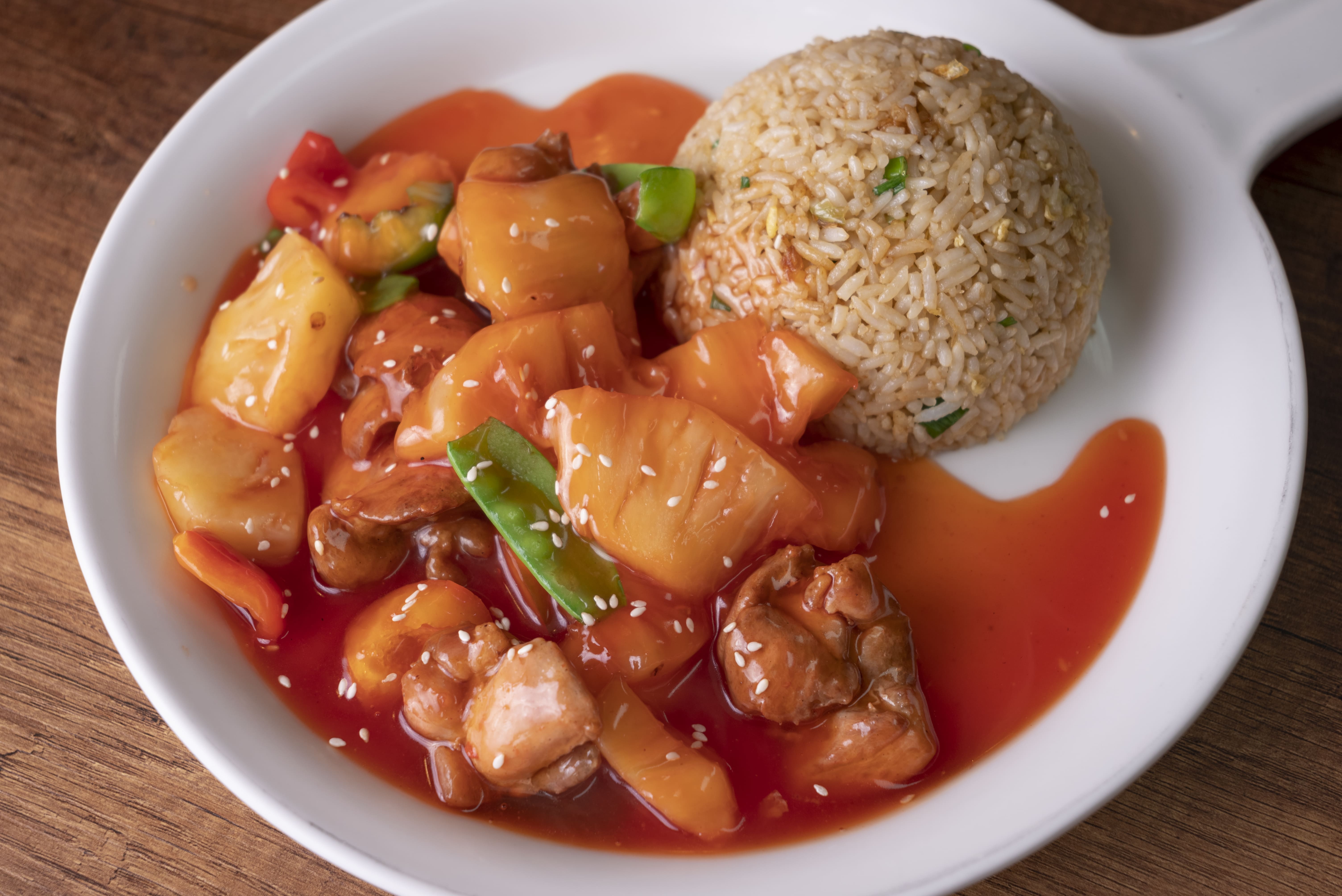 Pollo con trozos de piña en salsa dulce.