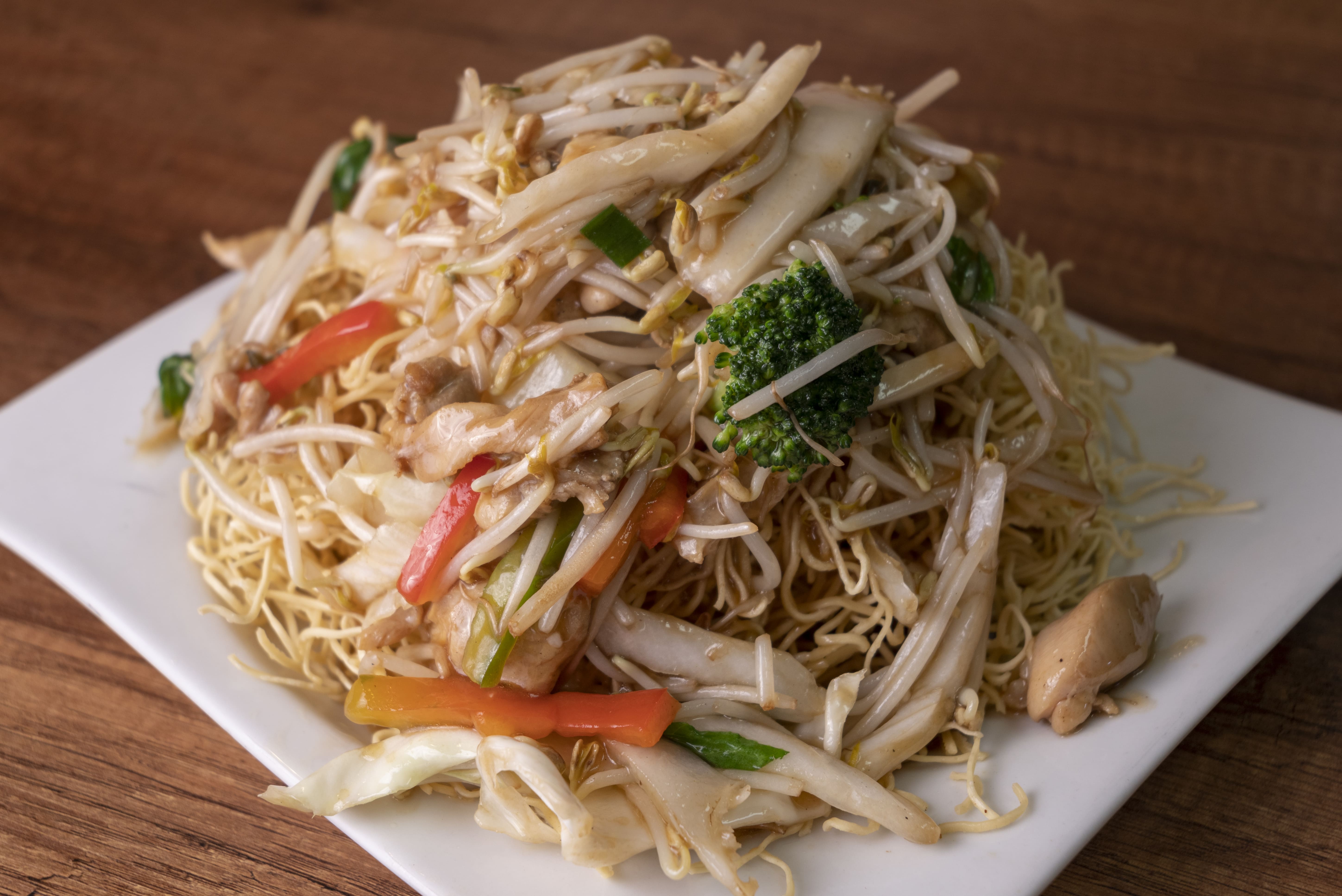 Fideos crocantes con pollo en salsa.