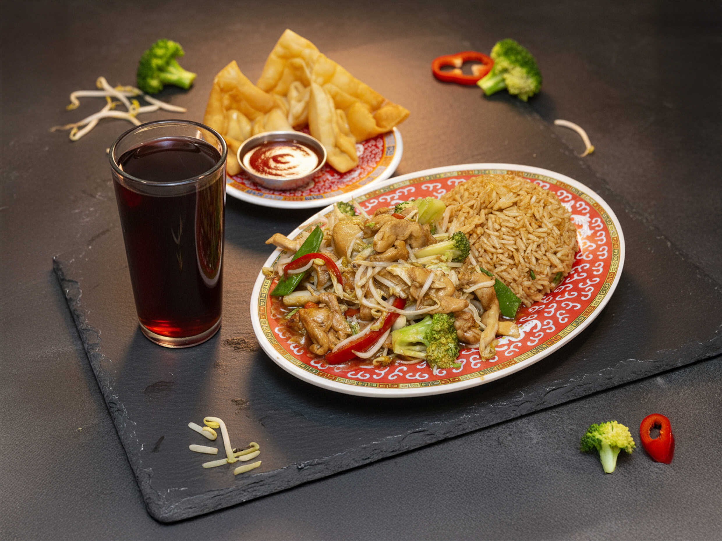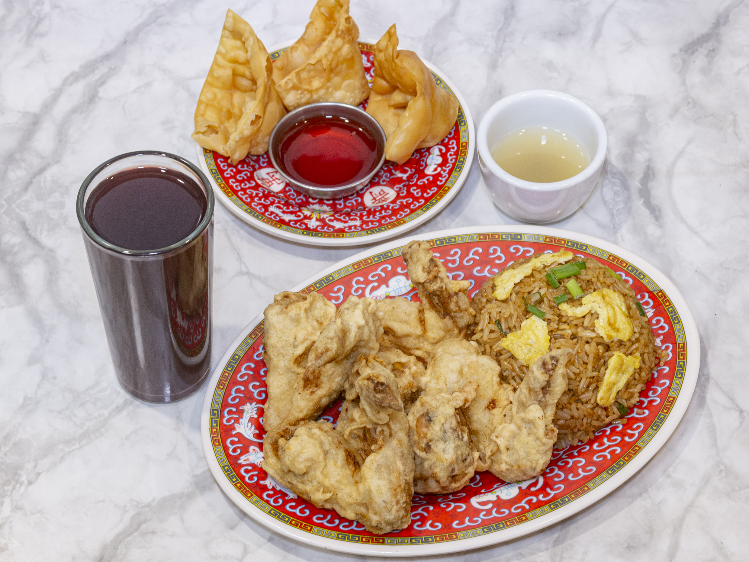 Combinado de Pollo acompañado de arroz chaufa y 3 Wantanes Fritos + Chicha 330 ml