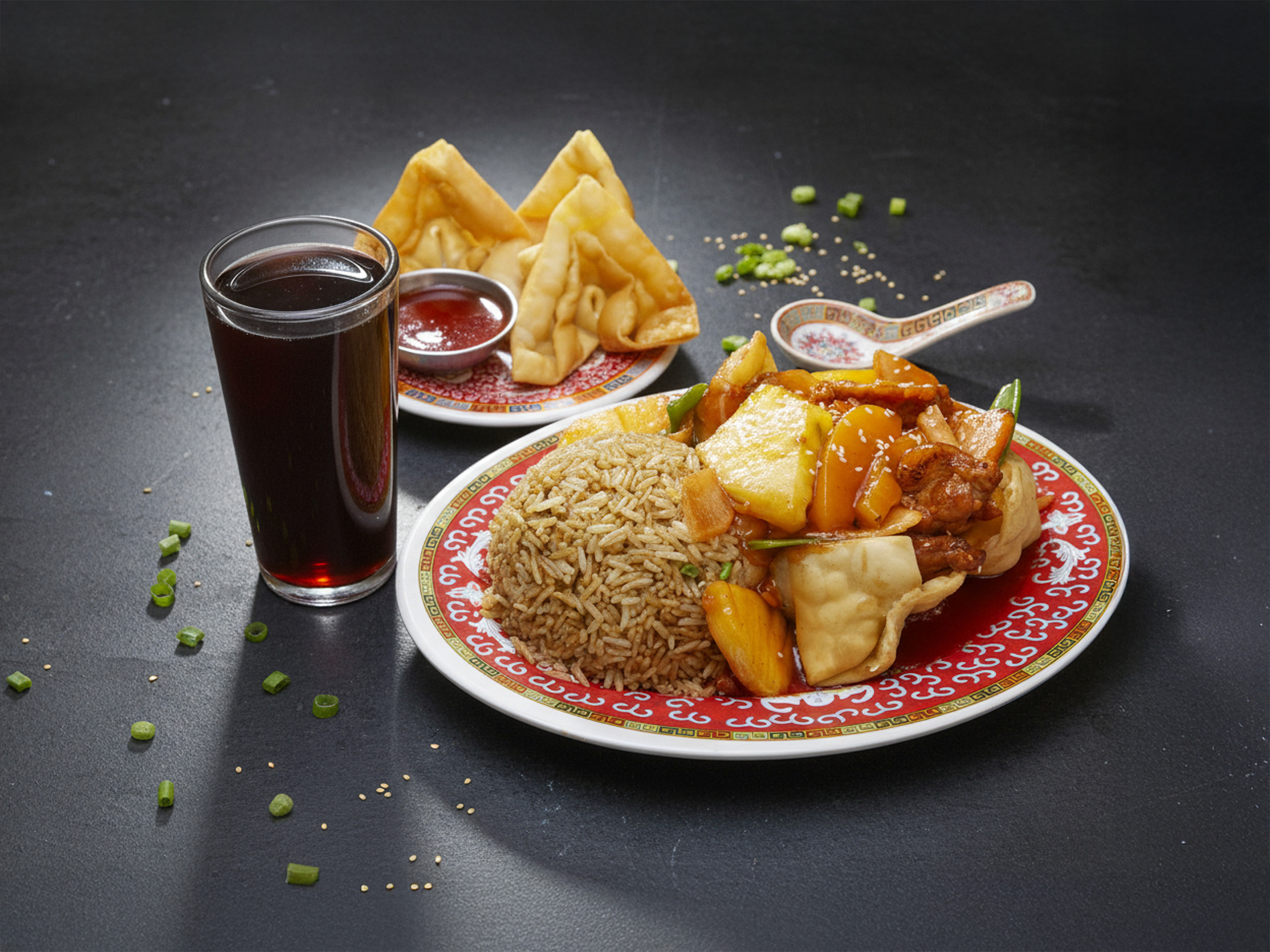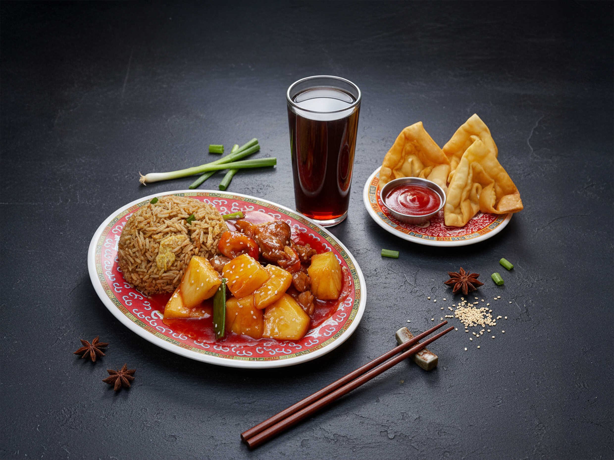 Pollo con Piña + Arroz Chaufa + Wanta (3 unidades) + Botella de chicha 330ml.