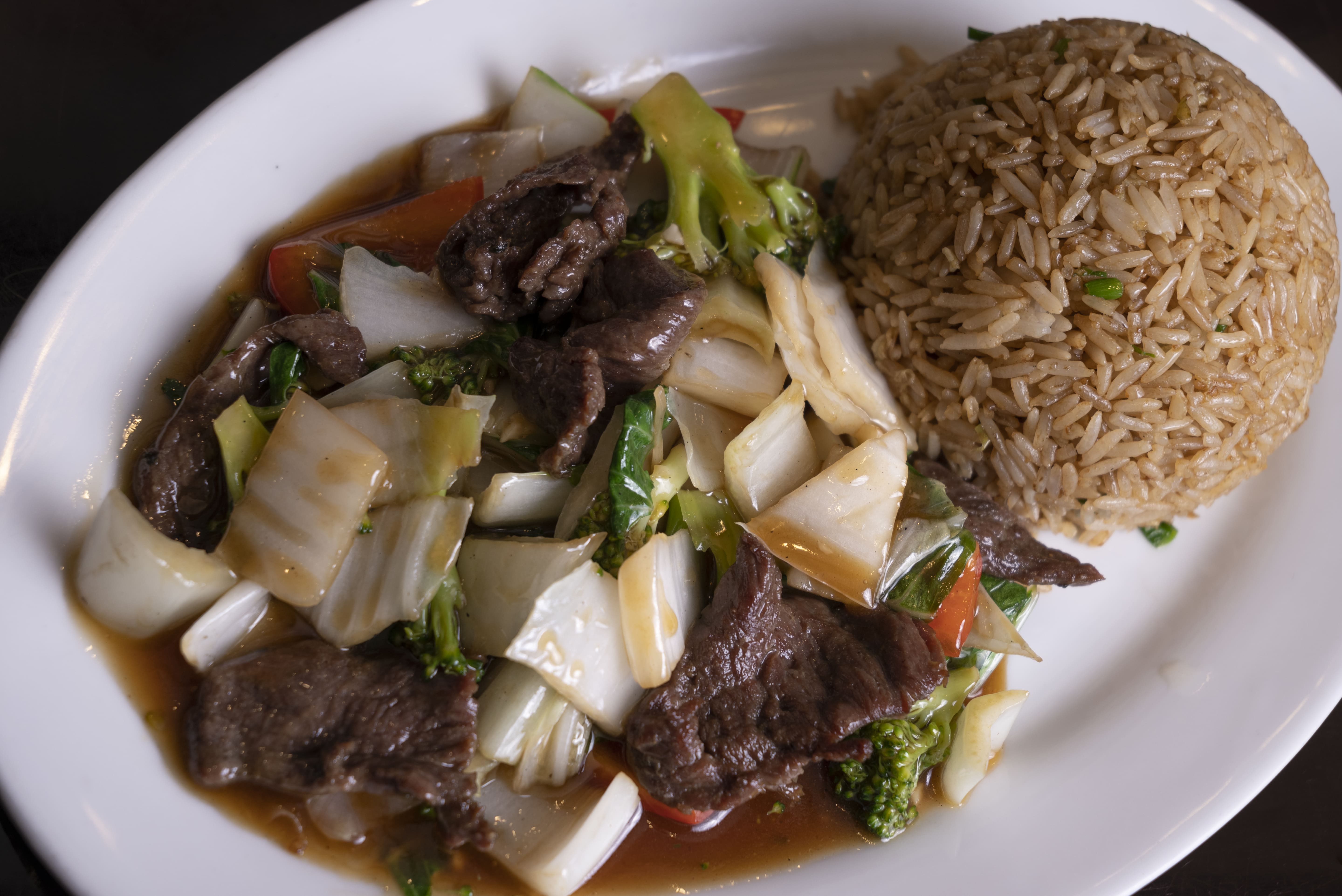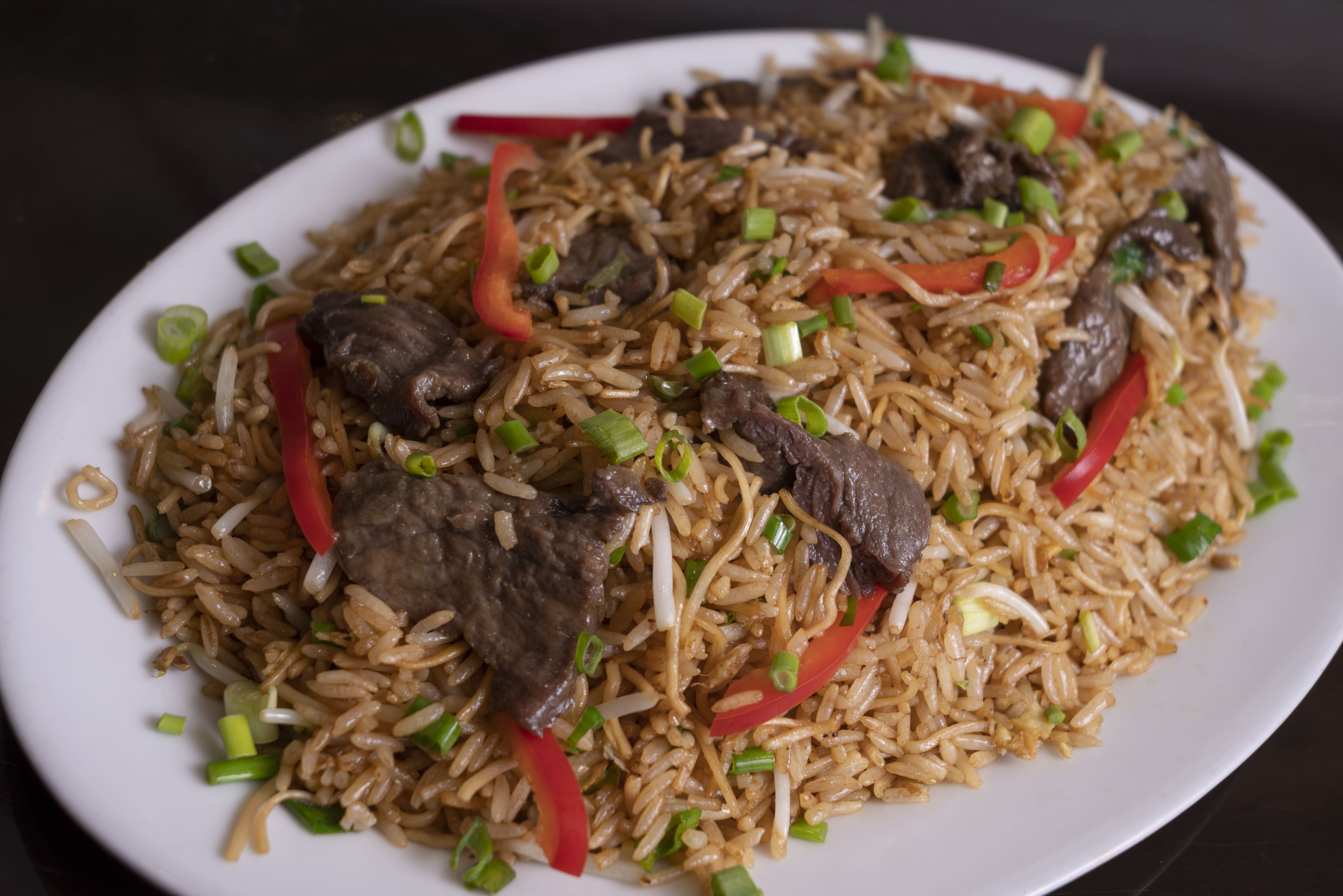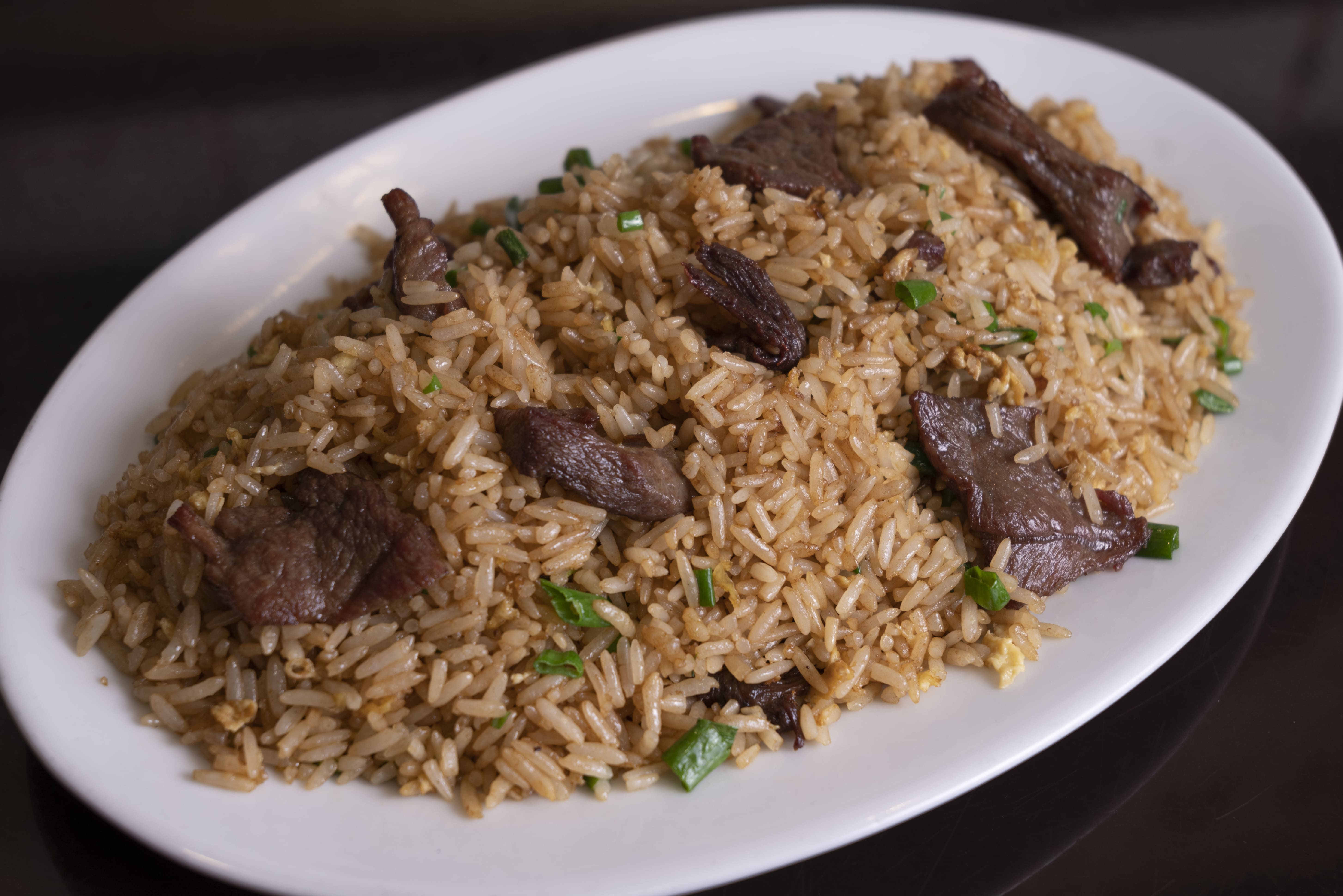 Arroz frito con carne de res.