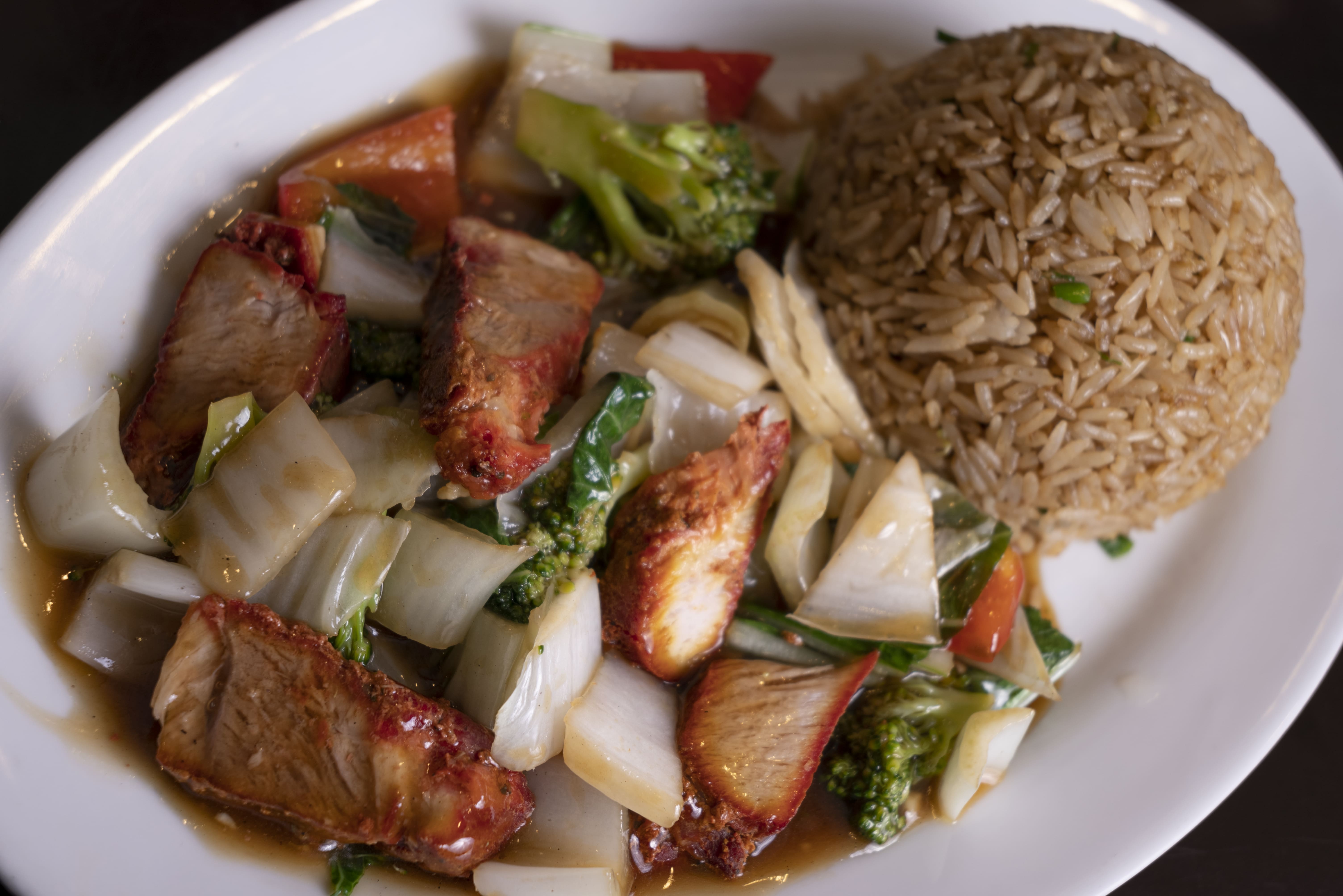 Cerdo con vegetales salteados.