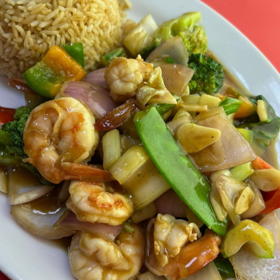 Langostinos con vegetales salteados.