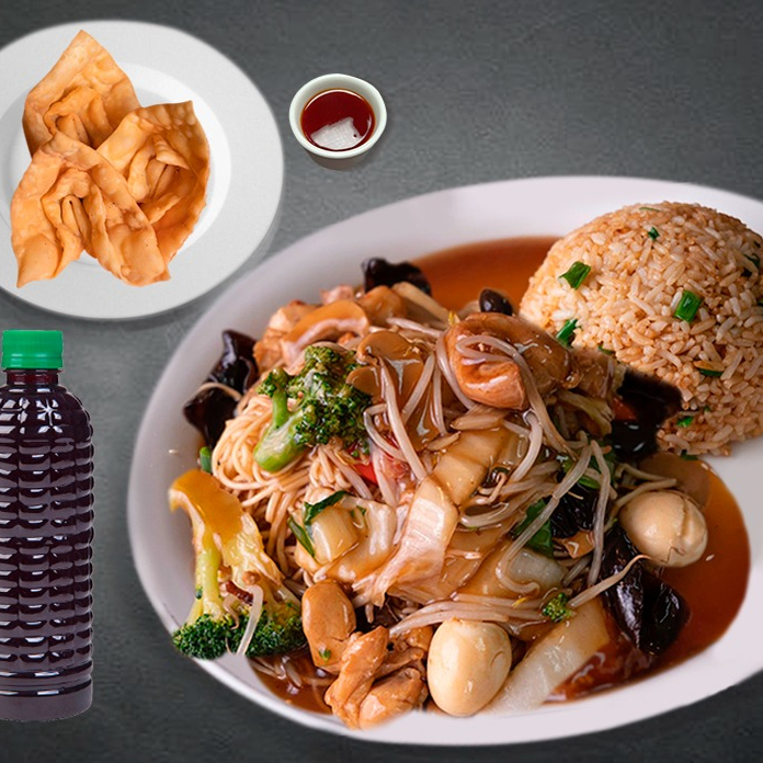 Tallarín con pollo, chancho, langostino, huevo de codorniz, wanyi y verduras, acompañado de arroz chaufa y 3 Wantanes Fritos + Chicha 330 ml