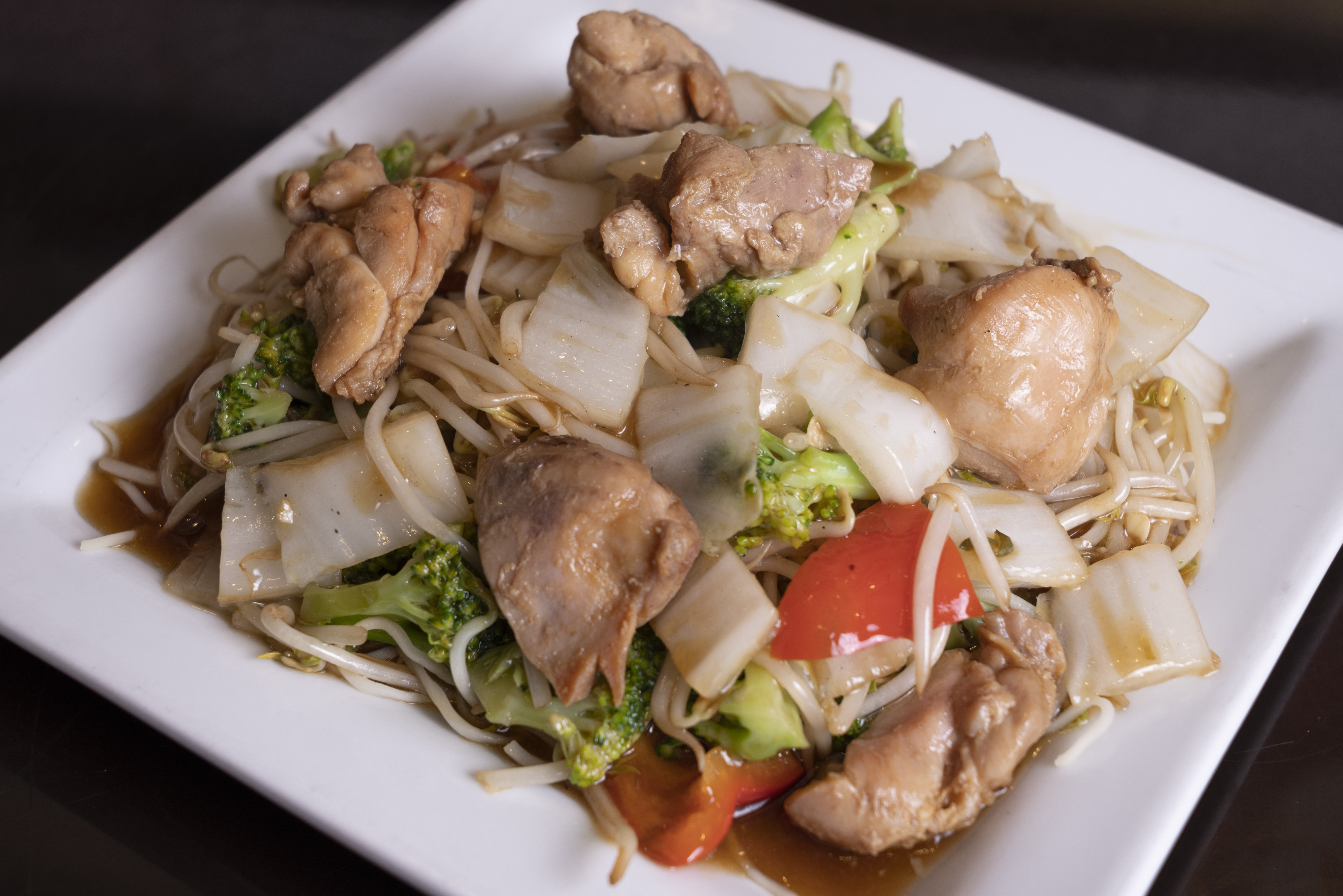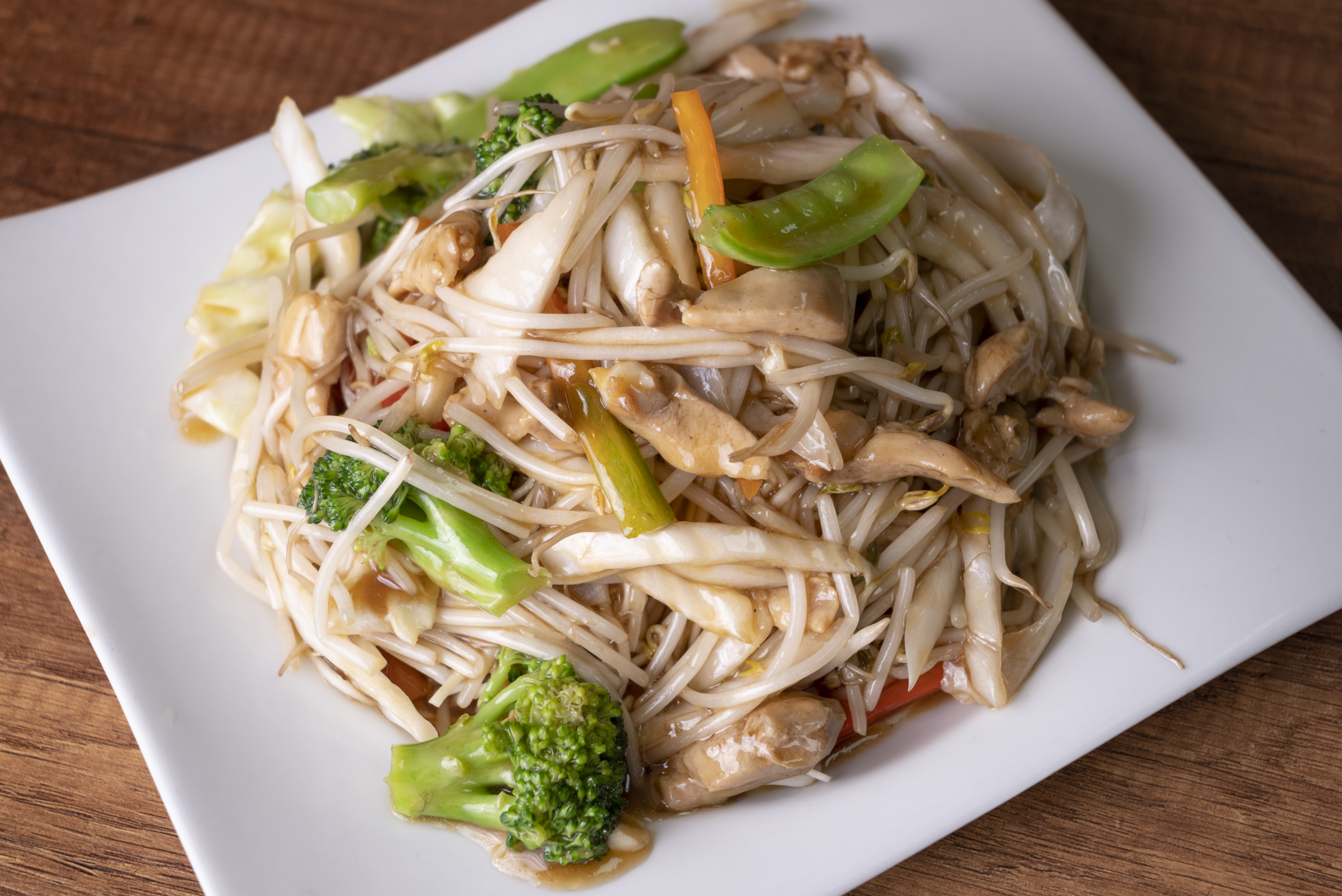 Fideos salteados con trozos de pollo.