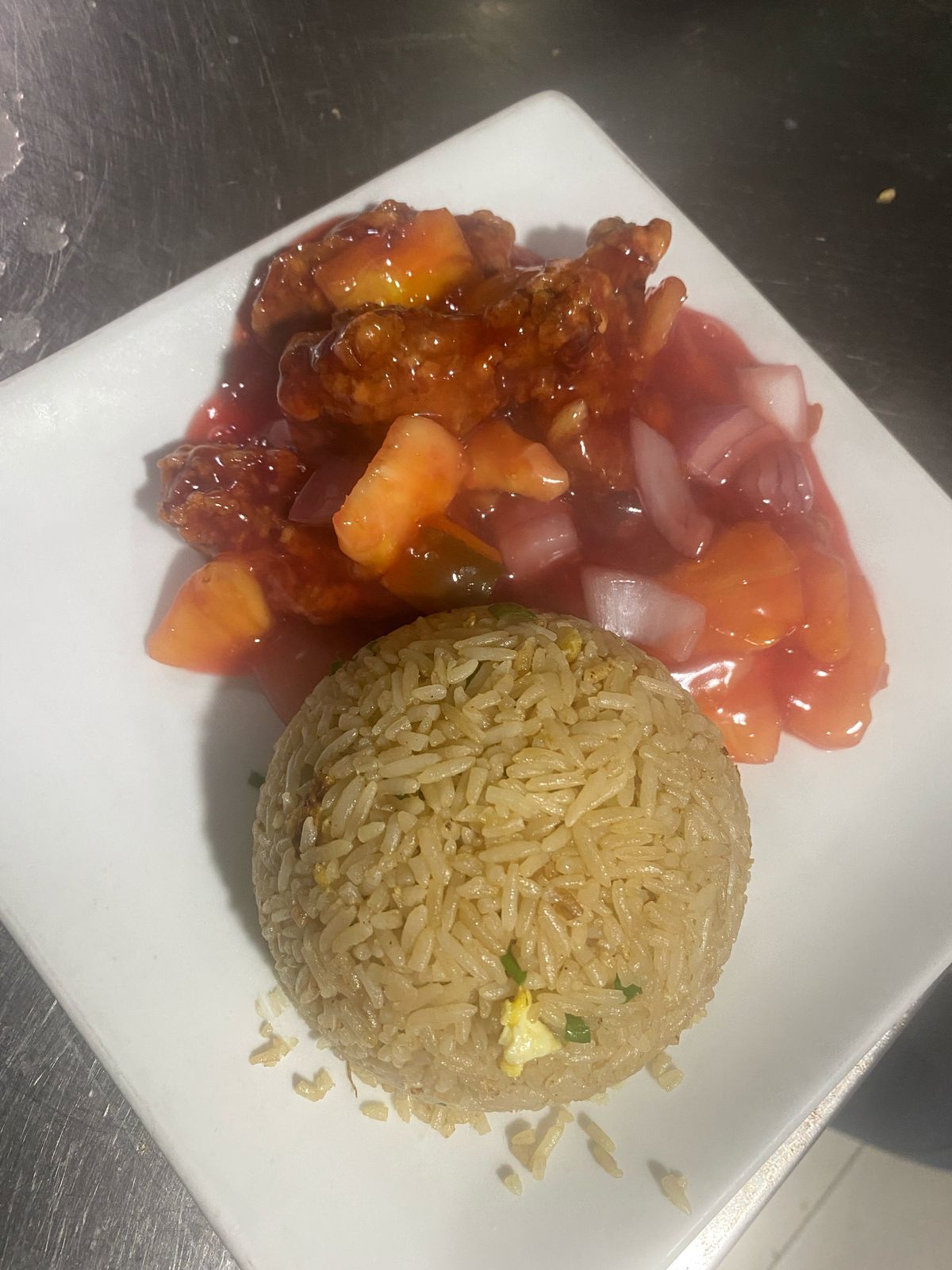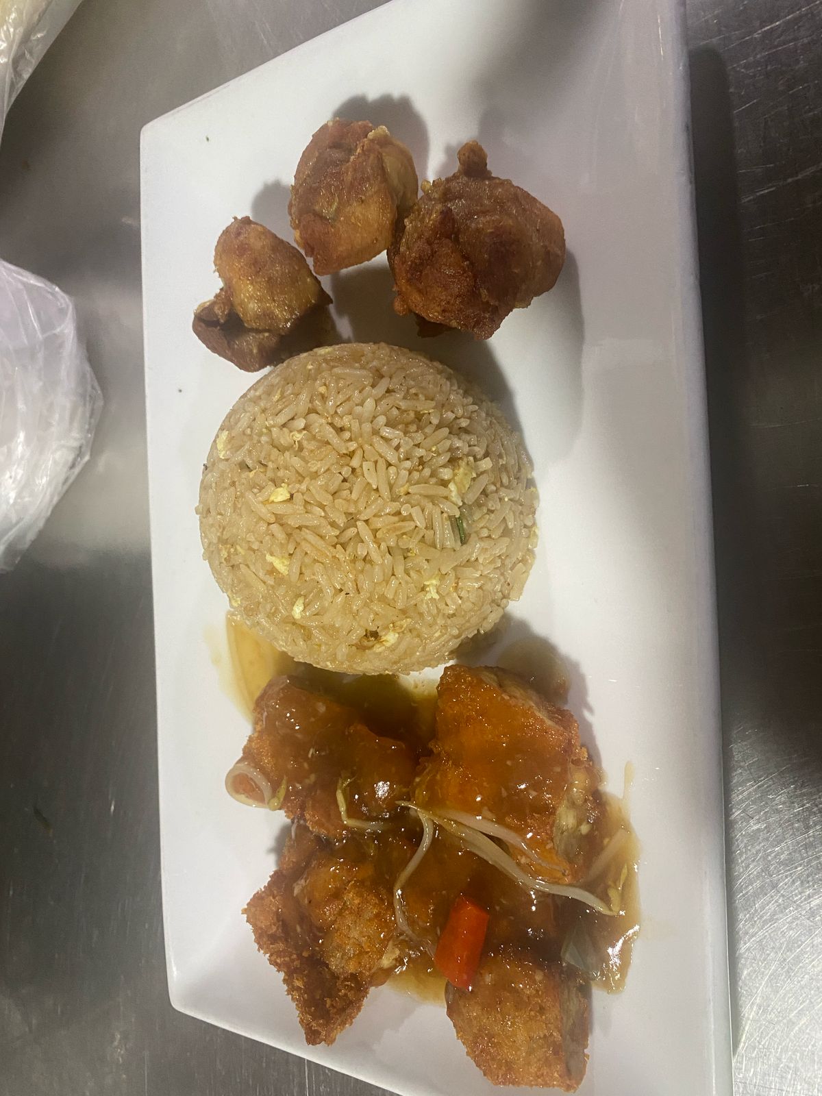 Pollo en trozos, arroz, huevo, pollo, sillao y cebolla china