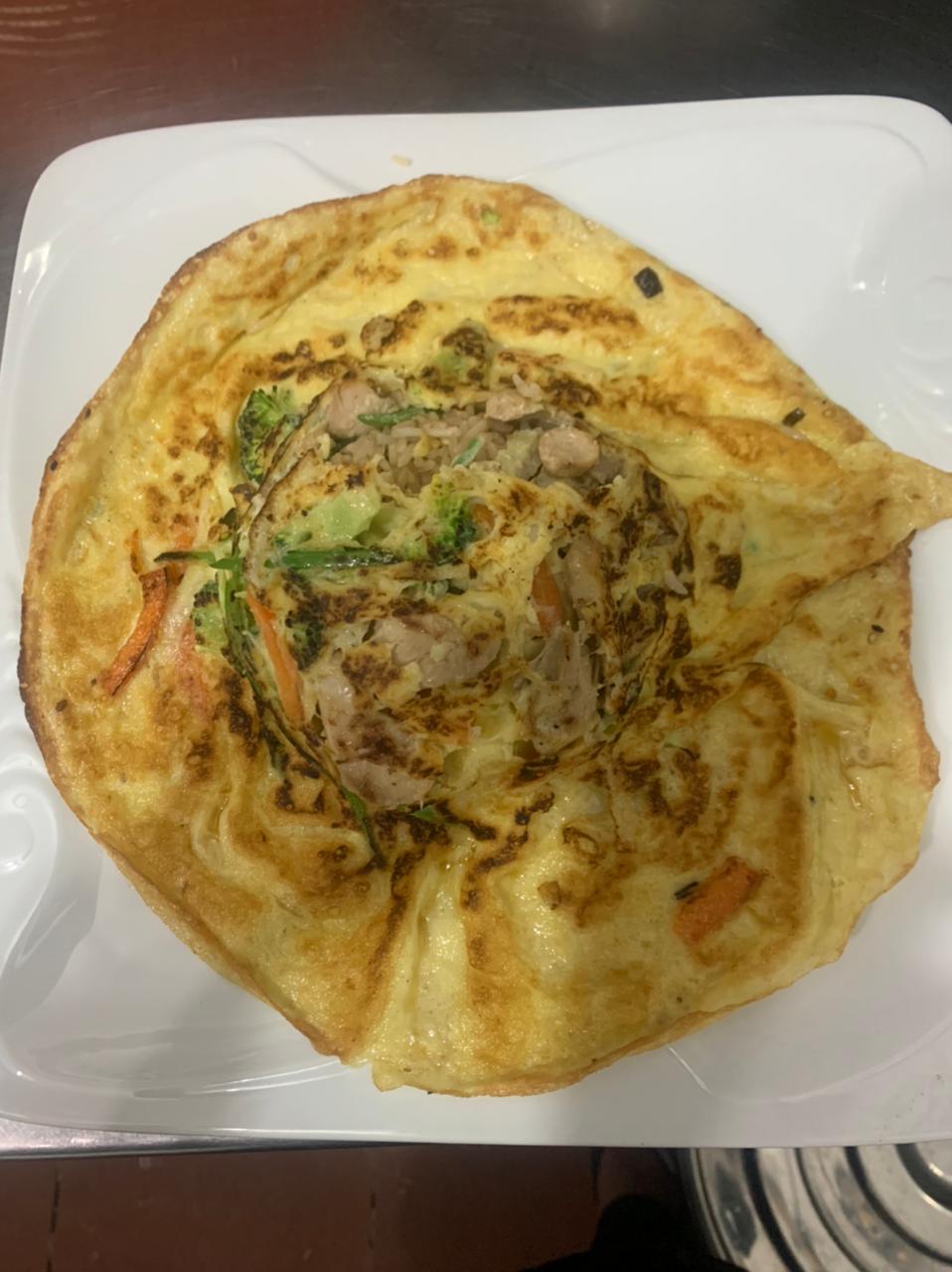 Arroz chaufa, huevo, verduras y pollo. Escoge tu entrada: wantán frito o sopa wantán.