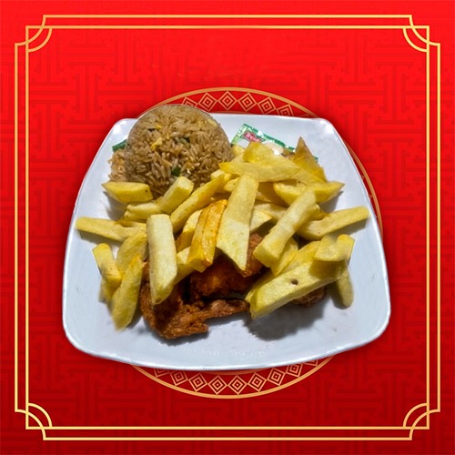 Alita, papas fritas, arroz, huevo, pollo, sillao y cebolla china. Escoge tu entrada: wantán frito o sopa wantán.