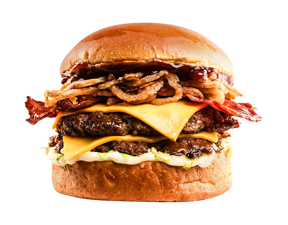 Hamburguesa con tocino ligeramente ahumado y crocante, queso americano gratinado, pickles, aros de cebolla empanizados, lechuga, tomate y BBQ. Servida con pickles y BBQ adicional. Servimos todas nuestras hamburguesas en termino 3/4.