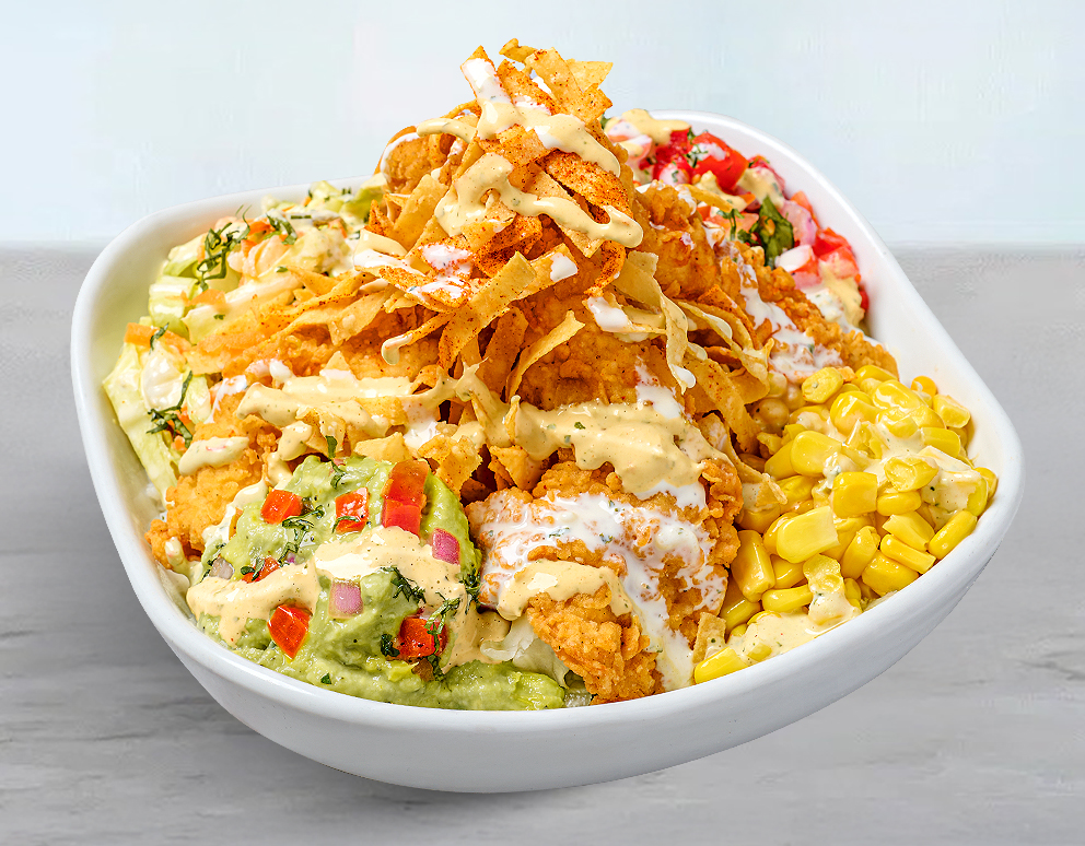 Tiras de pechuga empanizada, arroz, choclo americano, coleslaw, pico de gallo, guacamole, tiras de tortilla, salsa santa fe, ranch y culantro.