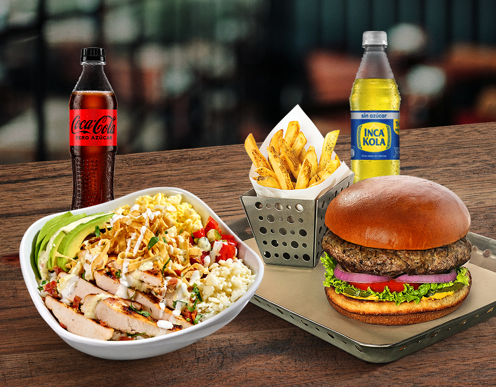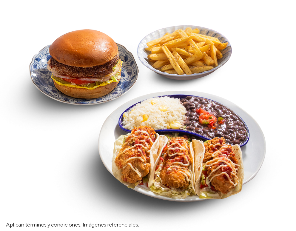 Elige 2 platos entre las opciones: Texas Tacos, Chicken Fajitas, Oldtimer Burger, Quesadillas, Wings (8und), Chicken Club Tacos, Chicken Basil Pasta o Crispy Chicken Fest.