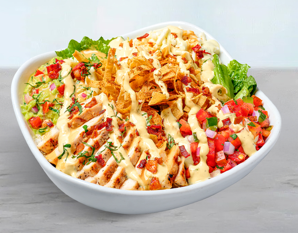 Bowl de arroz con pechuga de pollo, lechuga, guacamole, tiras de tortilla, pico de gallo y jack, citrus balsamic, avocado ranch, tocino y culantro.