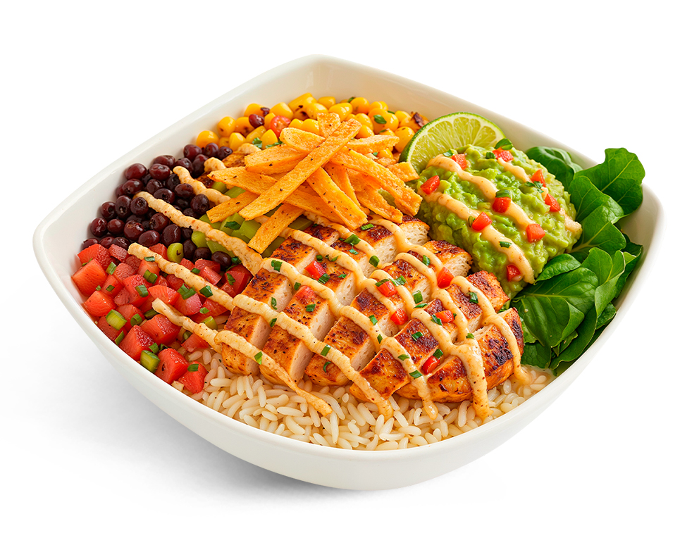Un bowl con pollo al estilo margarita, arroz, lechuga, salsa casera de choclo, frejoles negros, pico de gallo, tiras de tortilla, guacamole y culantro.