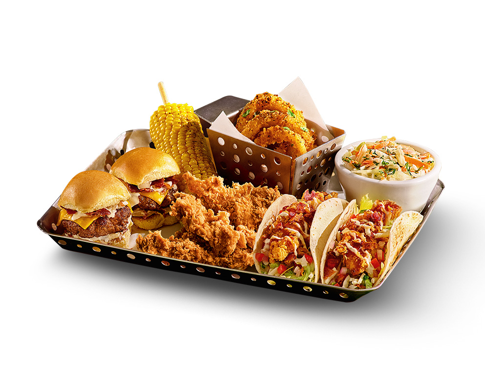 Comparte 2 burger bites, 2 Crispy Chicken Tacos, Onion Rings, Coleslaw, Cobb y Crispy Chicken Crispers.