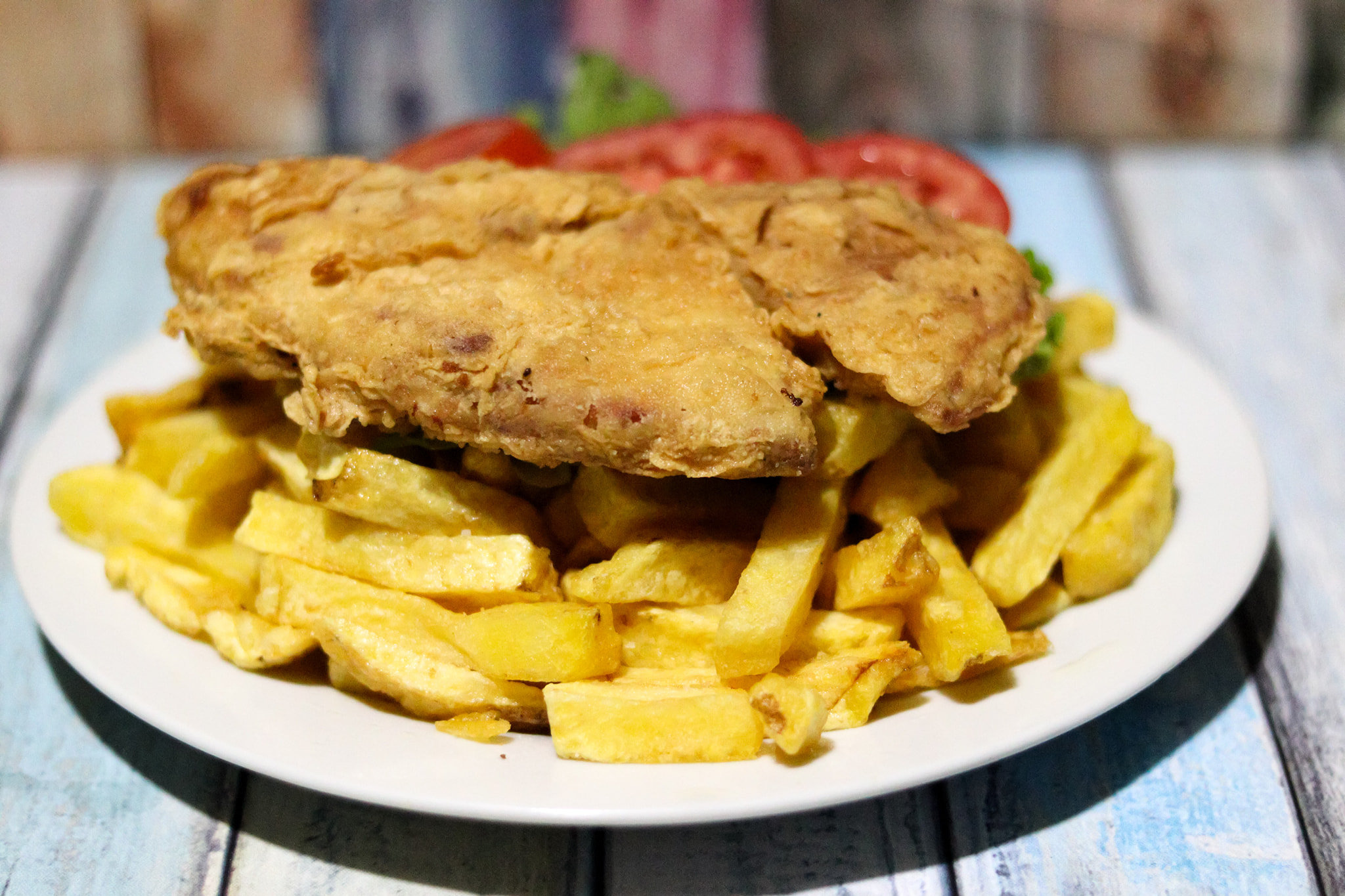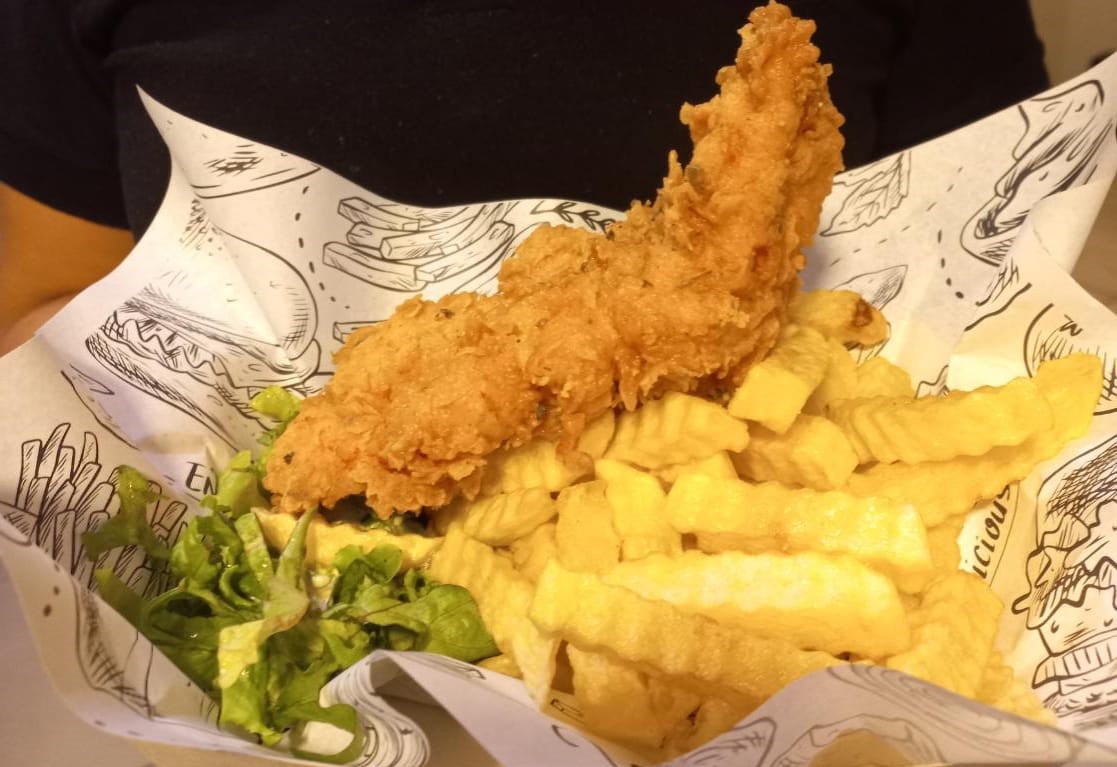 Pecho de pollo crocante, papas fritas y ensalada de lechuga.