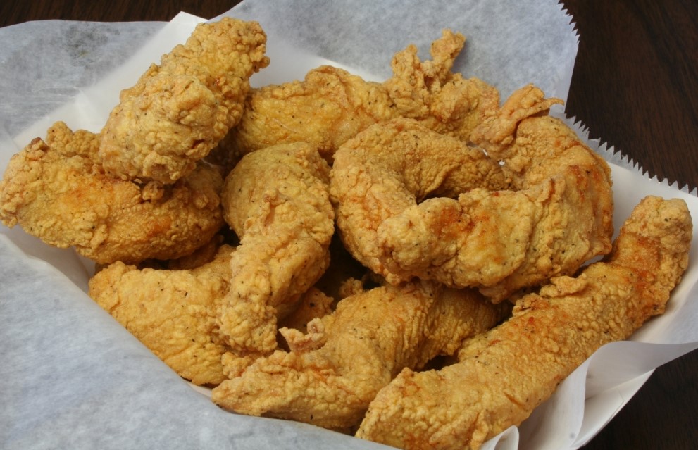 Alita de pollo crocante, papas fritas y ensalada de lechuga.