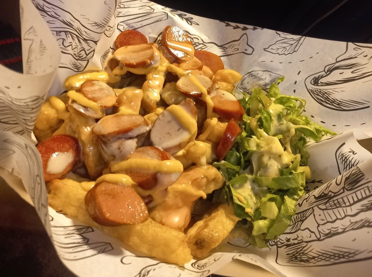 Papas crocantes, hot dog, chorizo y ensalada de lechuga.